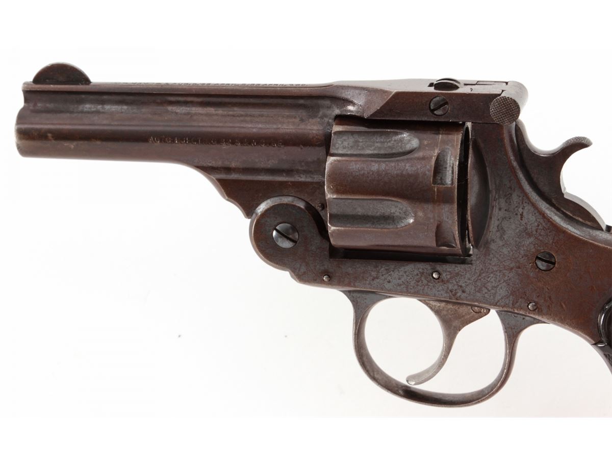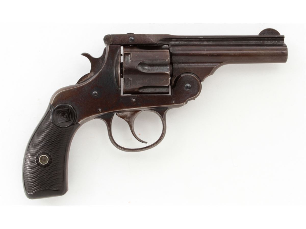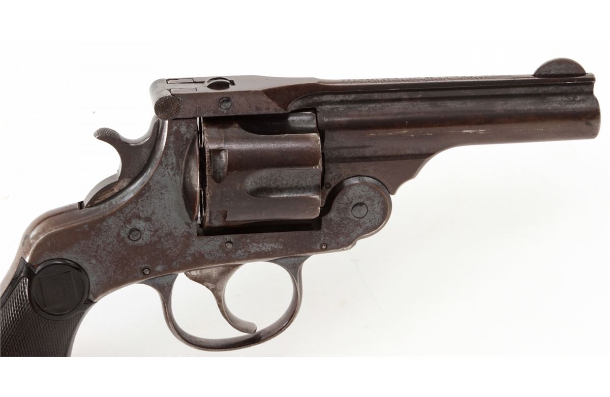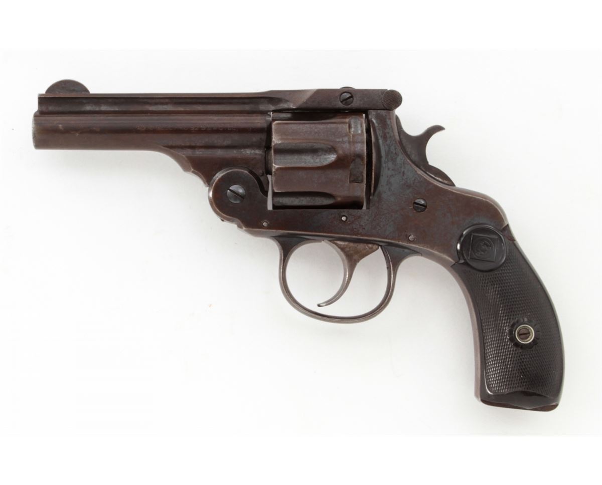 H&R Top-Break Double Action Revolver, #181603, .32 S&W cal., 3-1/4'' barrel, blue finish, factory checkered bullseye black hard rubber grips. Mfg'd 1905. Condition is good retaining approx. 30% toning blue. Grips with moderate flattening and losses at butt to left panel. Good double action, no single action, good bore. Est.: $100-$200. (C&R/PPT)