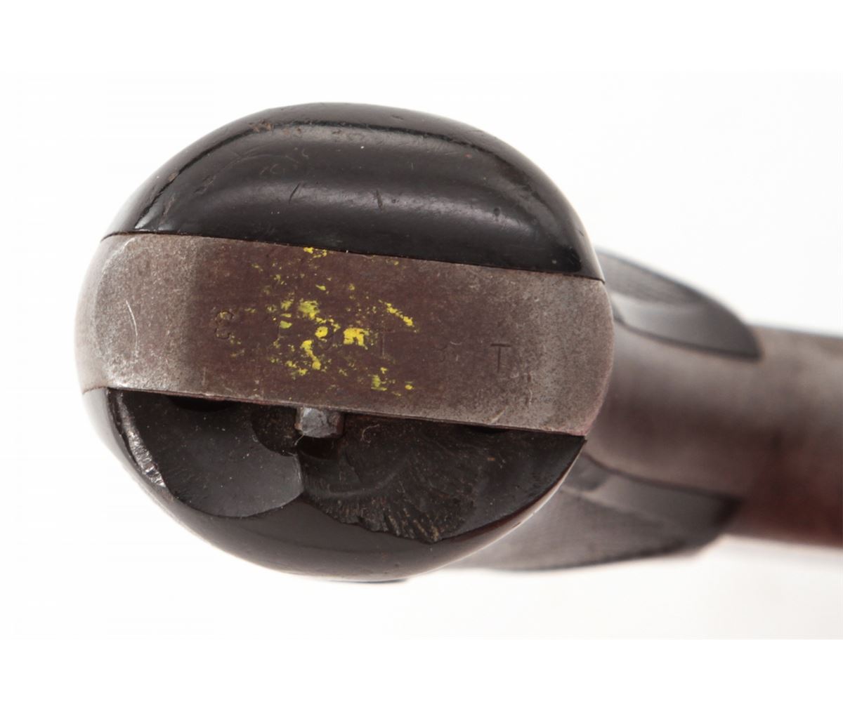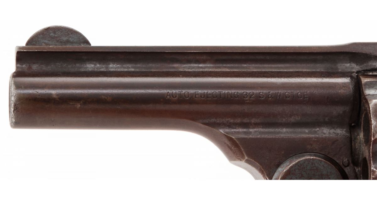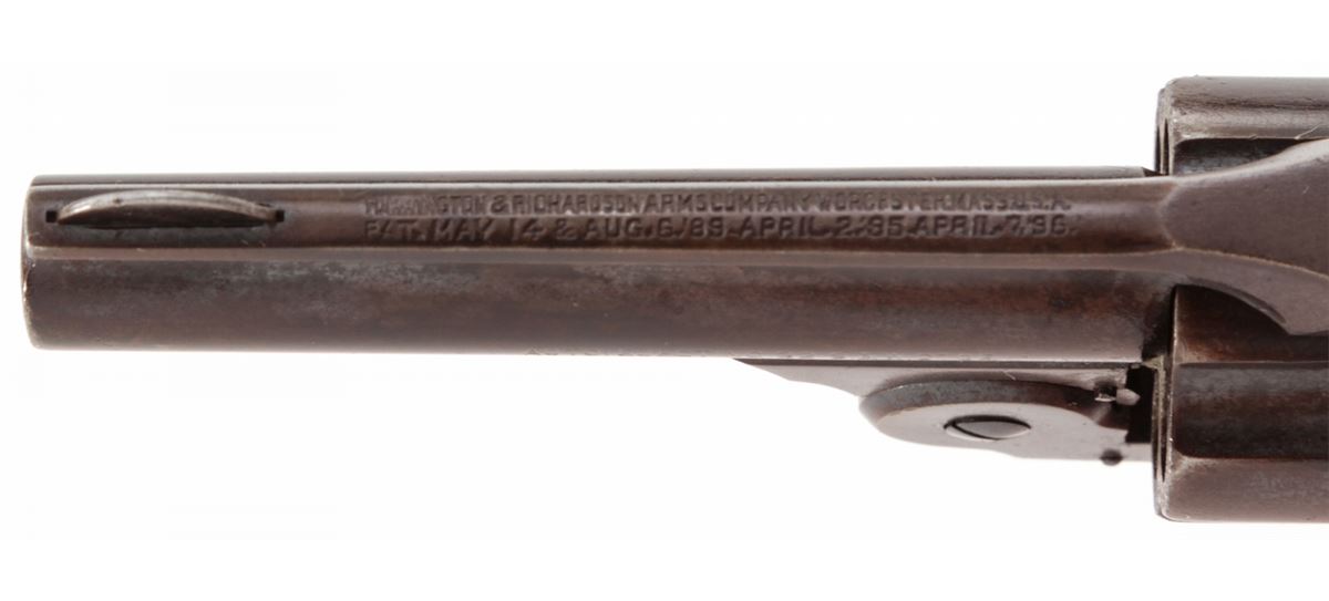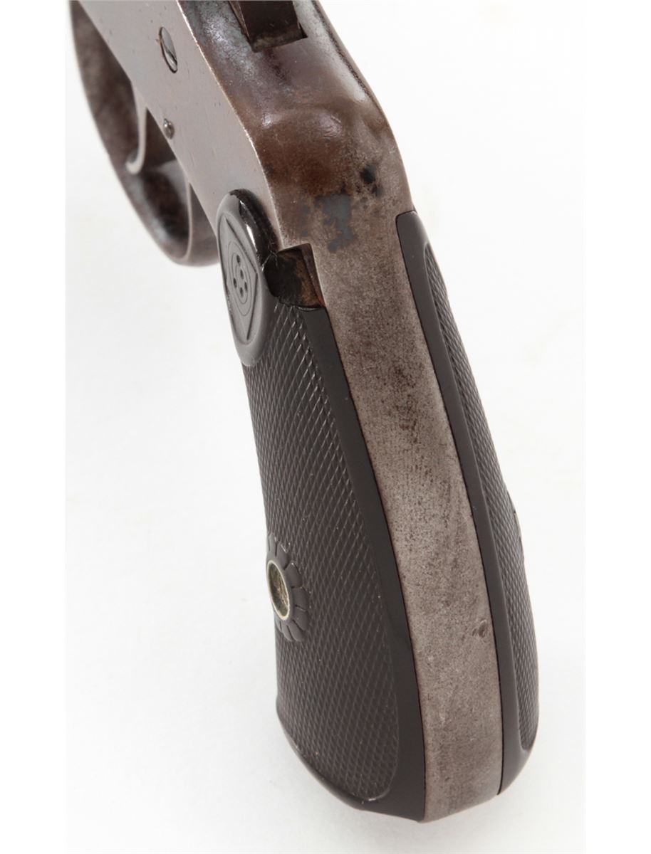H&R Top-Break Double Action Revolver, #181603, .32 S&W cal., 3-1/4'' barrel, blue finish, factory checkered bullseye black hard rubber grips. Mfg'd 1905. Condition is good retaining approx. 30% toning blue. Grips with moderate flattening and losses at butt to left panel. Good double action, no single action, good bore. Est.: $100-$200. (C&R/PPT)