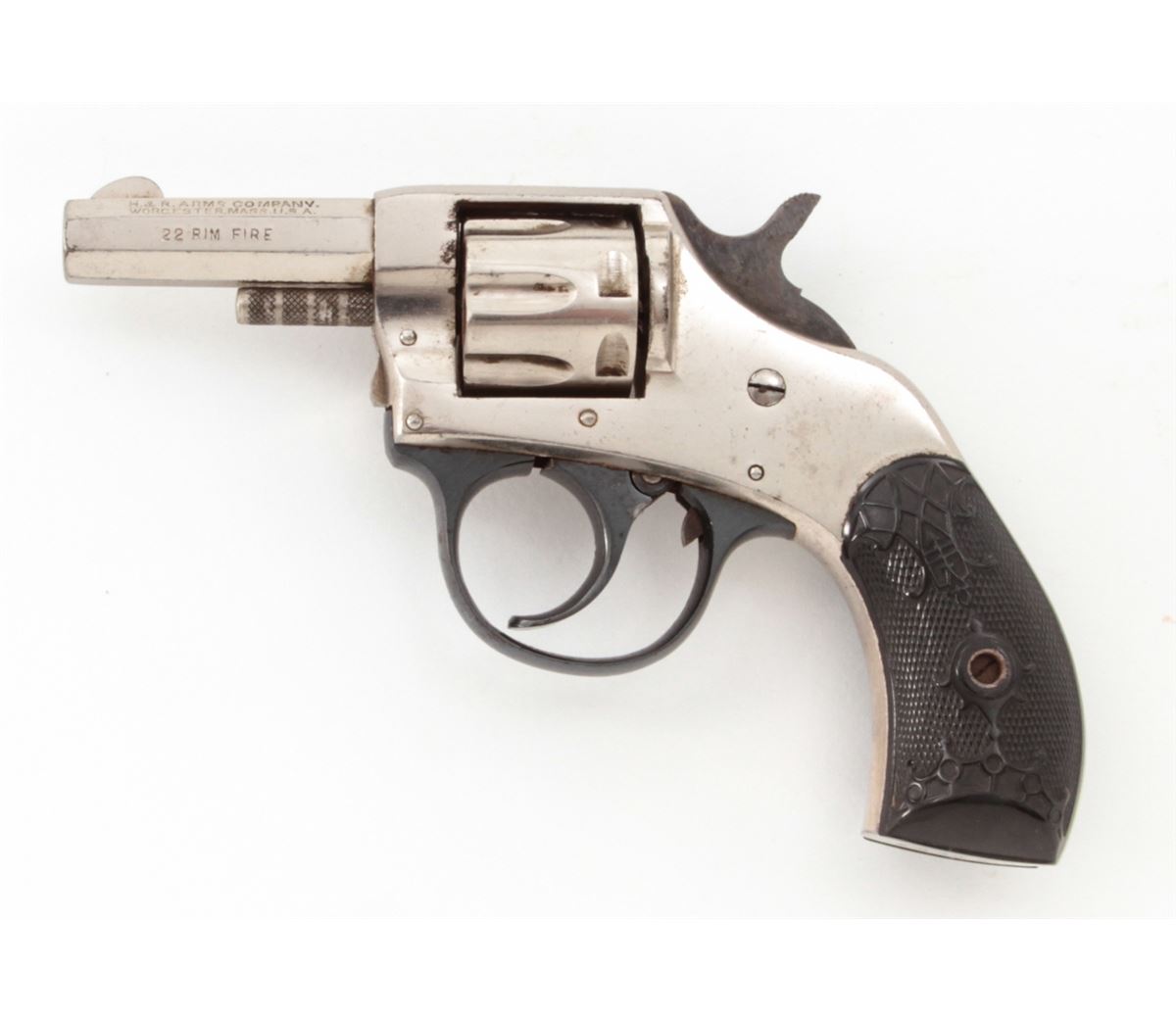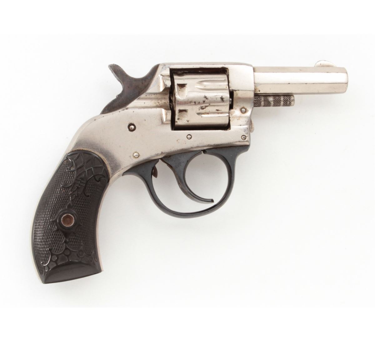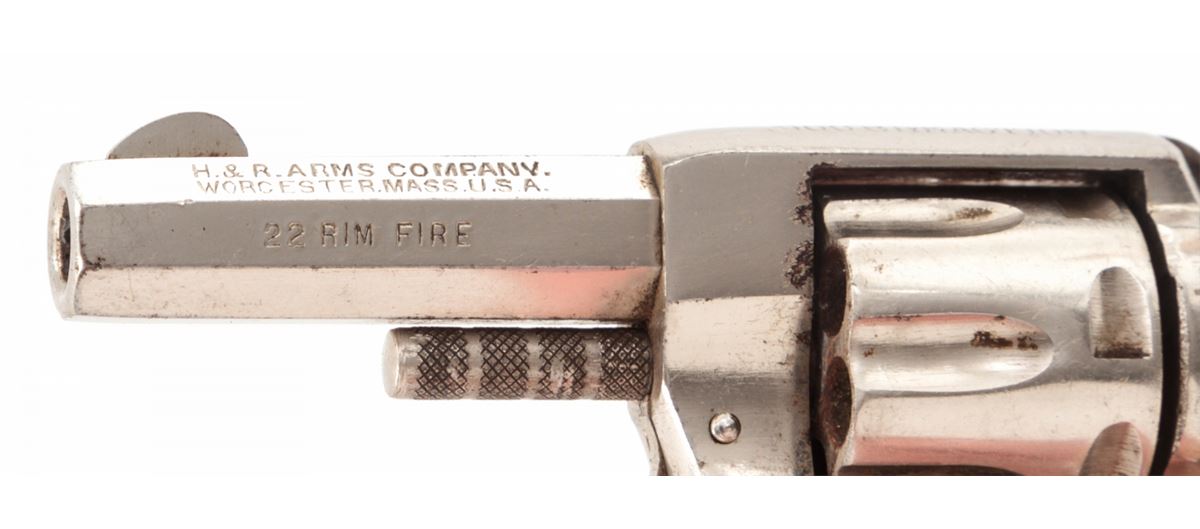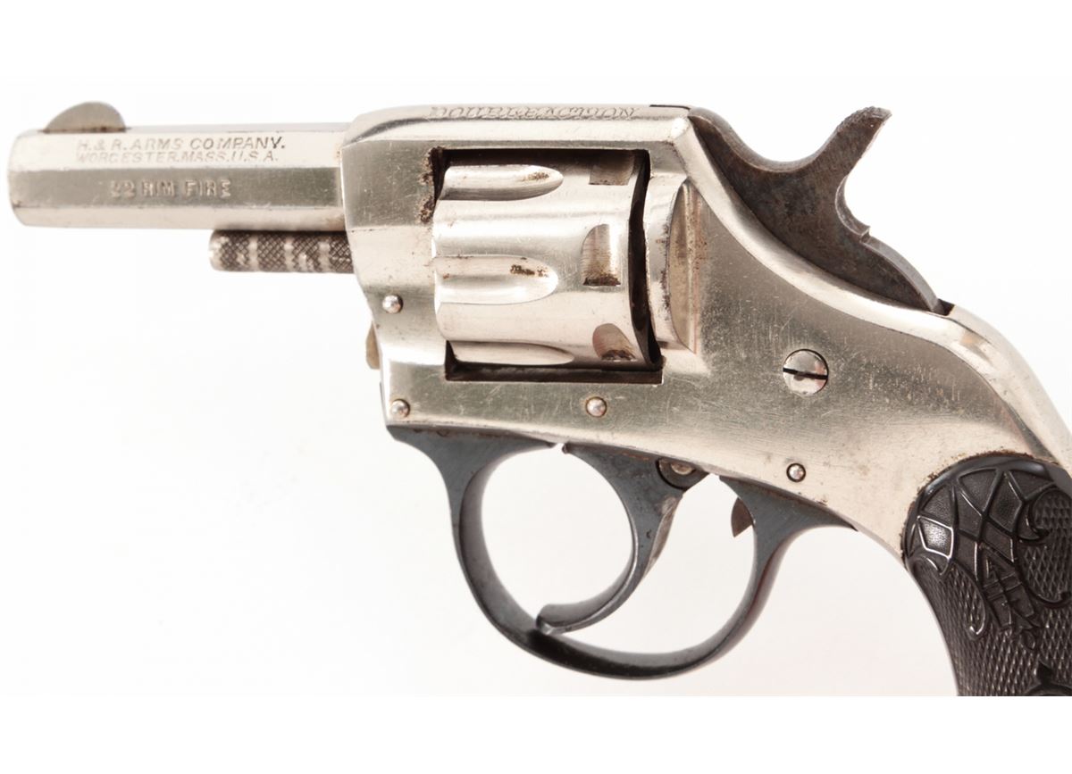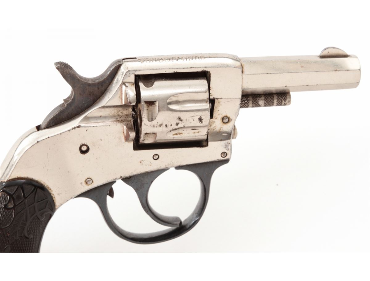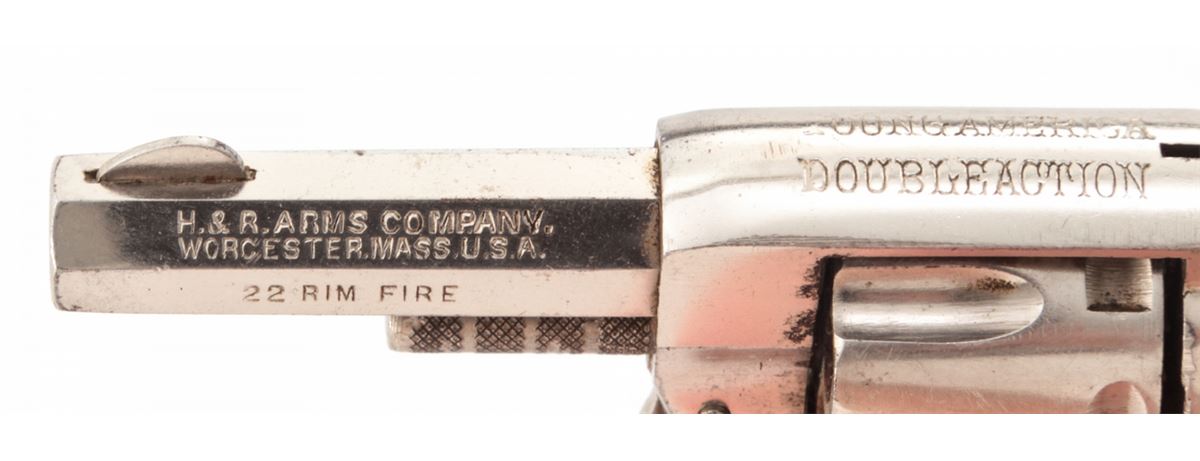 H&R Young America Double Action Revolver, #325230, .22 RF cal., 2'' barrel, nickel finish, hard rubber grips. Condition is excellent retaining approx. 96% original nickel. Good grips and action, good bore with mild corrosion. Est.: $75-$150. (C&R/PPT)