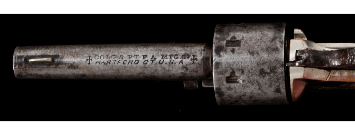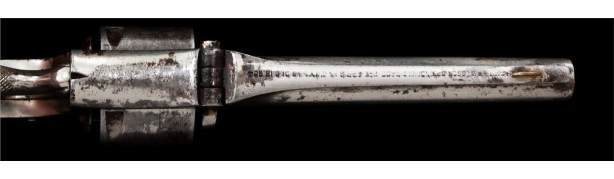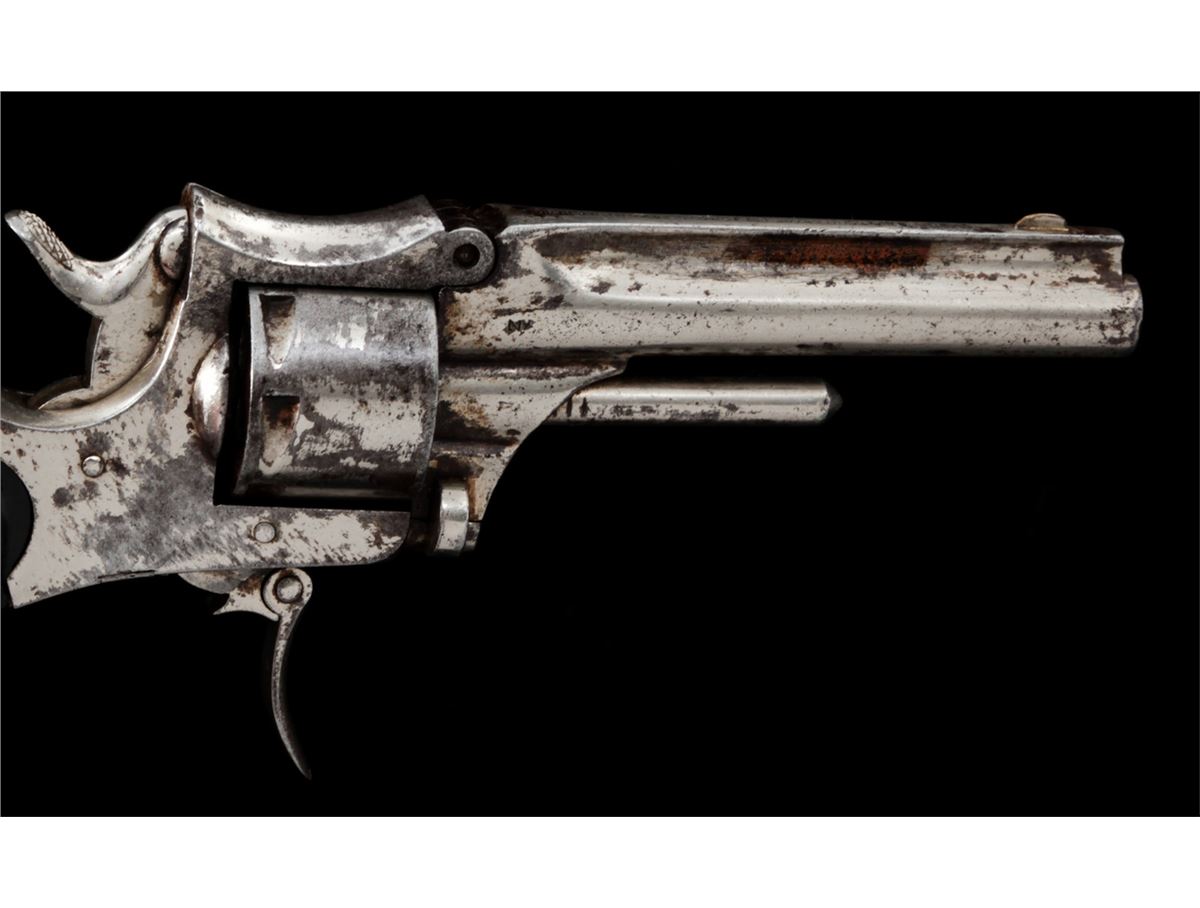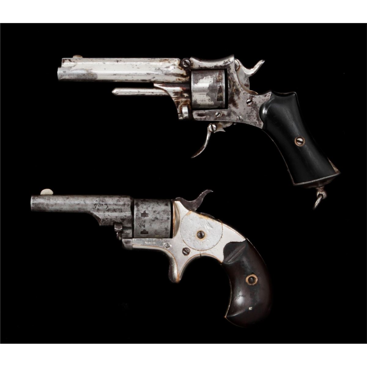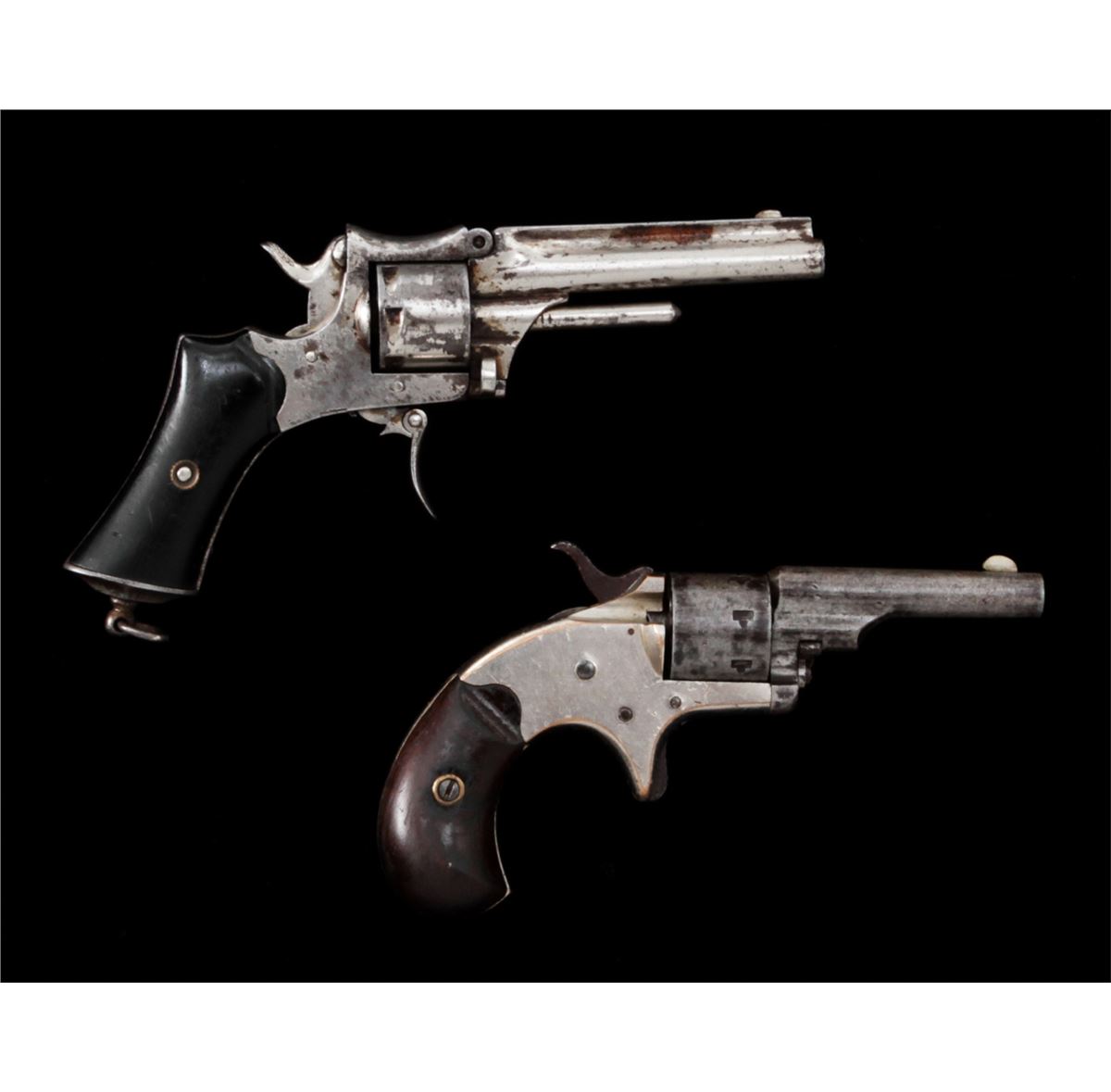 Lot of Two (2) Antique Small Frame Revolvers: (1) Colt New Line, #93283, .22 RF cal., 2-3/8'' barrel, nickel finish, bird's head grips. Condition is fair to good. Barrel and cylinder have been cleaned and show a near even gray patina. Nickel-plated brass frame retains 90% finish with moderate knackering to sideplate. Grips show 60% original varnish with scuffs and dings. Action needs work, bore is dark. (2) Belgian Folding Trigger Double Action Revolver, NVSN, 5mm RF cal., 3-1/8'' barrel, with faux S&W barrel address to top rib, nickel plated, rosewood grips. Condition is good retaining approx 40%-50% nickel. Grips with oil darkening and one small loss to left panel near butt. Action functions well, trigger return spring works intermittently, dark bore. Est.: $125-$250/lot. (Antique)