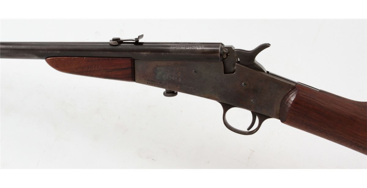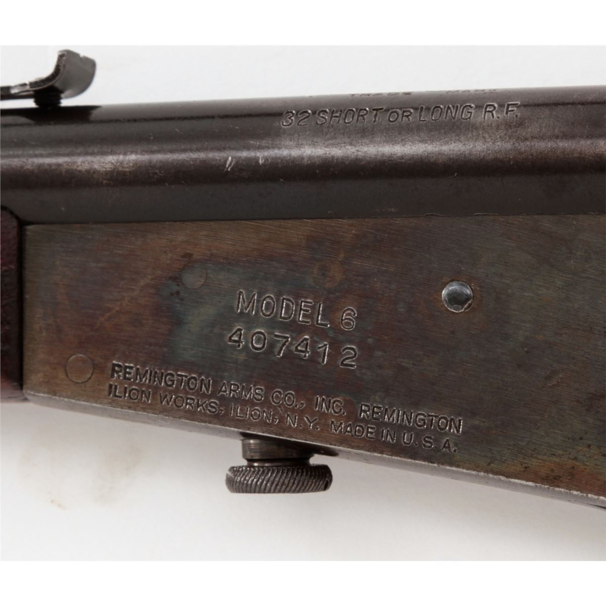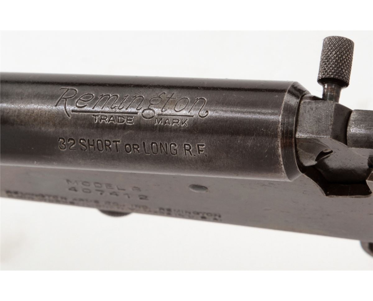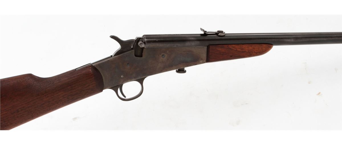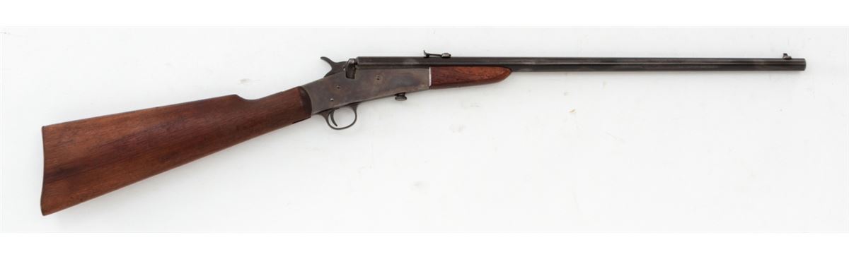 Remington Model 6 Falling Block Rifle, #407412, .32 Short or Long RF cal., 20'' blue barrel, case hardened frame, walnut stock and handguard. Condition is excellent. Barrel retains approx. 92% blue with small losses as thinning. Frame with 96% vivid case hues. Stock with light scuffs and dings and oil staining near buttplate. Good action, fine bore. Est.: $350-$500. (C&R)