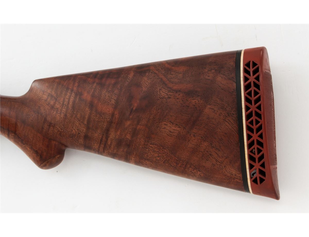 A. H. Fox Sterlingworth Side-by-Side Shotgun, #64111, 12 ga., 2-3/4'' chs., bright blue finish, 30'' barrels with concave matted rib and silver front bead, choked Full/IM., extractor, double triggers, manual sliding top tang safety. Restocked with figured American walnut in satin finish with round knob uncheckered buttstock having a length of pull of 14-1/2'' over a 1'' red ventilated Mershon recoil pad, retaining the original revarnished splinter forend. Mfg'd ca. 1912. Mechanically fair, barrels are tight on the face, bores are bright, evidence of frequent use with triggers loosening in the action. Barrels and frame assembly with 98% reblue over scattered light pitting. Est.: $500-$700. (C&R)