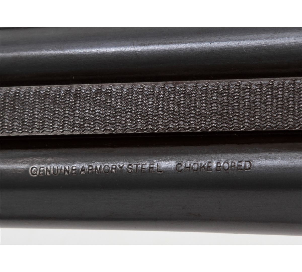 Hartford Arms Exposed Hammer Side-by-Side Shotgun, #158360, 12 ga., 30'' game rib barrel choked Full/Ex. Full, case hardened frame, checkered hardwood stock and splinter forend. Top of barrel marked ''Genuine Armory Steel Choke Bored''. Condition is good as refinished. Stock with light scuffs and moderate impressions. Shotgun has had spacers added beneath the barrel to tighten the action. Bores are very good. Est.: $250-$400. (C&R)