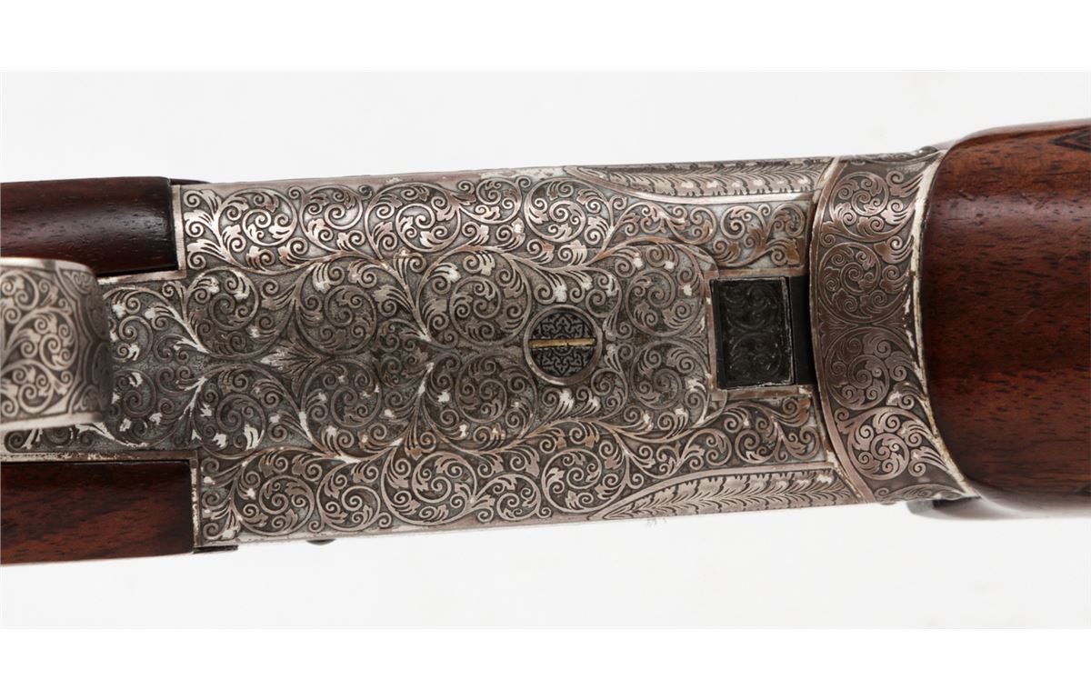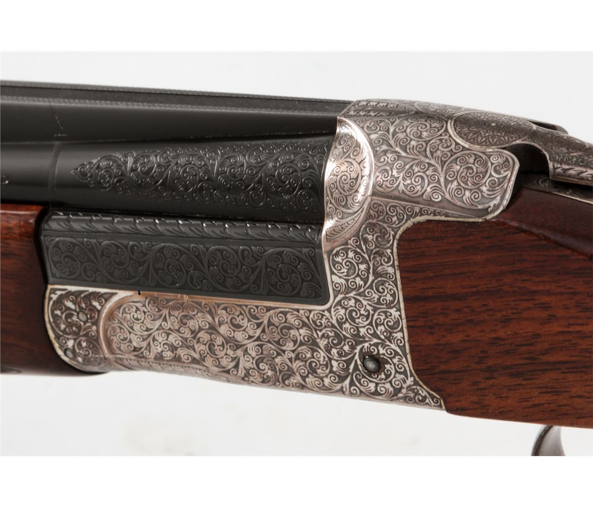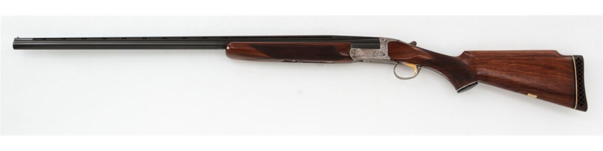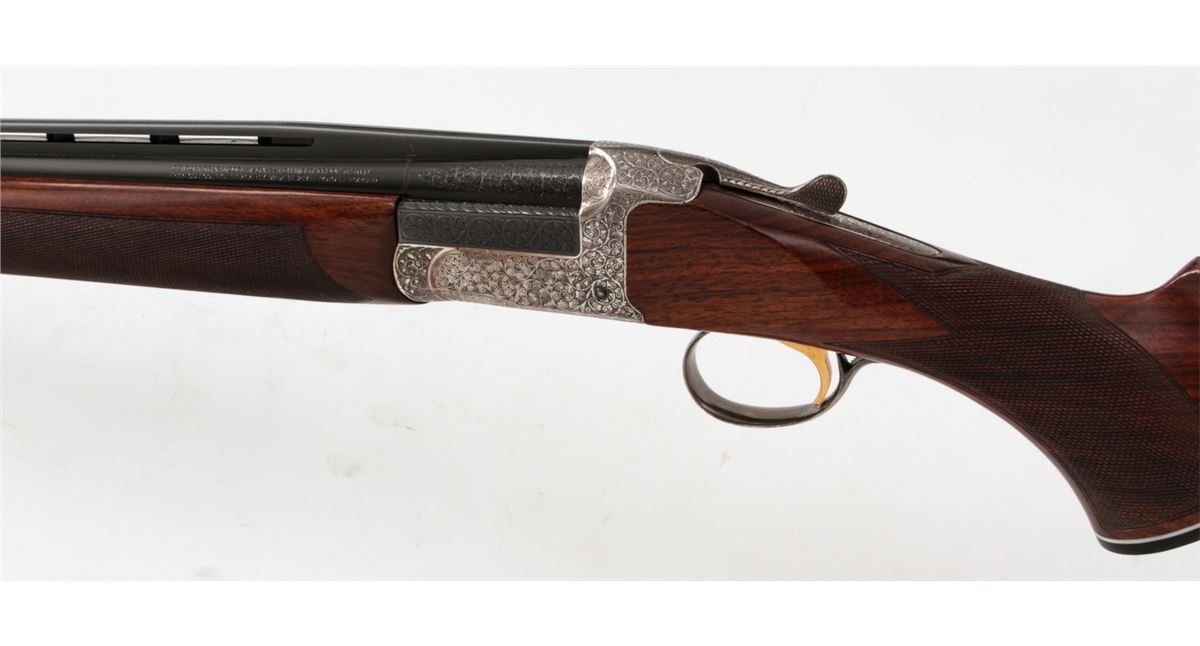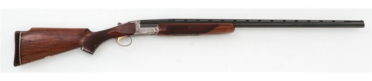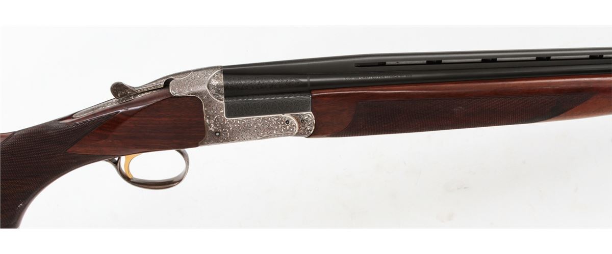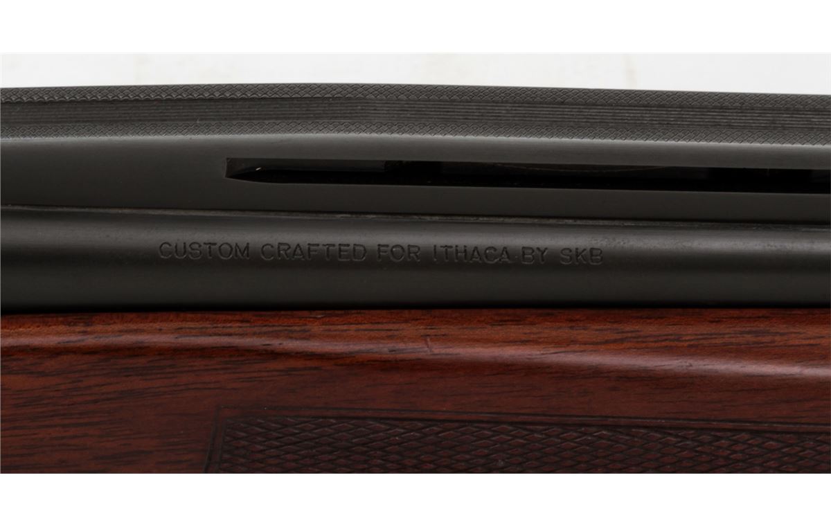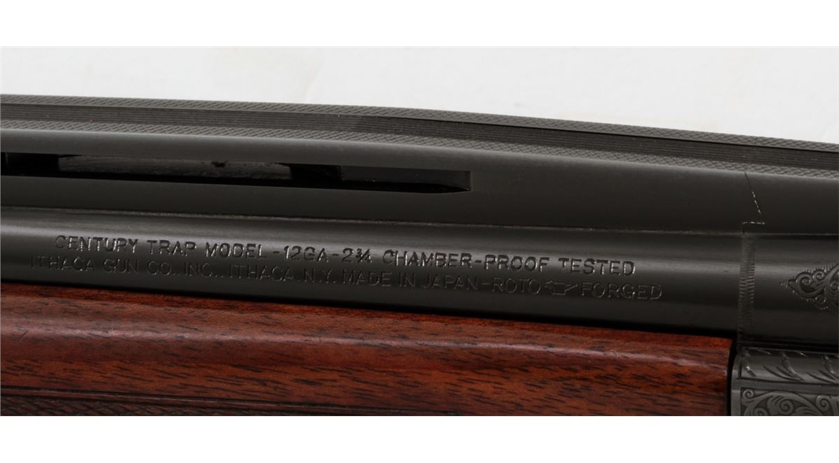 Ithaca-SKB Century Trap II Single Barrel Shotgun, #S8803543, 12 ga., 2-3/4'', blue finish 32'' barrel with matted ventilated rib, white front and silver middle beads, Full choke, gold-plated trigger, no safety, silver-plated frame with etched scroll engraving, straight grain American walnut Monte Carlo stock with target forend, silver initial escutcheon on toe line, length of pull 14-1/4'' over a 1'' brown Ithaca ventilated recoil pad. Condition remains very good with a sound action showing moderate use; bore is bright, ejector is strong, 99% blue finish, 95% silver plate with light overall tarnishing and flaking; wood finish remains 75% with most losses along the comb. Est.: $400-$600. (Modern)