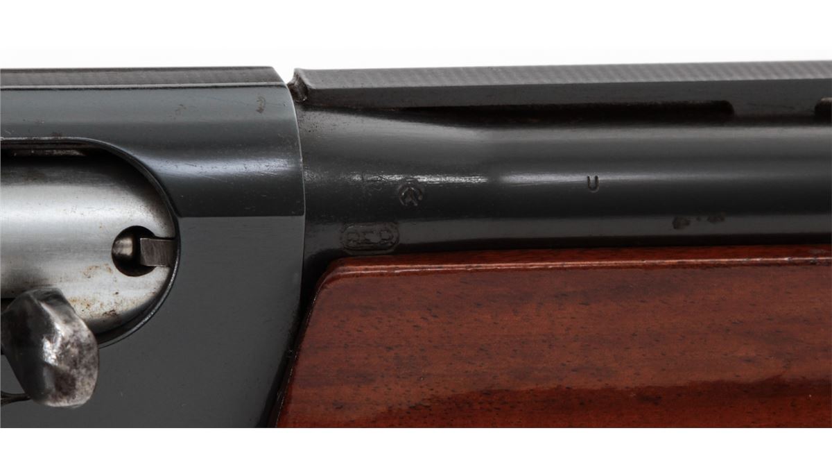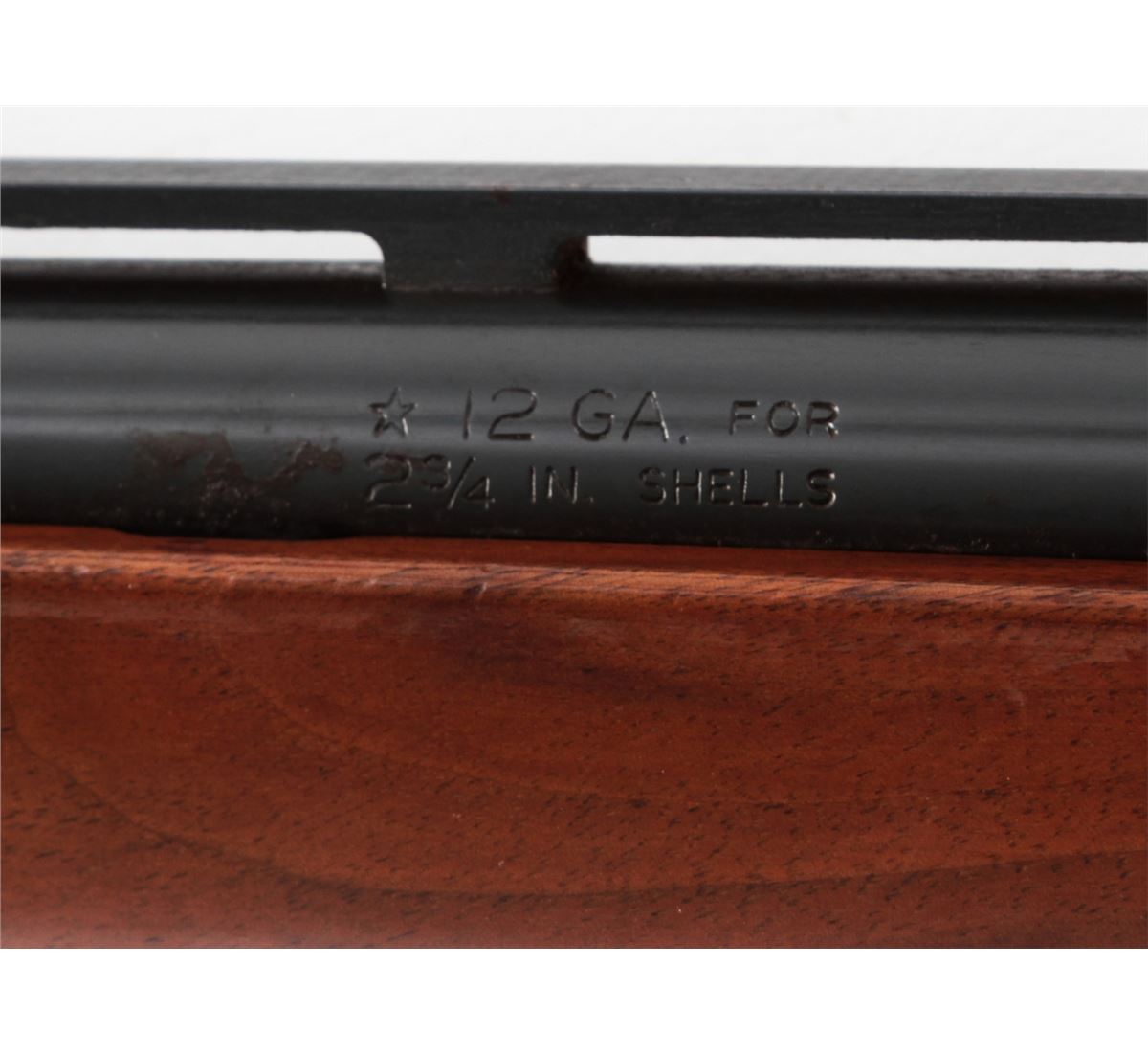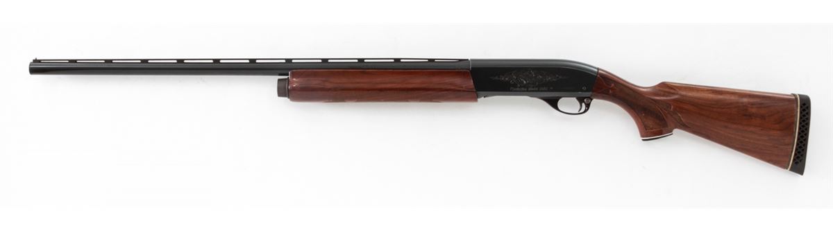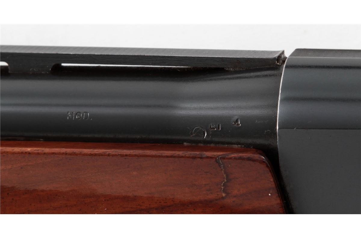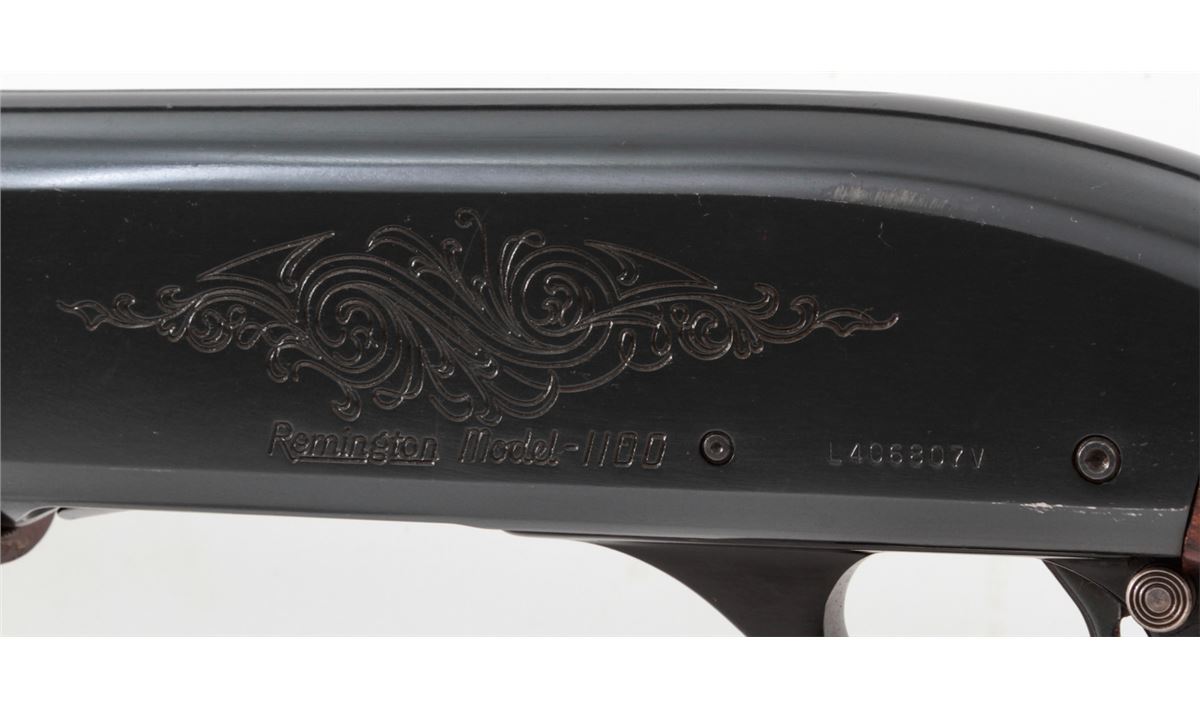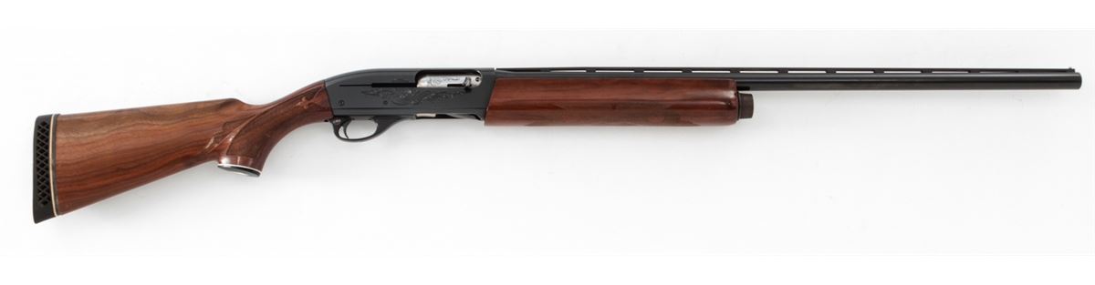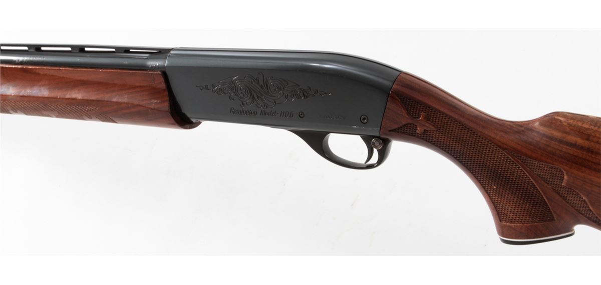 Remington Model 1100 Semi-Automatic Shotgun, #L406807V, 12 ga., 28'' vent rib barrel for 2-3/4'' shells choked Mod., pressed checkered walnut stock. Condition is near fine retaining approx. 96% blue. Shortened stock with scuffs and scratches from field use. Butt pad fits a little large. Length of pull to end of pad is 13-7/8''. Crisp action, bright bore. Est.: $250-$450. (Modern)