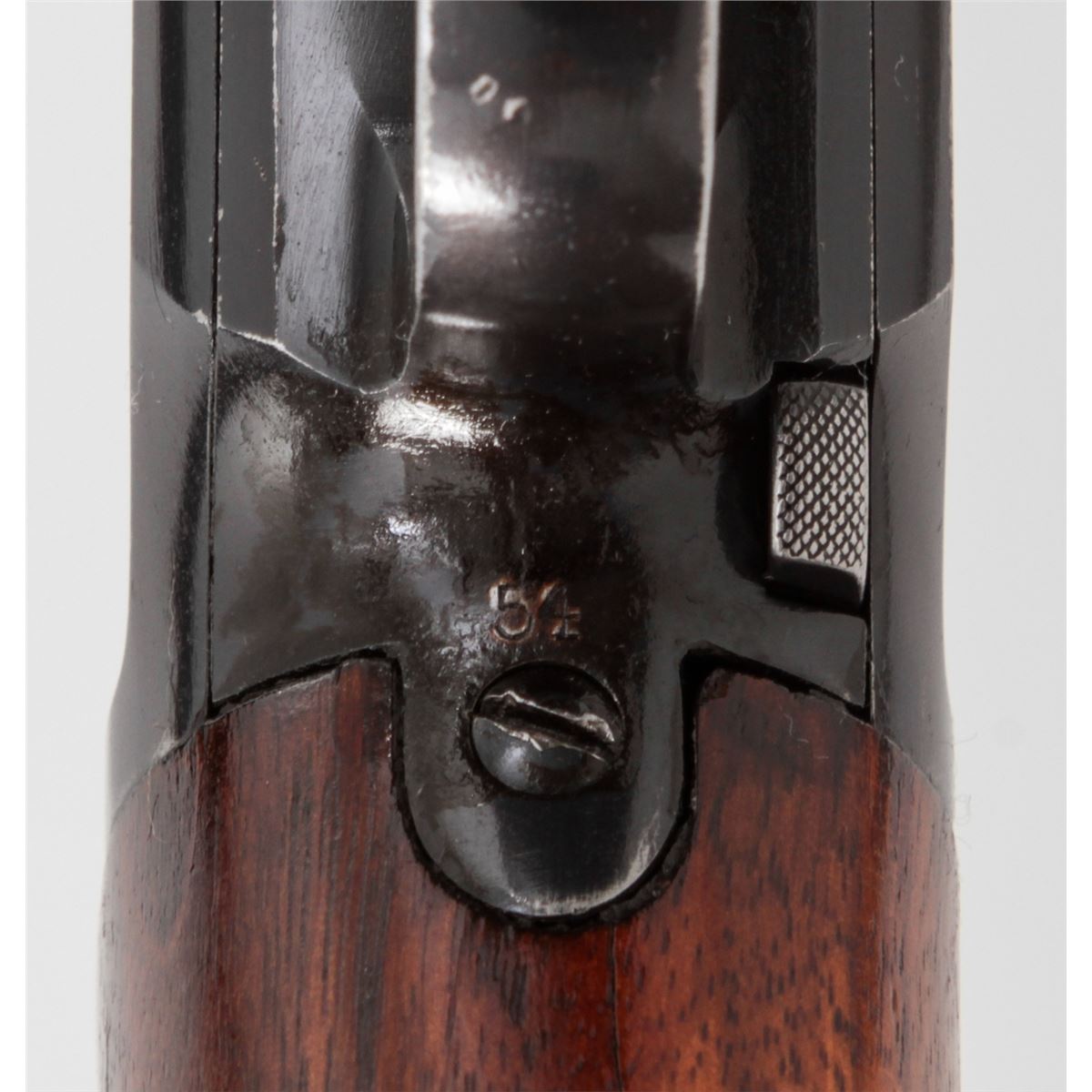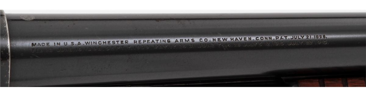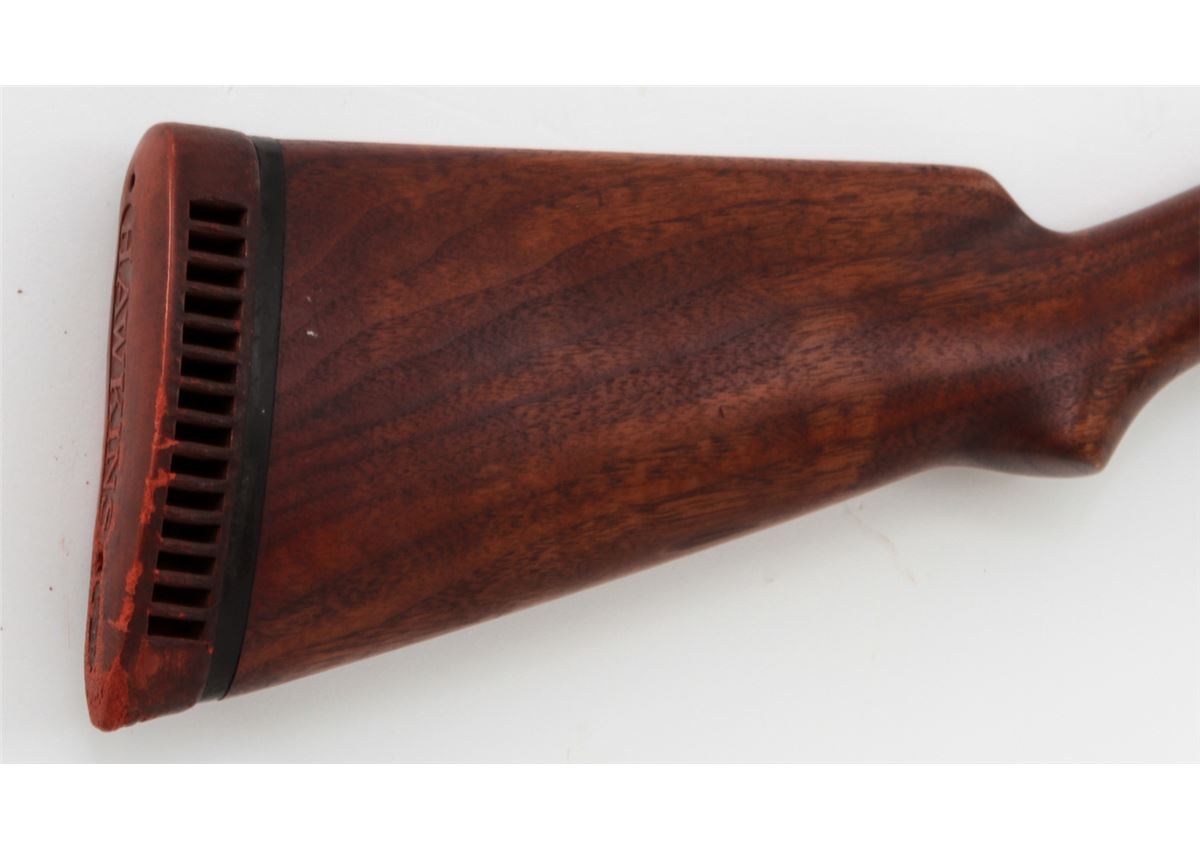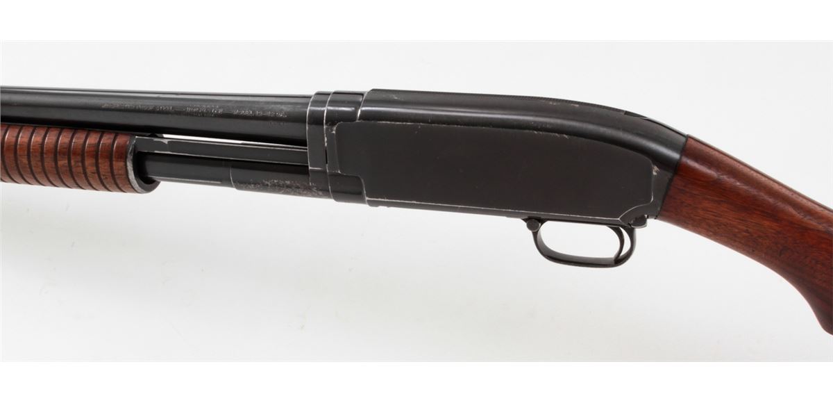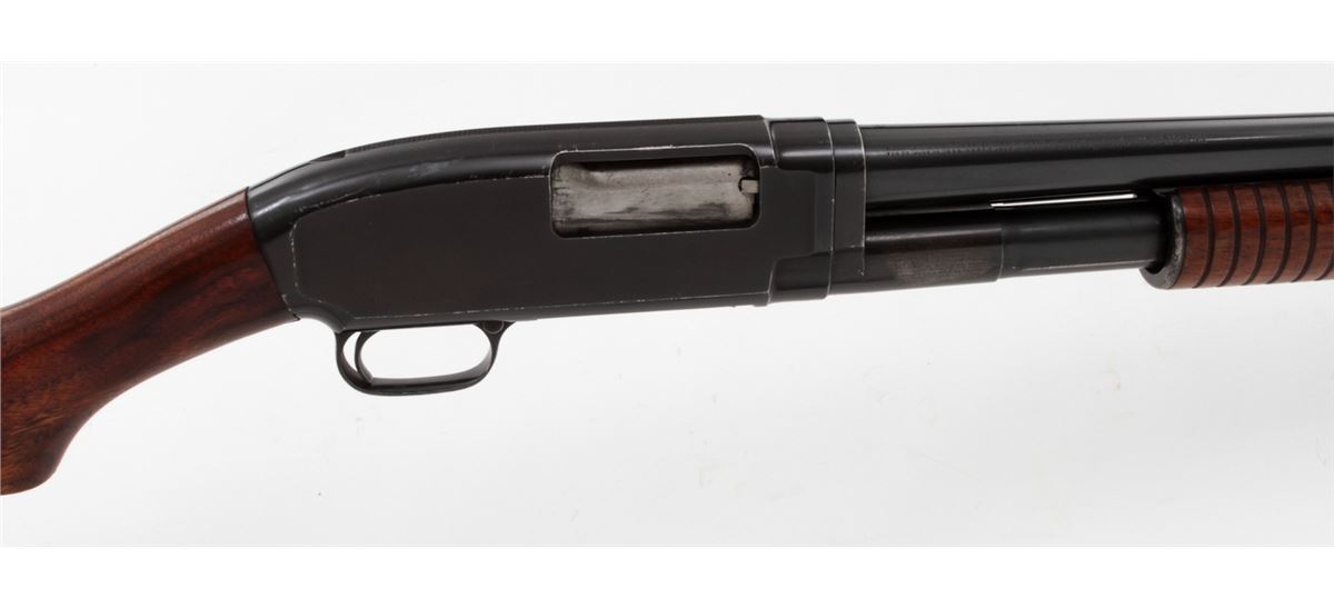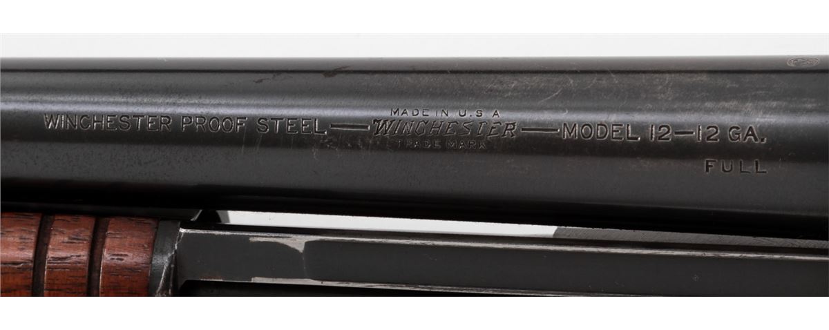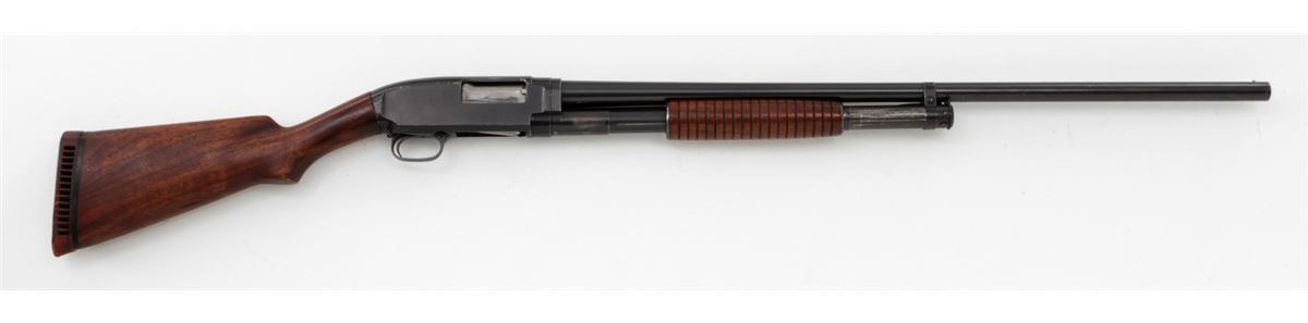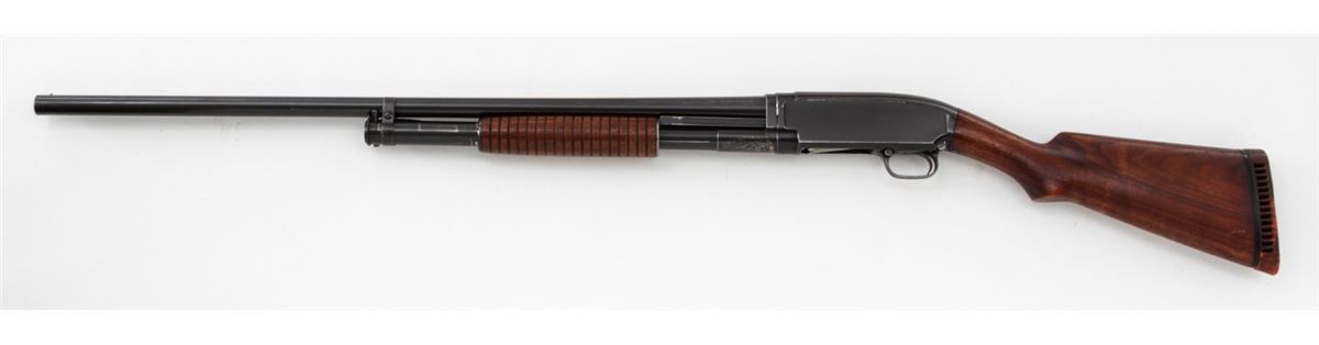 Winchester Model 12 Pump Action Shotgun, #632153, 12 ga., 30'' round barrel choked Full for 2-3/4'' shells, blue finish, walnut stock and forend, with pre-war Hawkins red rubber butt pad. Mfg'd 1931. Condition is very good retaining approx. 92% blue with light scuffs and wear at balance point. Stock has been shortened when buttplate was added. Length of pull to end of wood: 12-1/2''; 13-1/2'' to end of pad. Action remains crisp, bore is bright. Est.: $250-$450. (C&R)