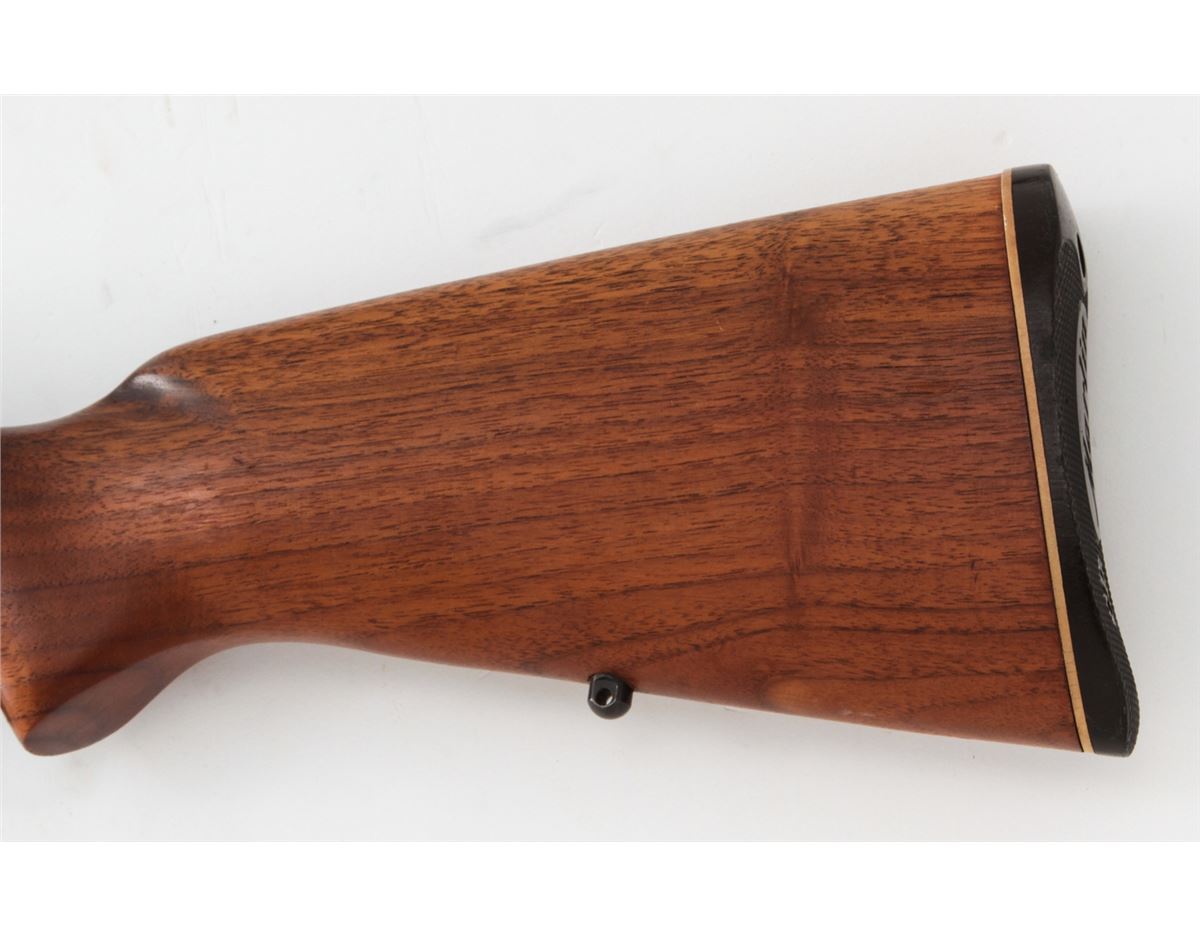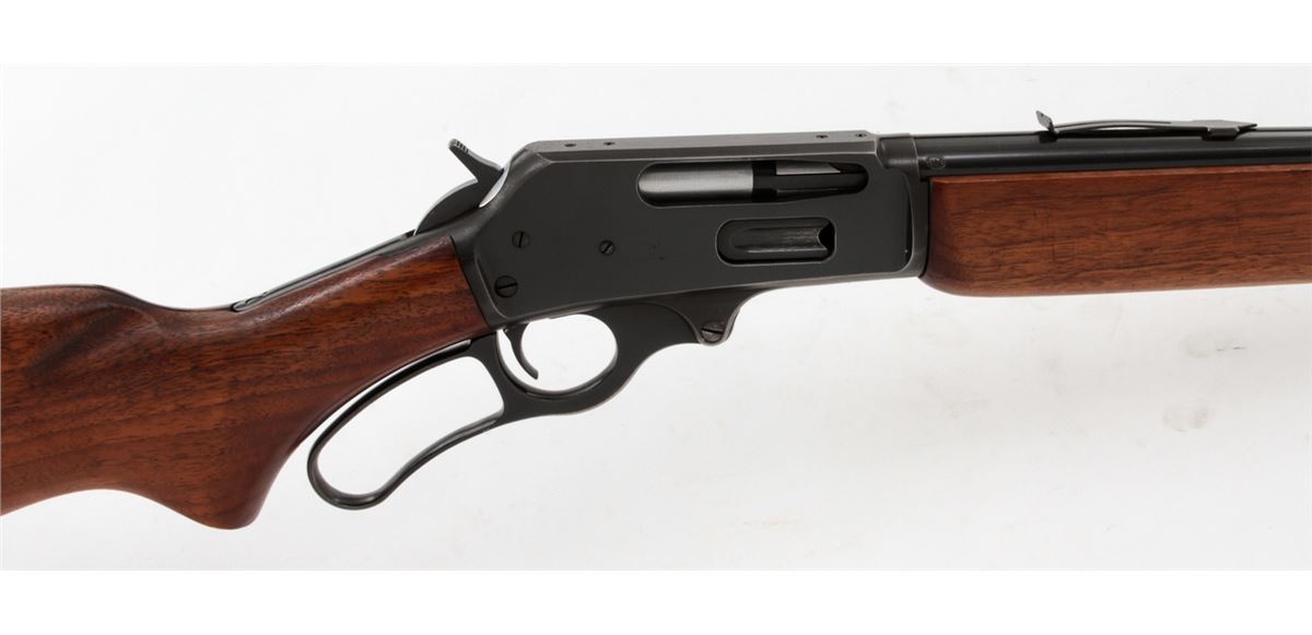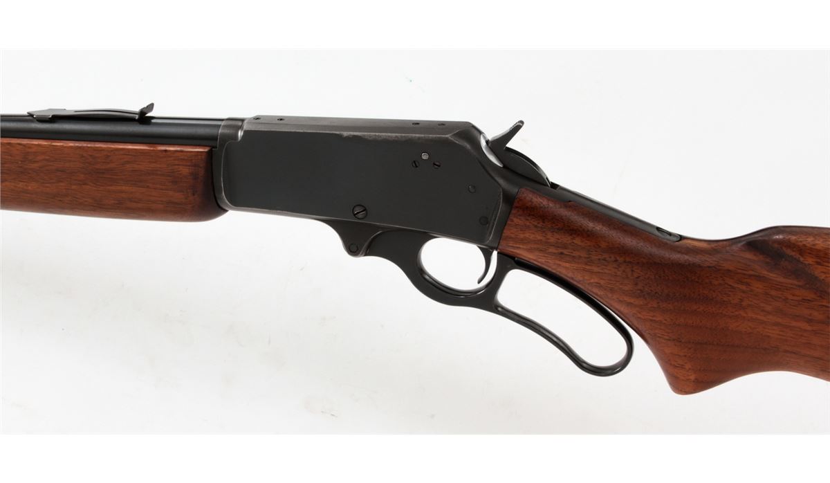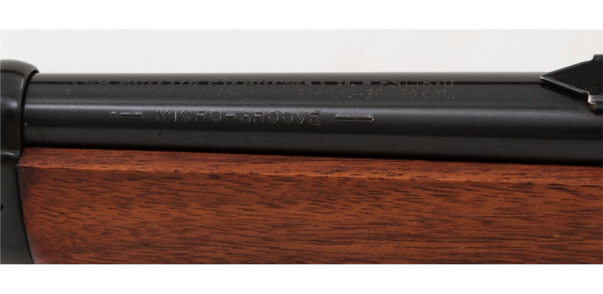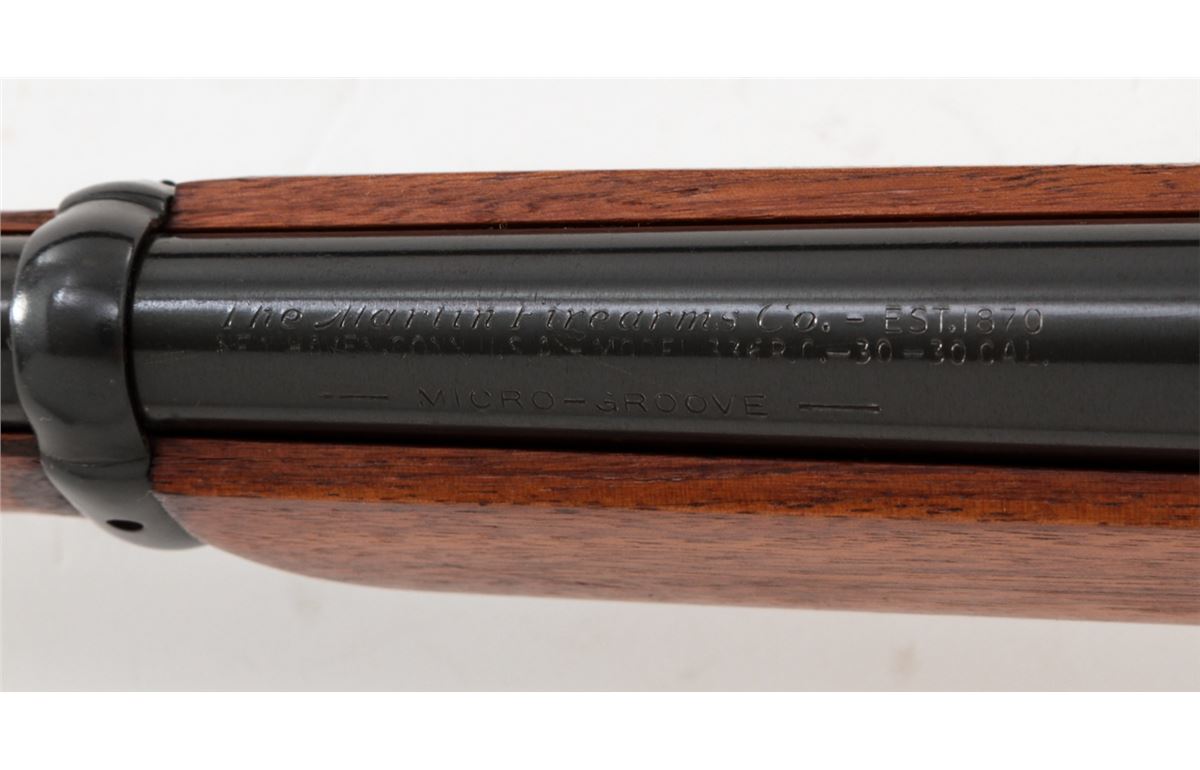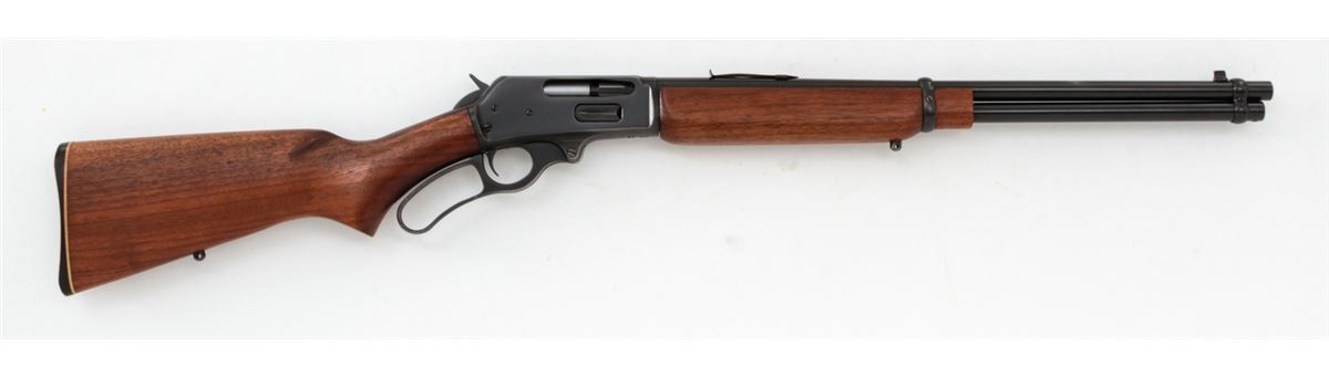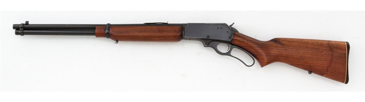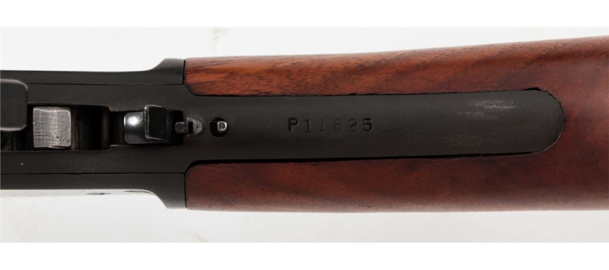Marlin Model 336RC Lever Action Carbine, #P11825, .30-30 cal., 20'' barrel blue finish, walnut stock and forend, with Marlin black plastic buttpate. Condition is very good to near fine retaining approx. 92% blue, with light wear at left side high edge of receiver. Missing rear sight elevator bar, with very light impressions to stock. Crisp action, micro-grooved bore is bright. Est.: $300-$500. (C&R)