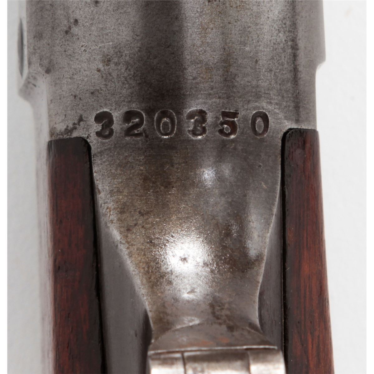Savage Model 99 Lever Action Takedown Rifle, #320350, .30-30 cal., 22'' barrel, blue finish, factory checkered walnut stock, with steel buttplate. Cocking indicator and cartridge counter are present. Standard rear and nickel silver front sights. Condition is very good retaining approx. 75% blue to barrel; frame about 20%; case colored lever shows approx. 80%. Stock with moderate scuffs, scratches, and flattening to checkers from field use. Action is good, bore is fine. Est.: $350-$500. (C&R)