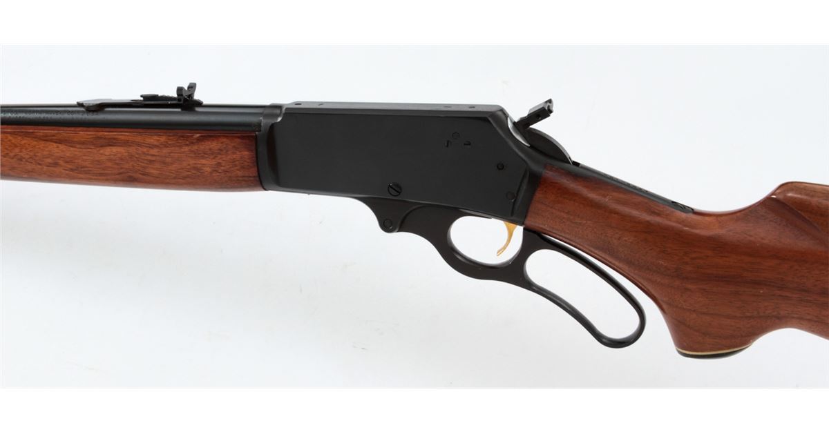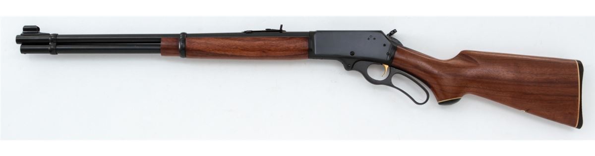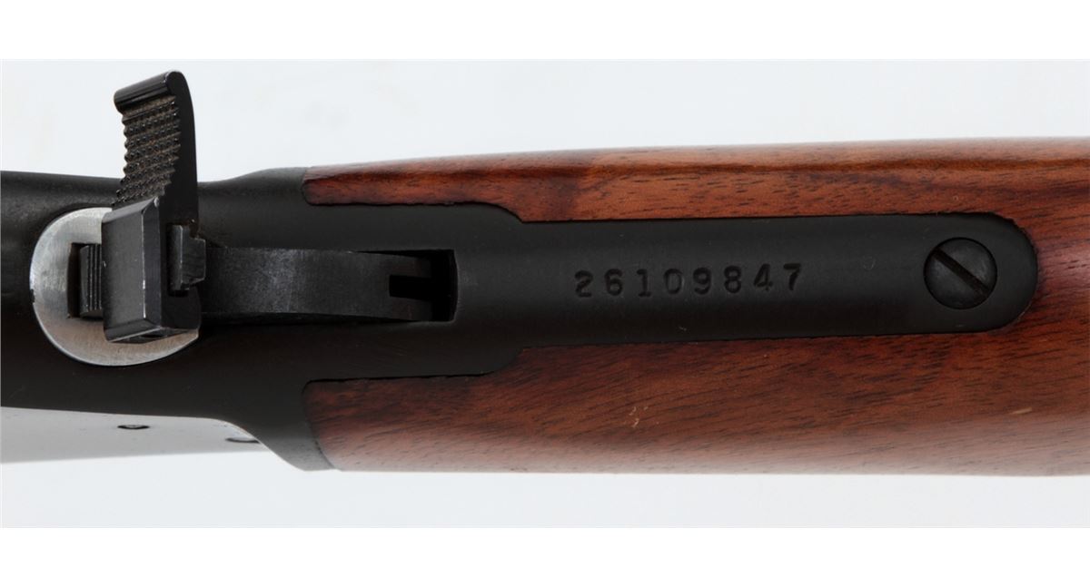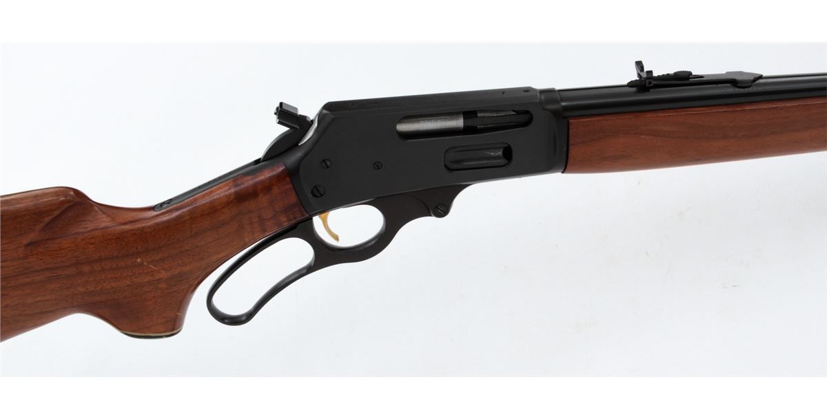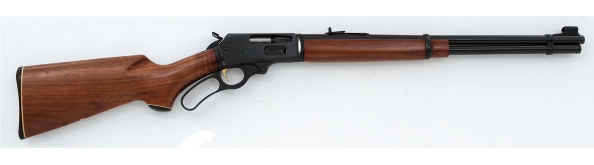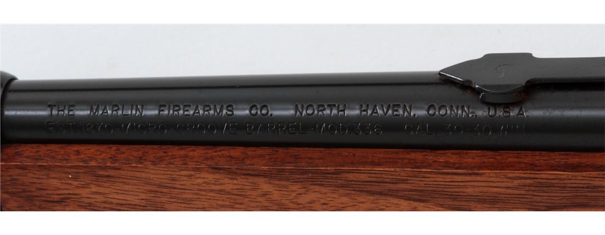 Marlin Model 336 Lever Action Carbine, #26109847, .30-30 Win. cal., blue finish, 20'' round barrel with semi-buckhorn rear and hooded ramp front sight, gold-plated trigger, offset hammer spur, satin finish pistol-grip walnut stock and forearm, with black plastic Marlin buttplate. Mfg'd 1974. Condition is fine with scattered storage marks to wood, and light scratching and beginning oxidation along barrel and rear sight base. Bolt face and chamber show little firing use. Est.: $300-$500. (Modern)