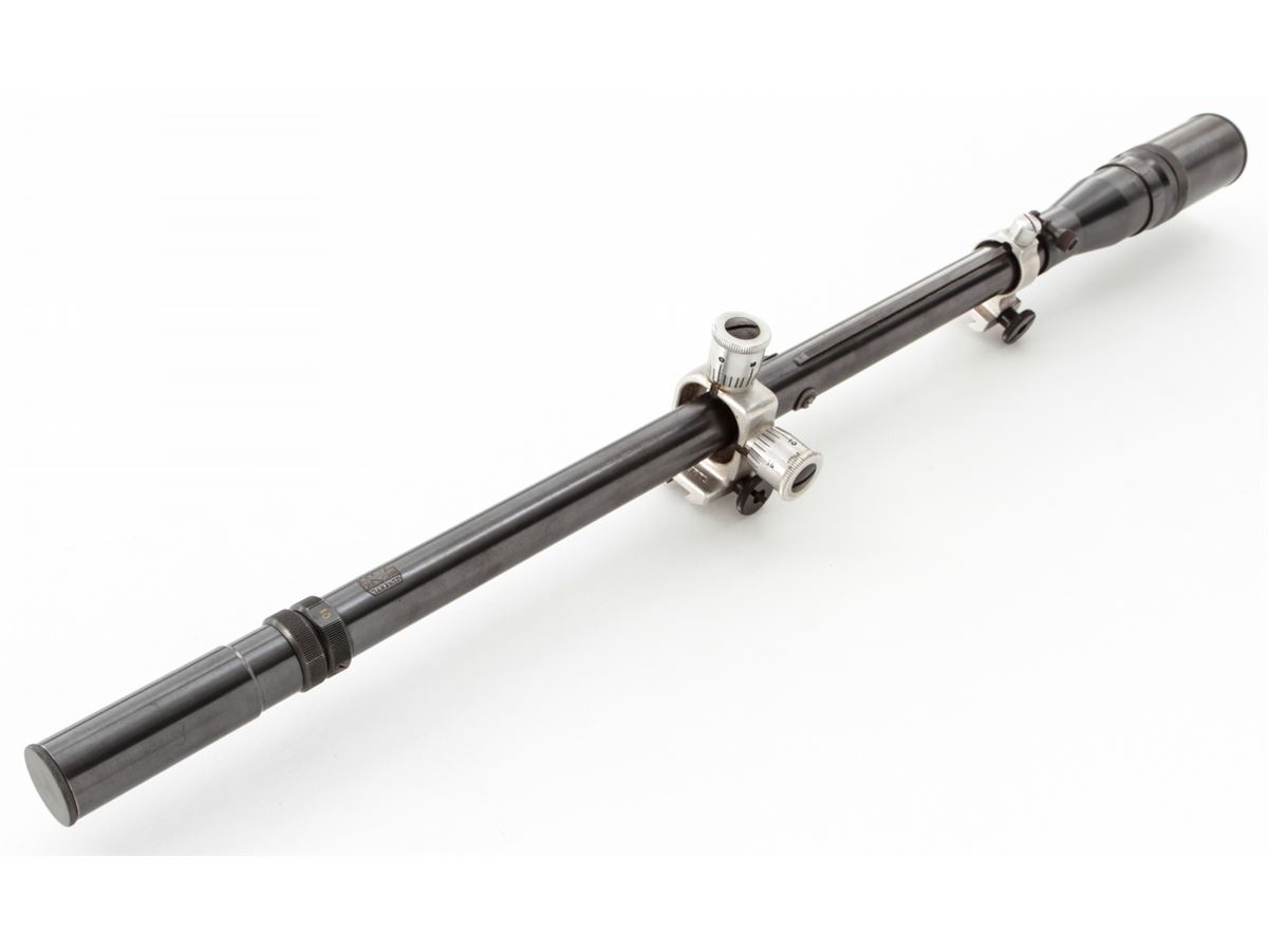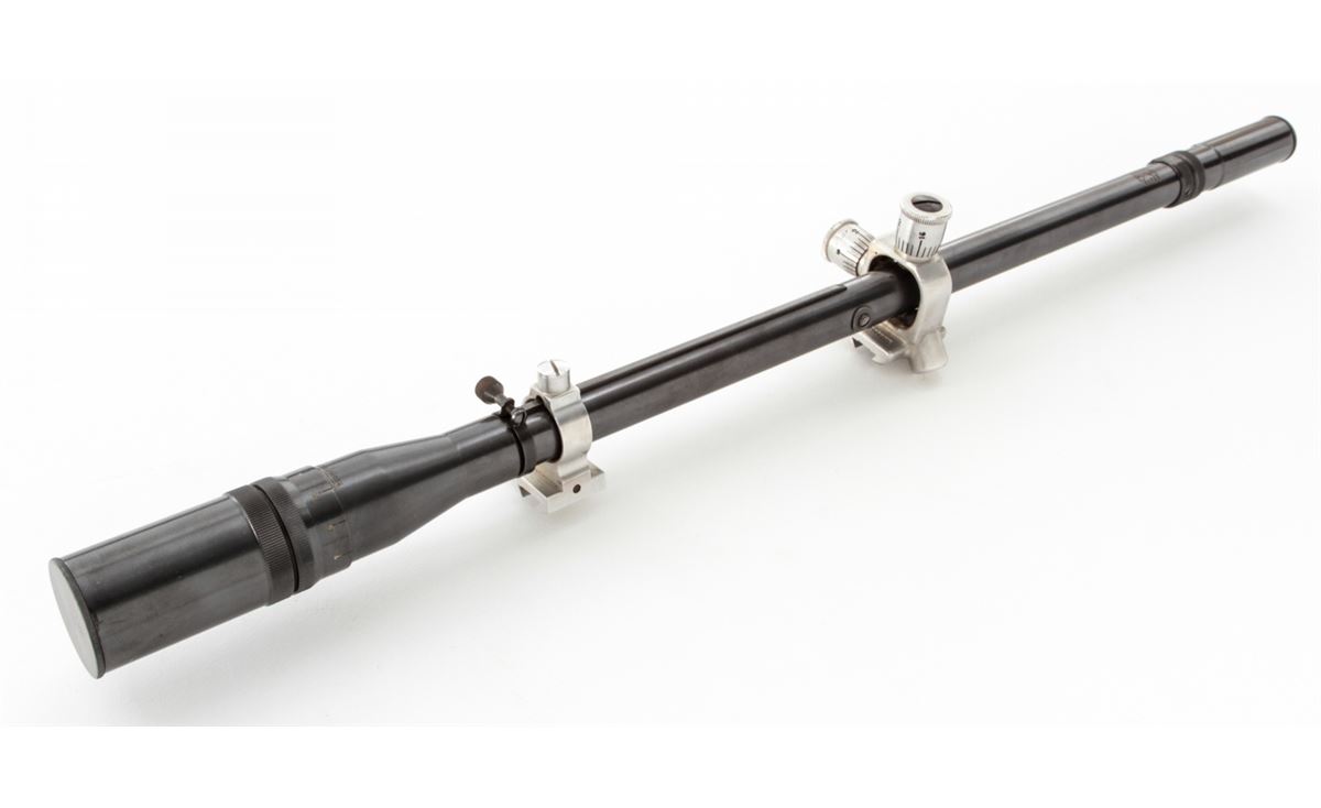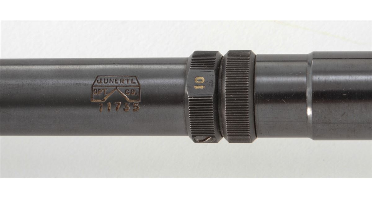 Unertl 10-power Target Scope, 0.75'' dia. tube, 21-3/4'' in overall length, with original rings and crosshair reticle. Condition is near excellent with index line from scope rings to lower third. Est.: $500-$750.