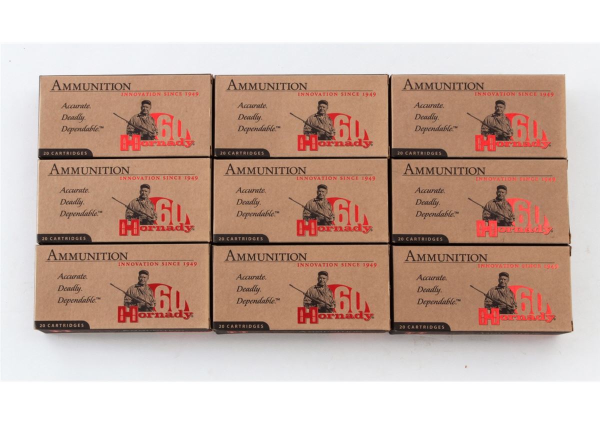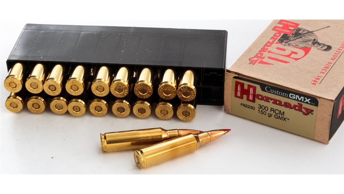 Ammo Lot: 180 Rounds of Hornady Custom GMX .300 RCM 150-grain cartridges. Nine (9) 20-round boxes, all brand new in original packaging. Retails @ $340/lot. Est.: $200-$300/lot. (Field Time)