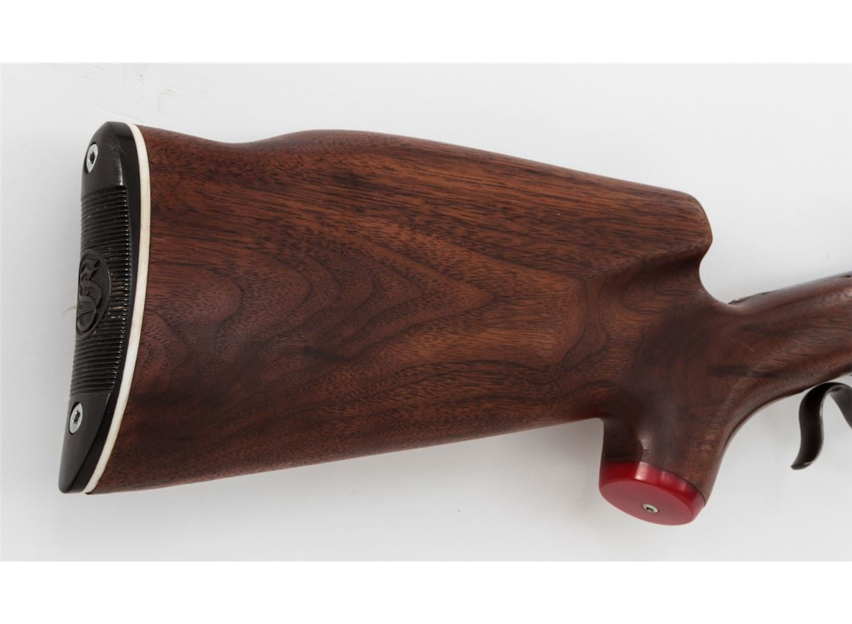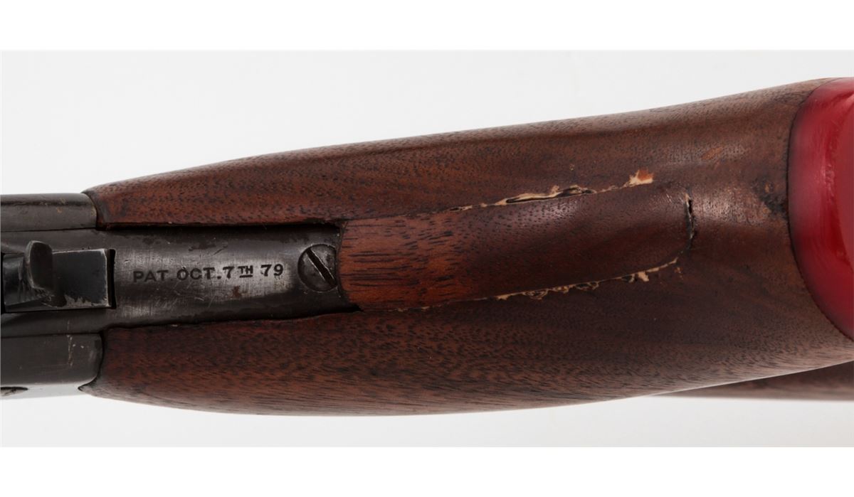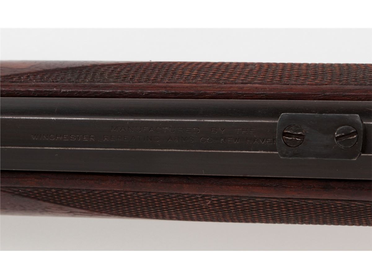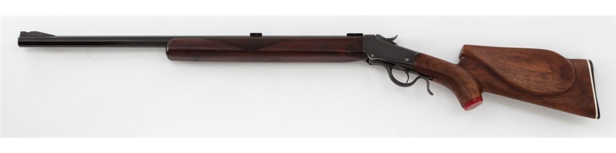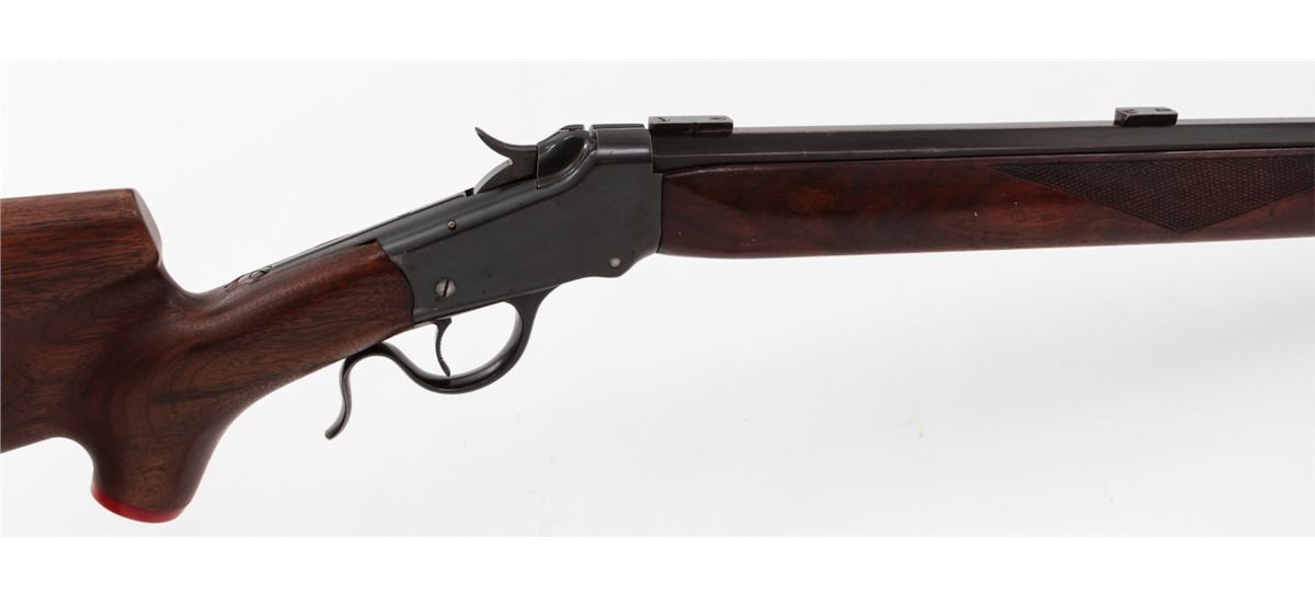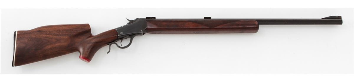 Target Modified Winchester Low-Wall Single Shot Rifle, NVSN, .22 WCF cal., 25'' octagonal barrel, blue finish, Swiss style cheekpiece stock, with long checkered walnut forend. Dovetail scope mounts and front sight base to top of barrel. Condition is fine as modified having barrel shortened and sleeved for .22 Winchester centerfire. Barrel and receiver retain approx. 92% of a later blue. Stock fits reasonably well, and lower tang is covered by wooden insert. Action is crisp, bore is bright. Est.: $350-$500. (C&R)