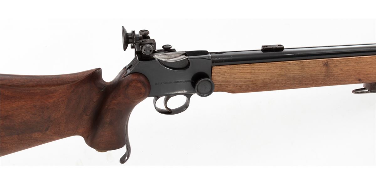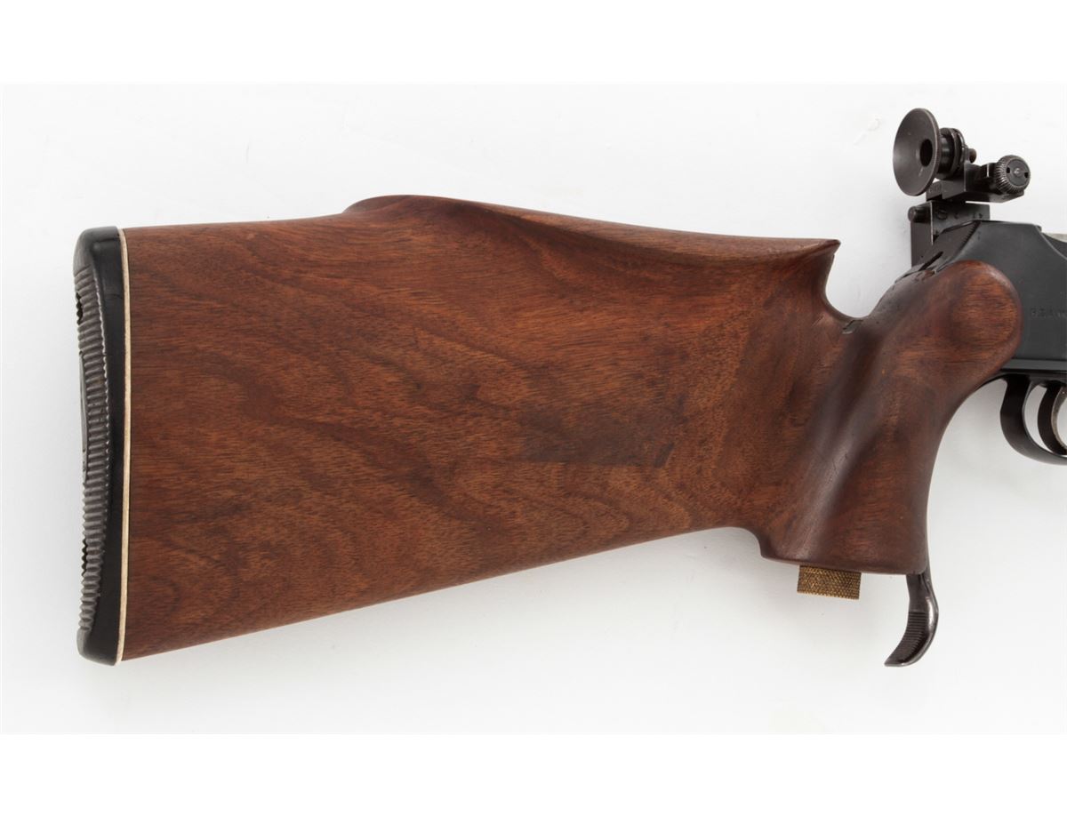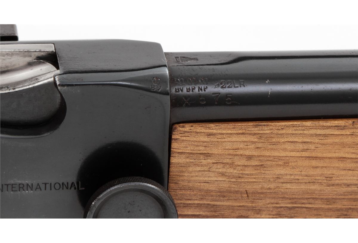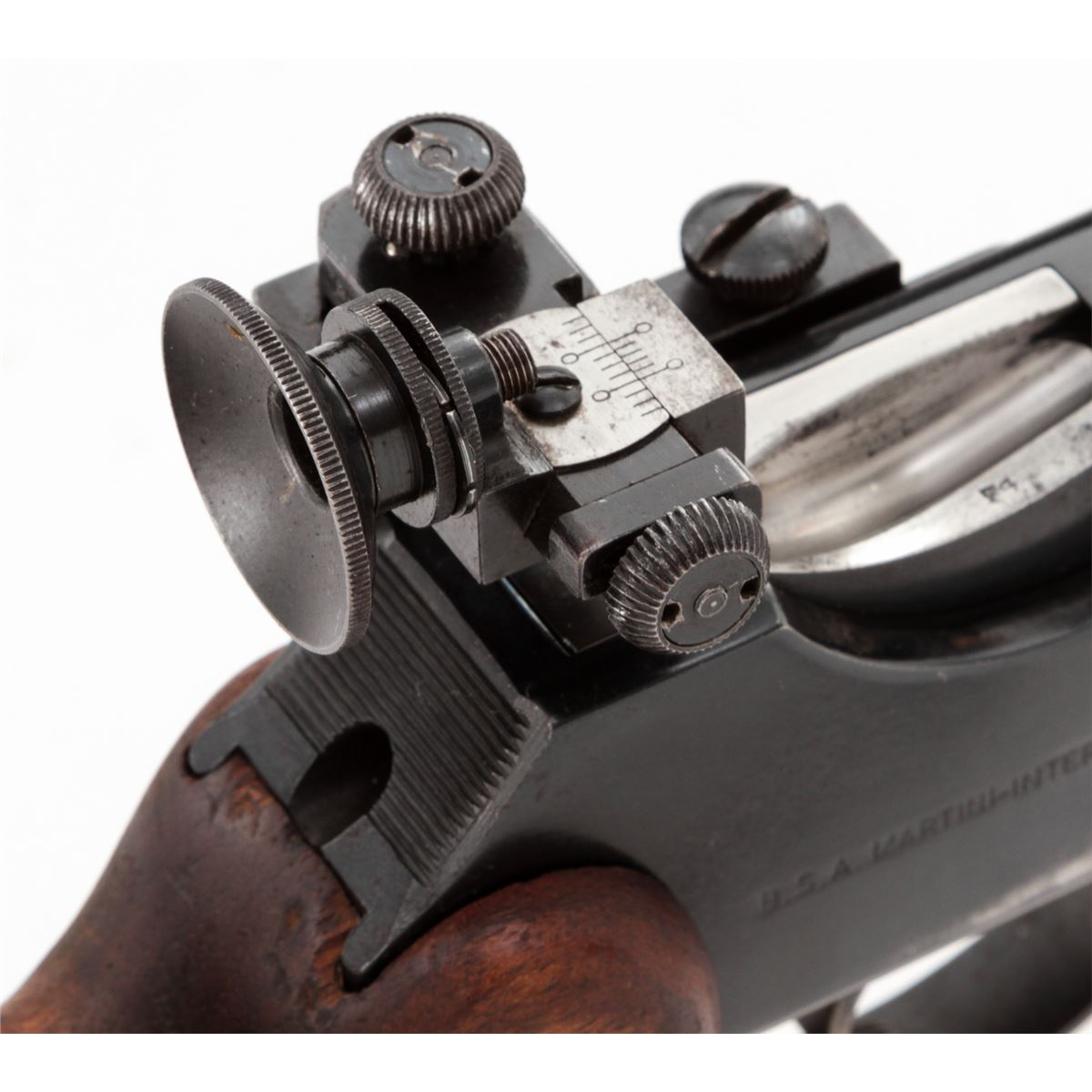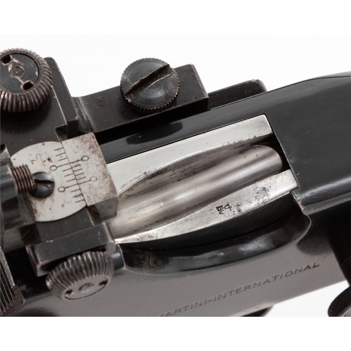 BSA Martini International Target Rifle, #X675, .22 LR cal., 29'' medium-weight barrel, Parker-Hale International style front and rear sights, blue finish, target cheekpiece pistol-grip stock and forend, with compartment at pistol-grip cap for additional sight inserts. Condition is very good as refinished retaining approx. 95% blue. Stock with general smoothing; forend with moveable forward sling swivel (shooter made replacement). Action and triggerpull are crisp, bore is bright. Est.: $450-$650. (C&R)