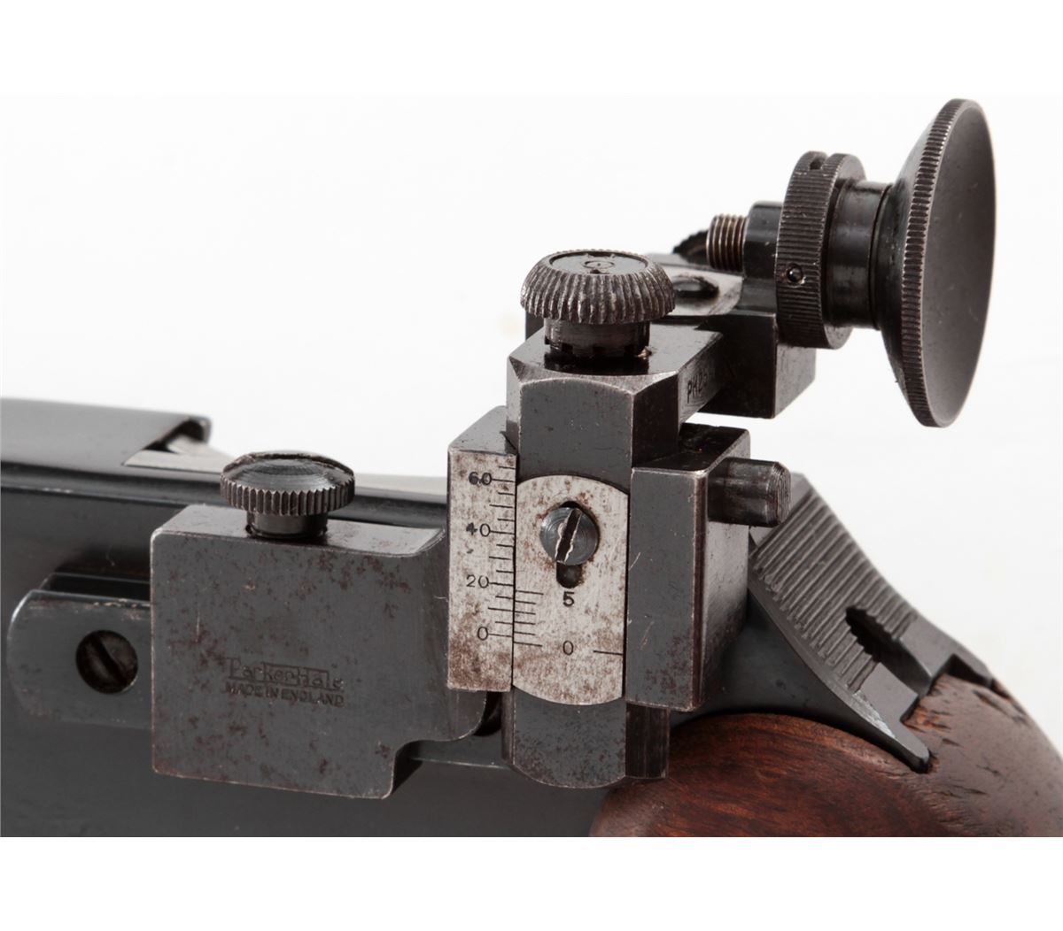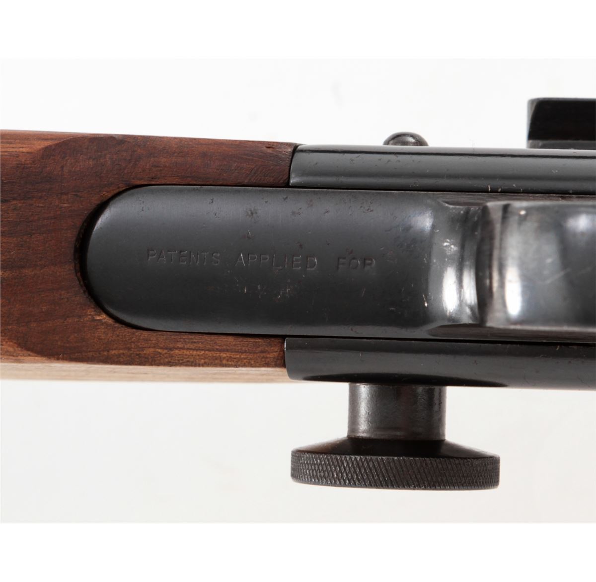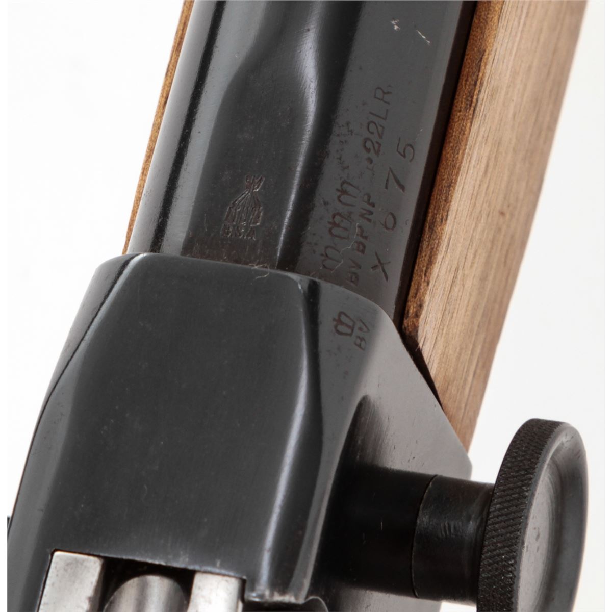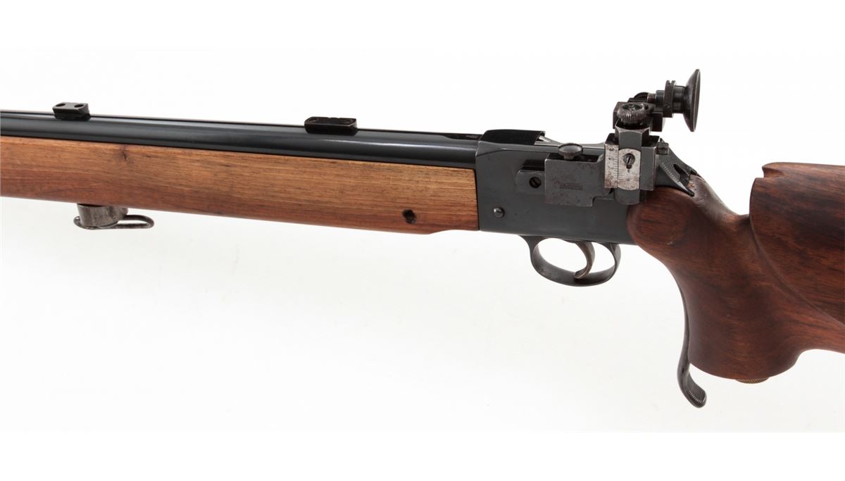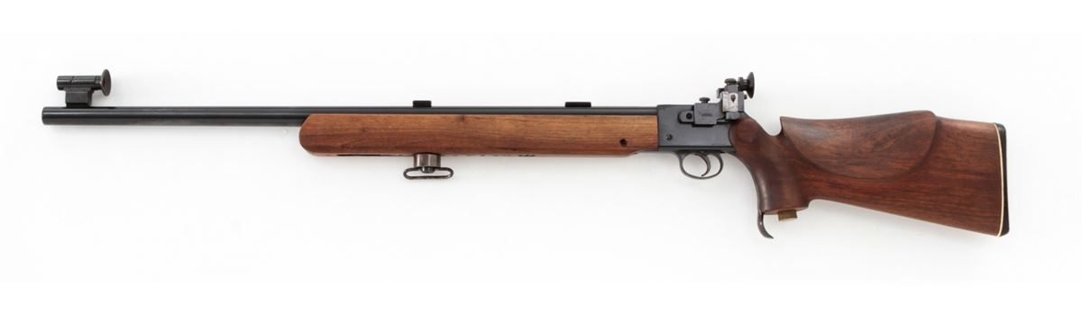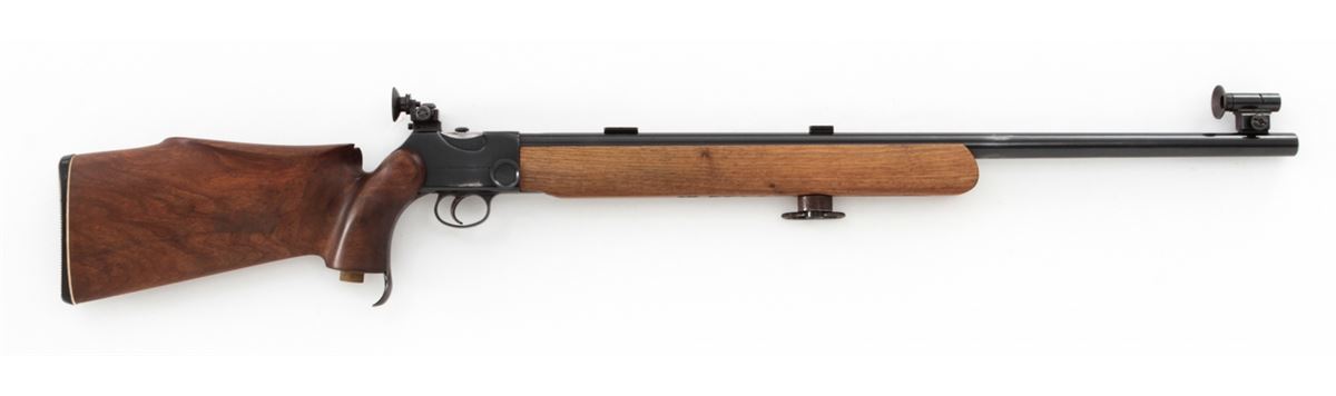 BSA Martini International Target Rifle, #X675, .22 LR cal., 29'' medium-weight barrel, Parker-Hale International style front and rear sights, blue finish, target cheekpiece pistol-grip stock and forend, with compartment at pistol-grip cap for additional sight inserts. Condition is very good as refinished retaining approx. 95% blue. Stock with general smoothing; forend with moveable forward sling swivel (shooter made replacement). Action and triggerpull are crisp, bore is bright. Est.: $450-$650. (C&R)