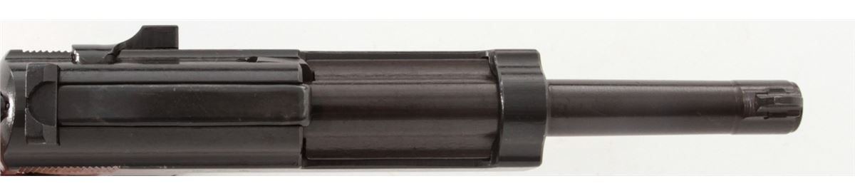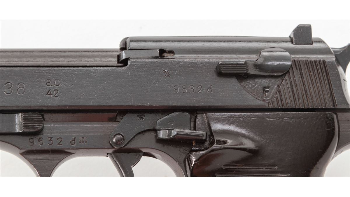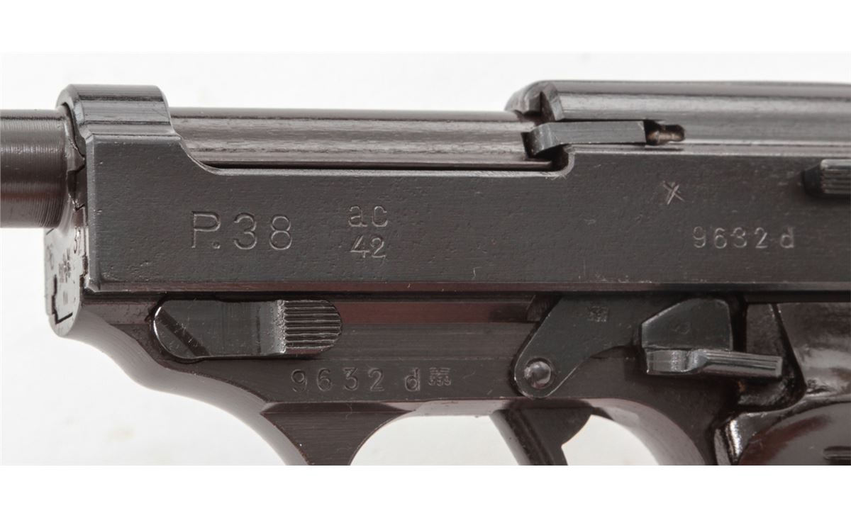 WWII Era P.38 Semi-Automatic Pistol, by Walther, #9632d, 9mm, 4-7/8'' barrel, arsenal blue finish, brown grooved phenolic resin grips, with one WWII era P.38 magazine. Post-WWII rebuild with forced matched barrel assembly. Condition is excellent as overhauled with arsenal blue. Crisp grips and action, fair to good bore that should clean. Est.: $300-$500. (C&R/PPT)