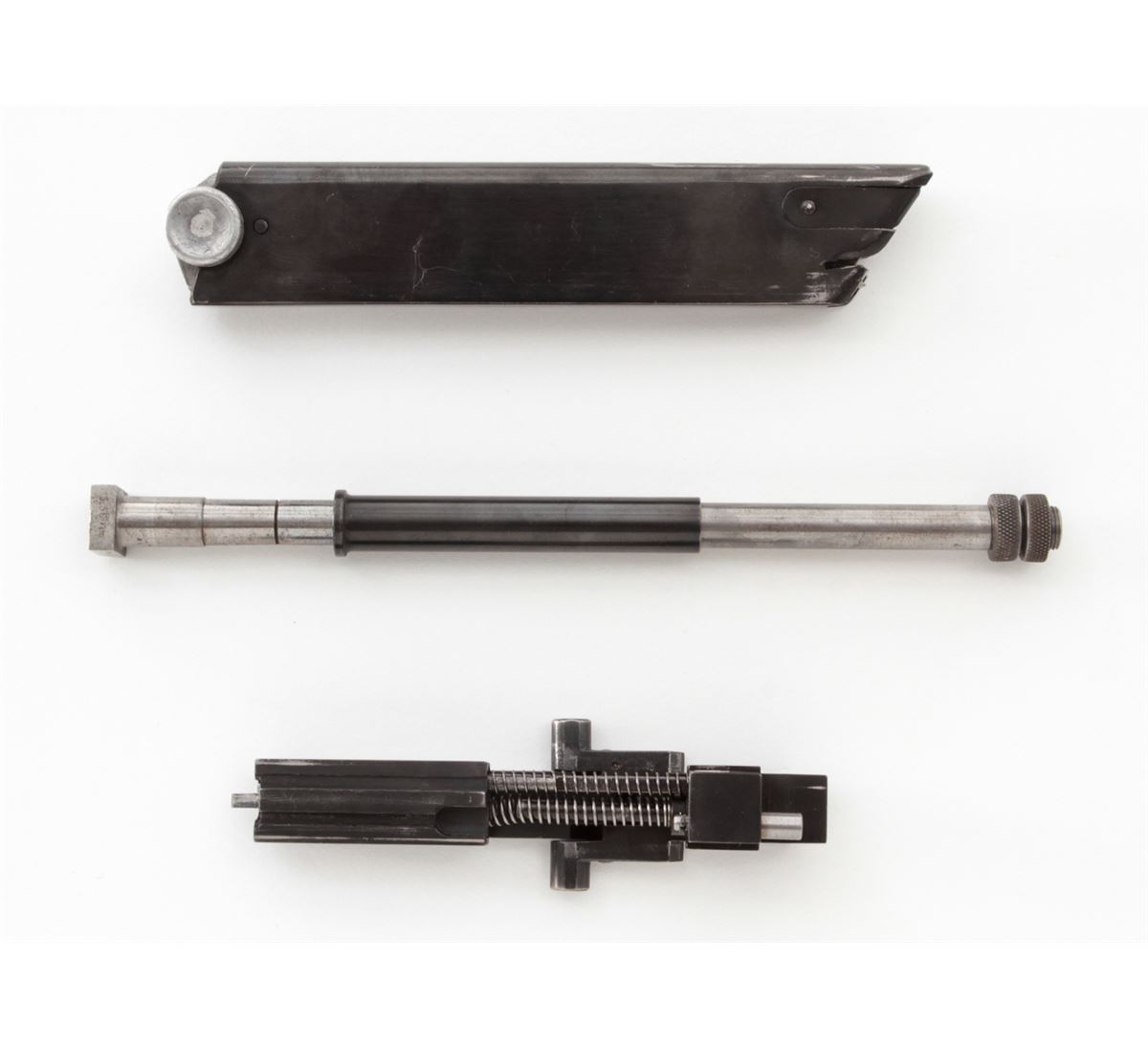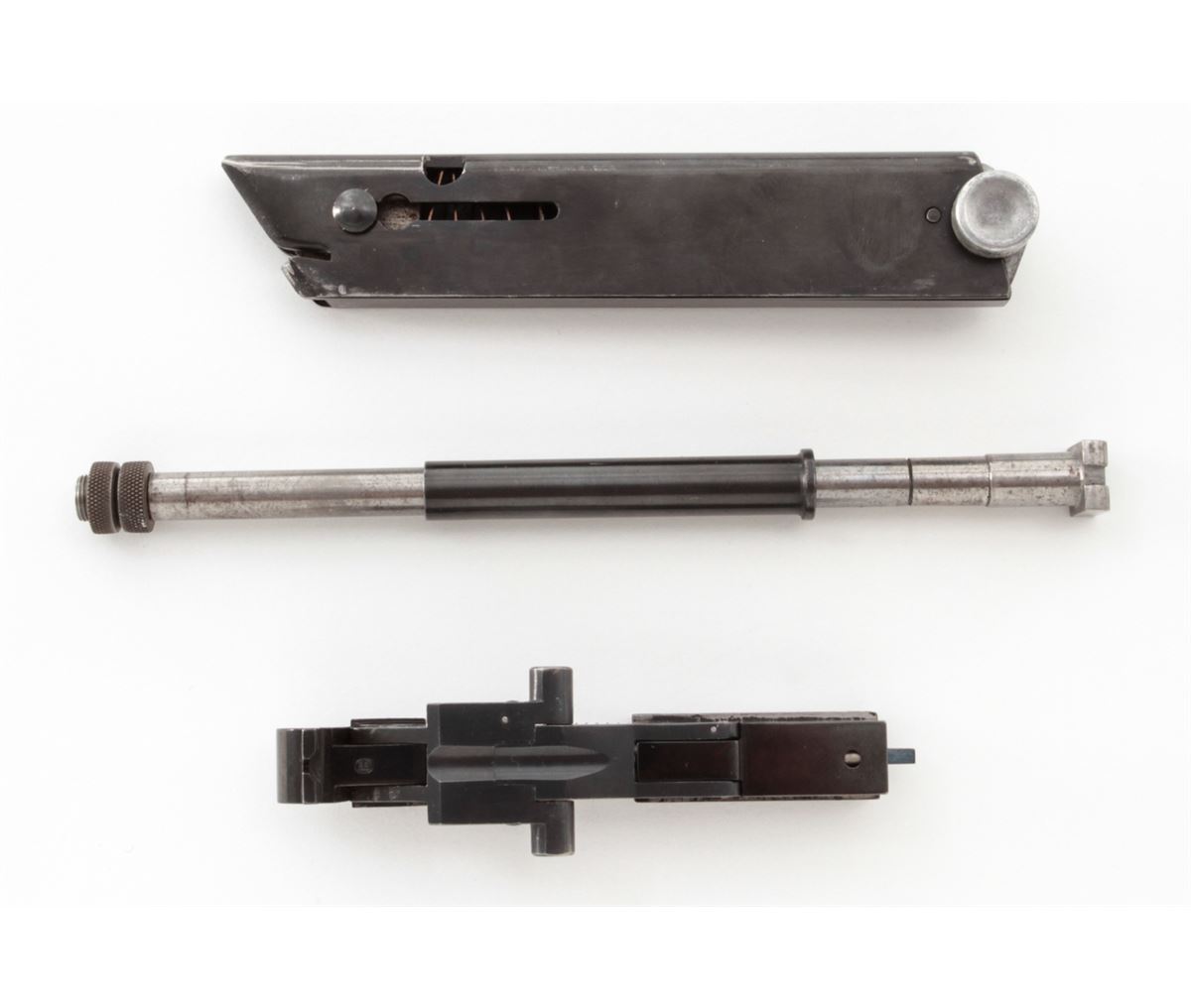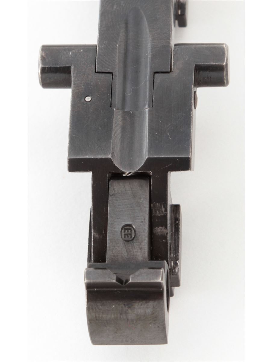 WWII Era German made Conversion Kit for P.08 Luger, for converting 9mm to .22 LR, includes magazine, toggle assembly and barrel adapter, in fitted wooden case with latch. Condition is excellent showing only light wear in actioning areas and high edges of external portions. All visible matching numbers except magazine, the bottom of which is smooth and bright. Good spring action to toggle, and bright rifling to barrel adapter. Est.: $500-$750.