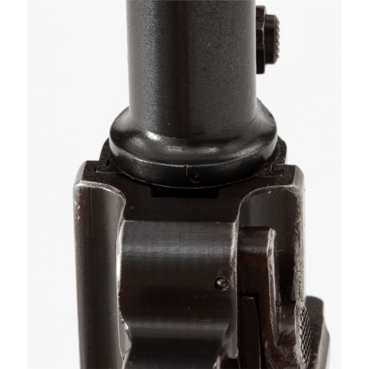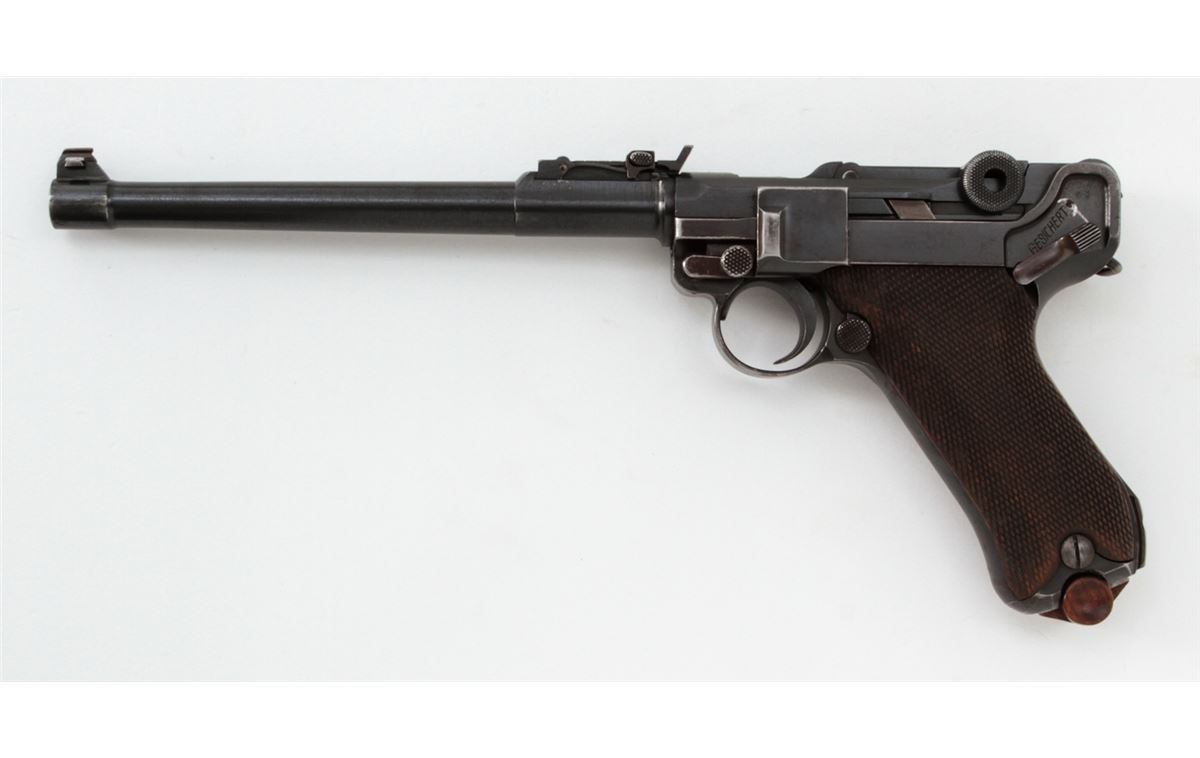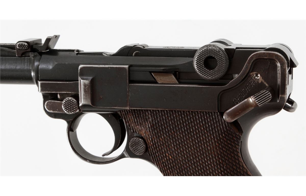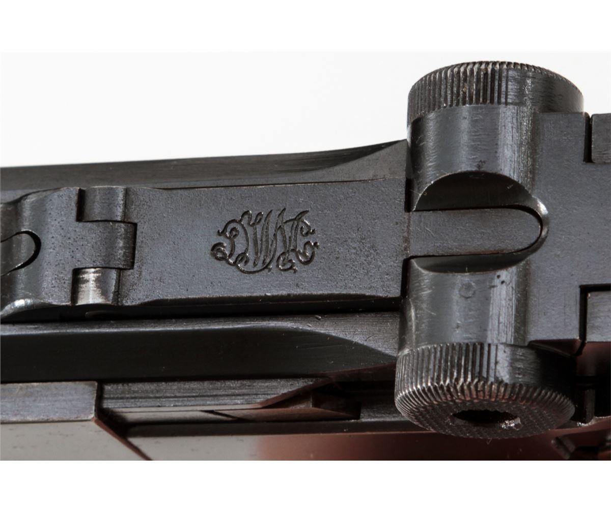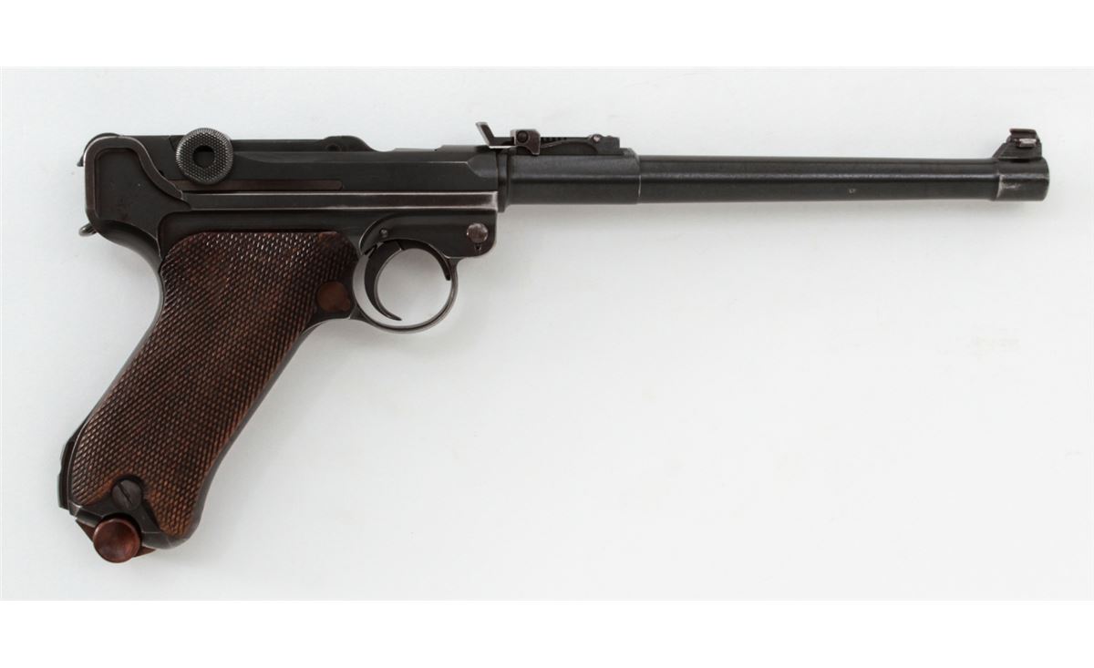 WWI Era German Artillery Luger, no serial number visible, with commercial markings, by DWM, 9mm, 8'' barrel, blue finish with straw-colored small parts, checkered walnut grips, and wood-based nickel-plated magazine. Safety marked ''Geischert'', extractor marked ''Geladen'', ''Germany'' over chamber area and at base of magazine, DWM to central toggle link, with standard Artillery rear and brass bead front sights without fine-tune adjustment screw. Condition is fine to near excellent retaining approx. 94% early type rust blue, thinning to sideplate, minor wear at high edges, with blue trigger. Grips with light to moderate flattening and small loss beneath axle pin of thumb safety. Action is crisp, bore is fine. As this pistol has never been serialized, it falls into the ''prototype'' category for registration purposes. Est.: $1,800-$2,400. (C&R)
