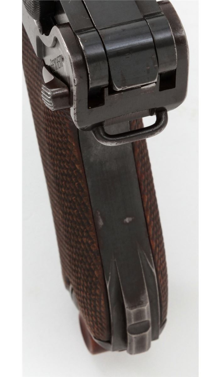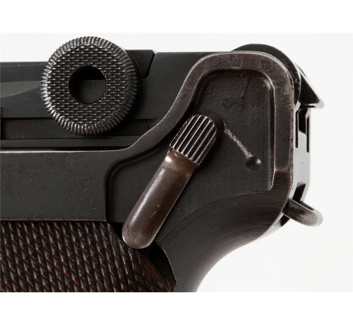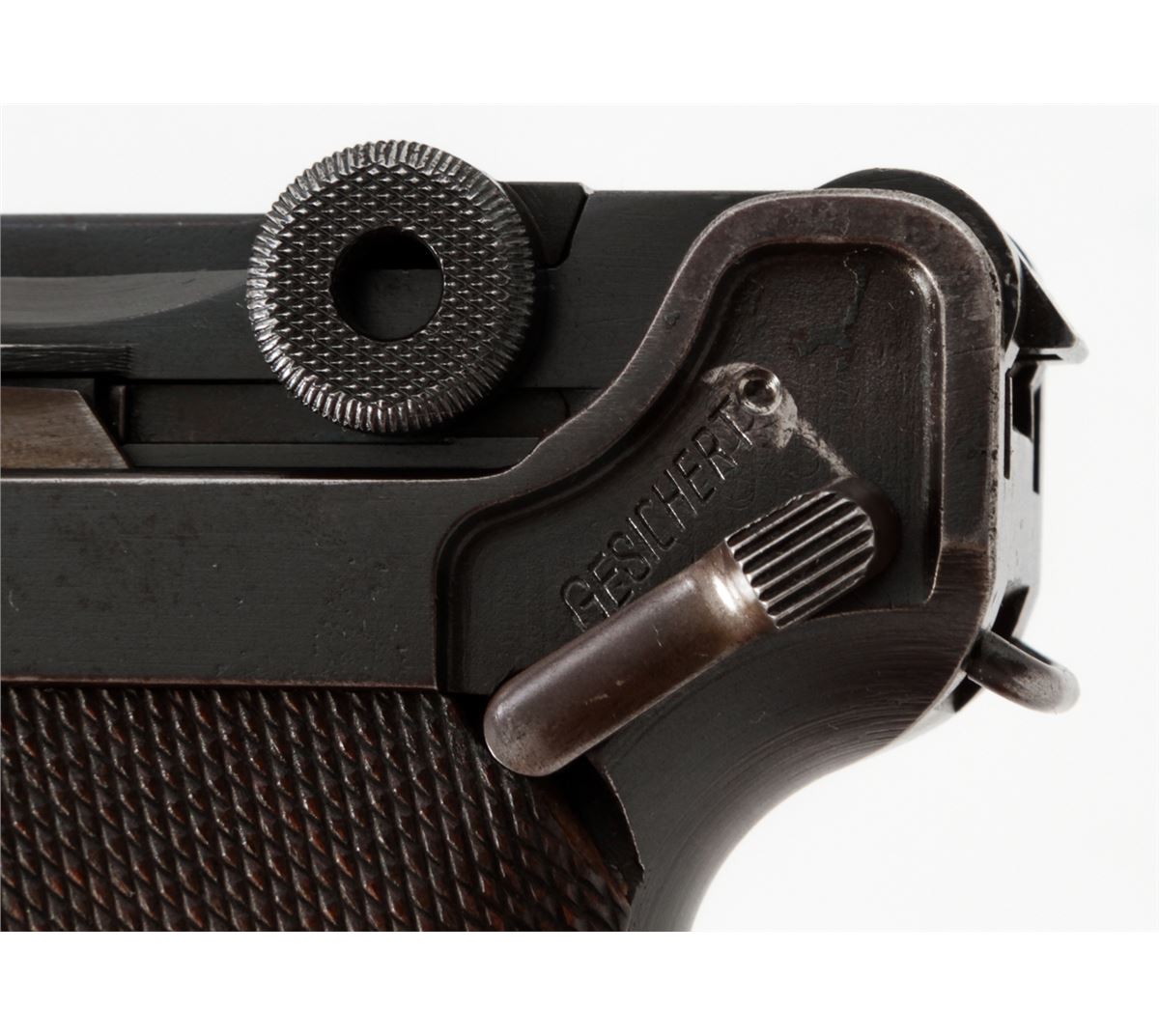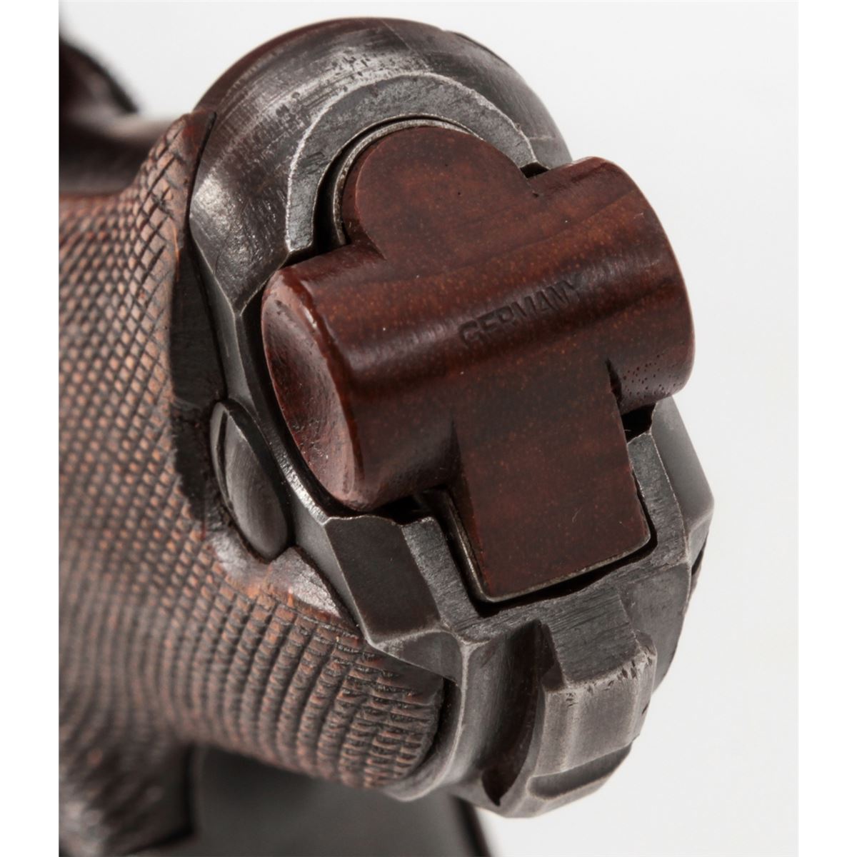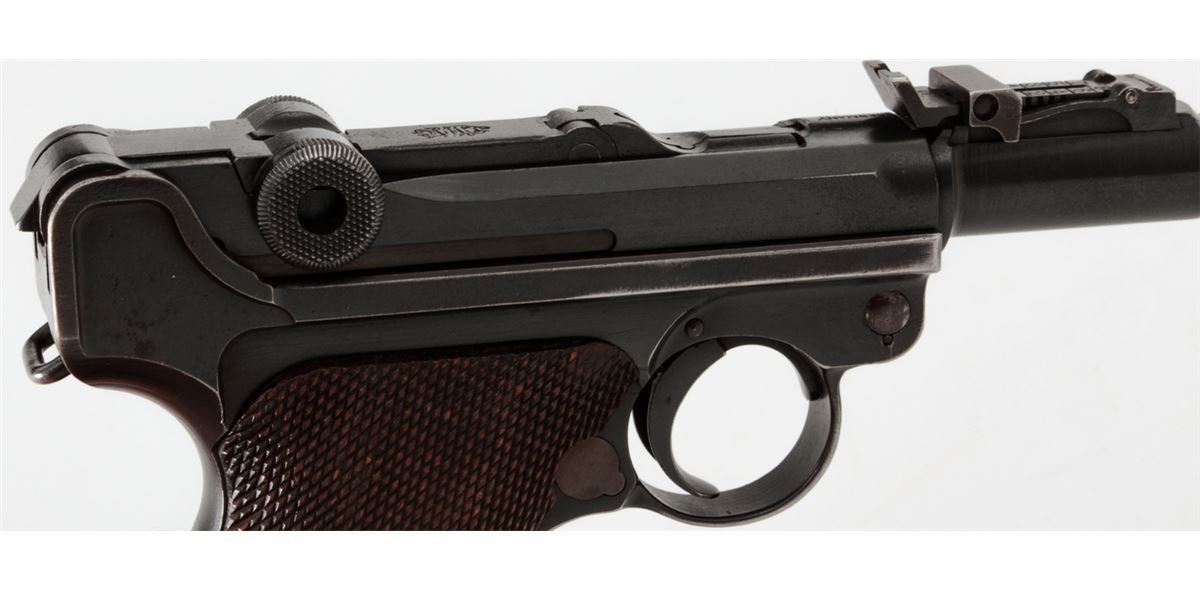 WWI Era German Artillery Luger, no serial number visible, with commercial markings, by DWM, 9mm, 8'' barrel, blue finish with straw-colored small parts, checkered walnut grips, and wood-based nickel-plated magazine. Safety marked ''Geischert'', extractor marked ''Geladen'', ''Germany'' over chamber area and at base of magazine, DWM to central toggle link, with standard Artillery rear and brass bead front sights without fine-tune adjustment screw. Condition is fine to near excellent retaining approx. 94% early type rust blue, thinning to sideplate, minor wear at high edges, with blue trigger. Grips with light to moderate flattening and small loss beneath axle pin of thumb safety. Action is crisp, bore is fine. As this pistol has never been serialized, it falls into the ''prototype'' category for registration purposes. Est.: $1,800-$2,400. (C&R)