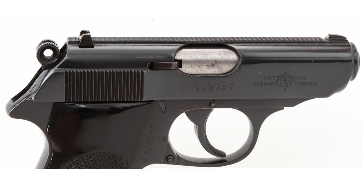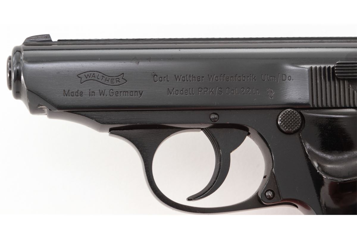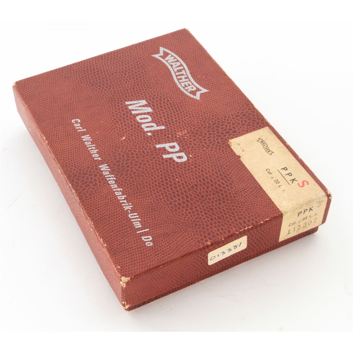 Walther PPK/S Semi-Automatic Pistol, #115307S, .22 LR cal., 3-1/4'' barrel, blue finish, factory checkered black plastic grips, two magazines (one with grip extension), in box with instructions. Pistol dates from 1969 with Interarms markings to right side of slide. Condition is near excellent showing only light marks from handling to right side of frame above trigger. Est.: $450-$600. (Modern)