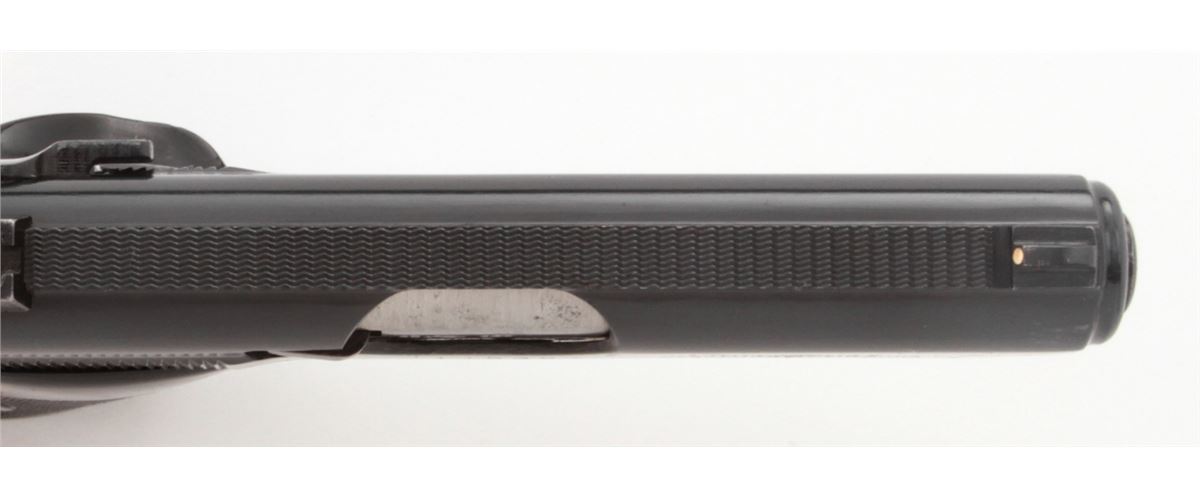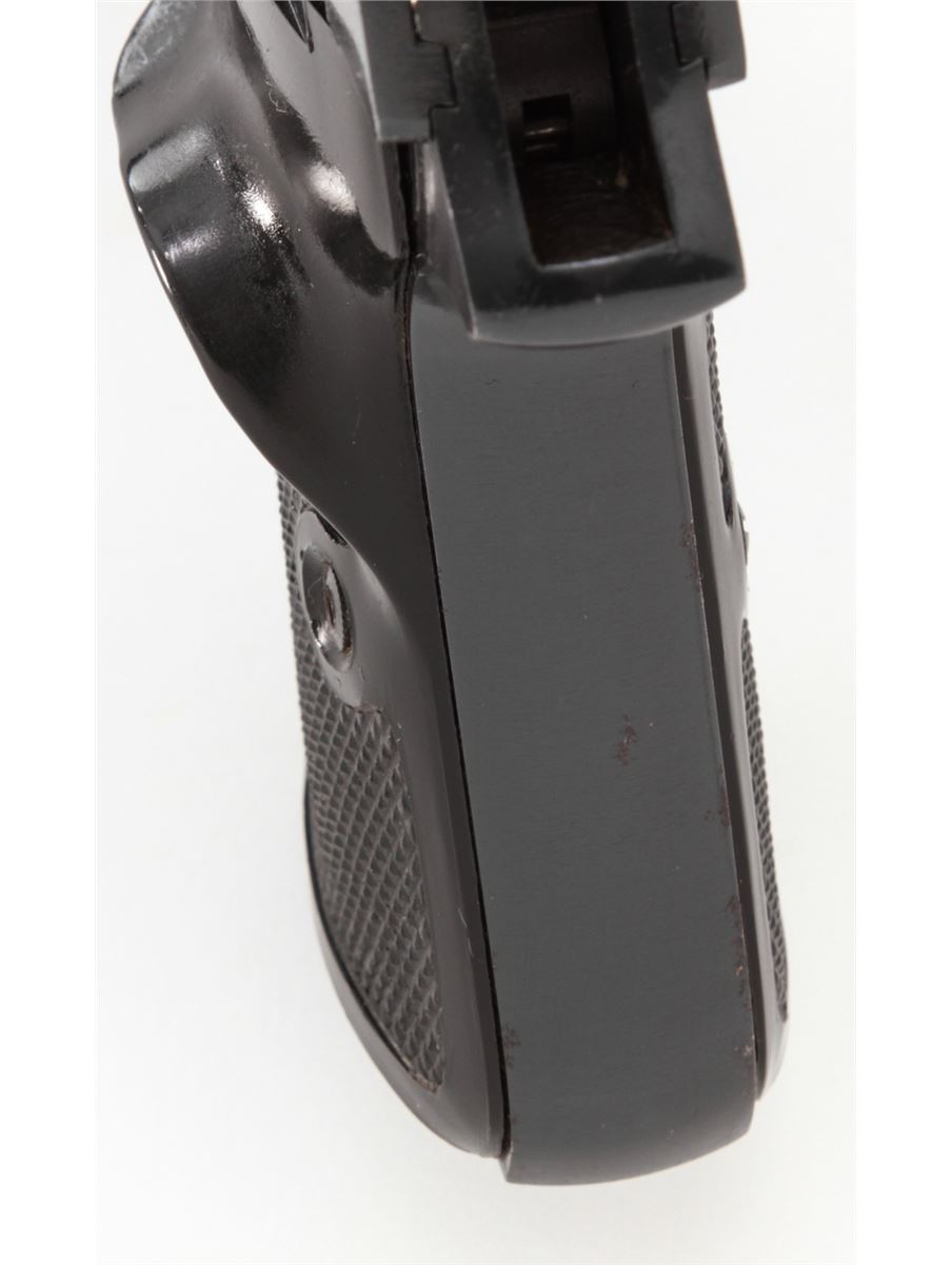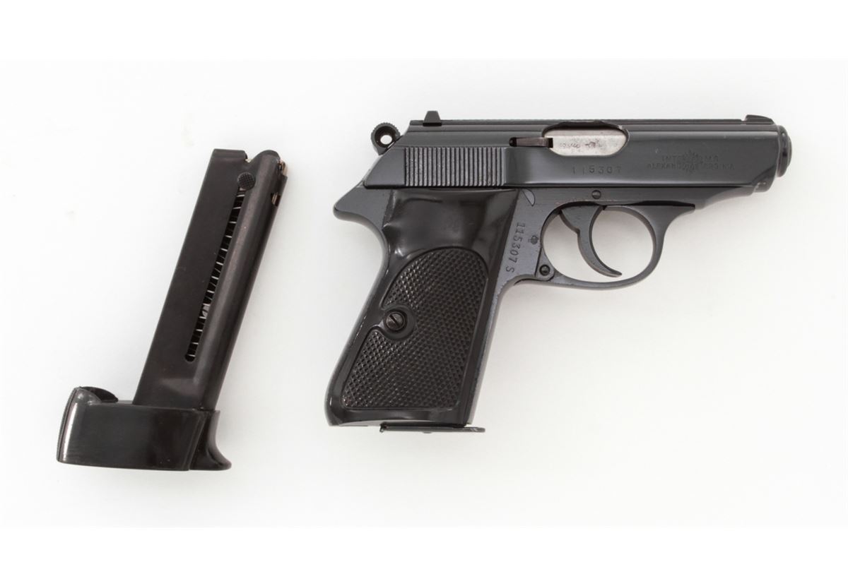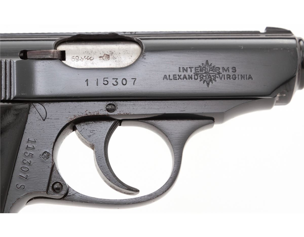 Walther PPK/S Semi-Automatic Pistol, #115307S, .22 LR cal., 3-1/4'' barrel, blue finish, factory checkered black plastic grips, two magazines (one with grip extension), in box with instructions. Pistol dates from 1969 with Interarms markings to right side of slide. Condition is near excellent showing only light marks from handling to right side of frame above trigger. Est.: $450-$600. (Modern)