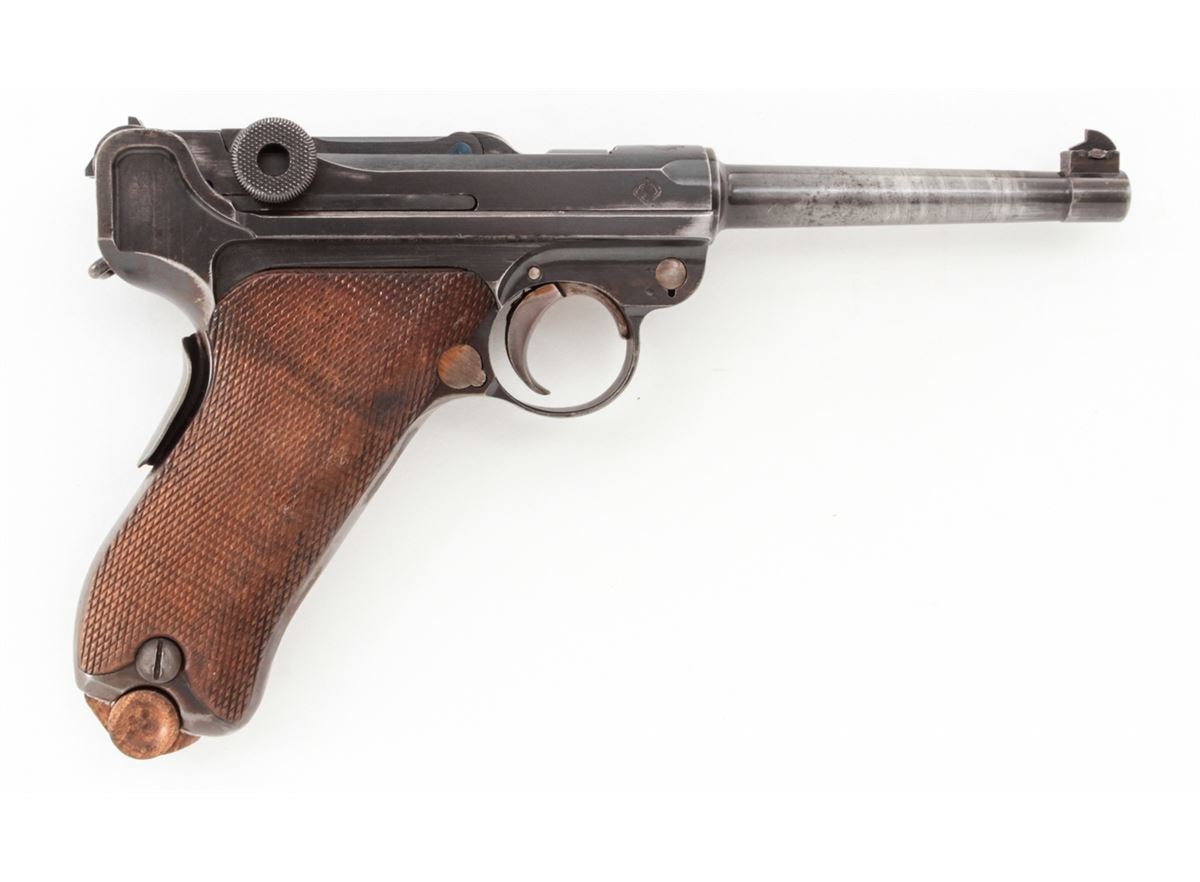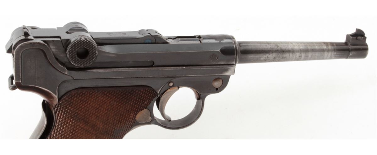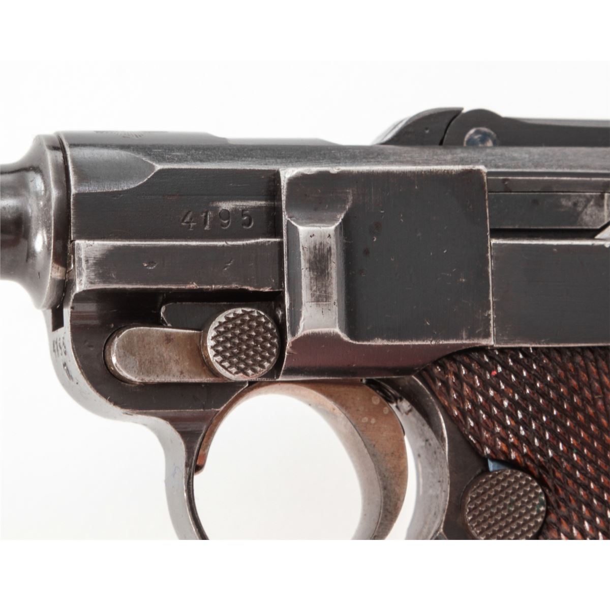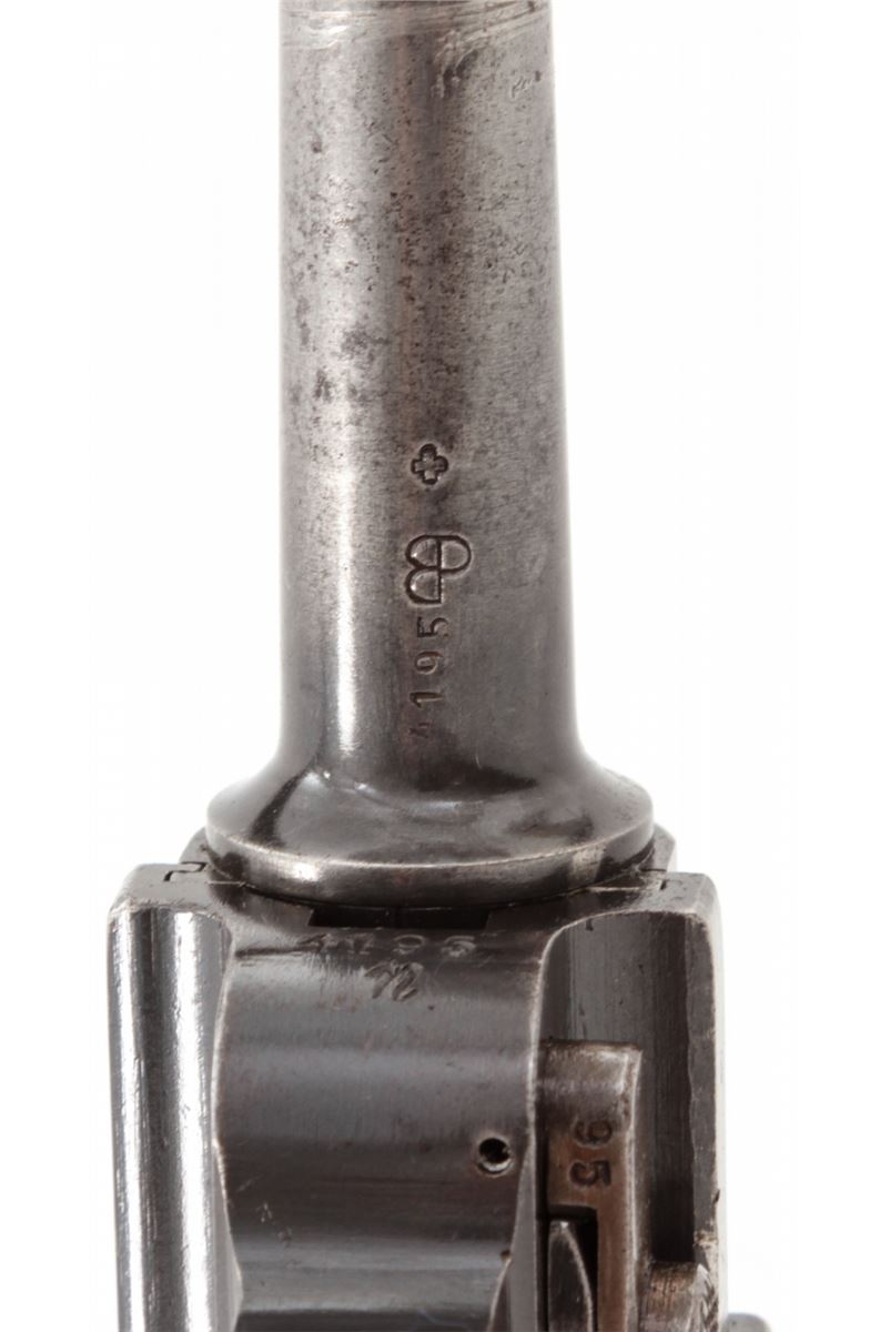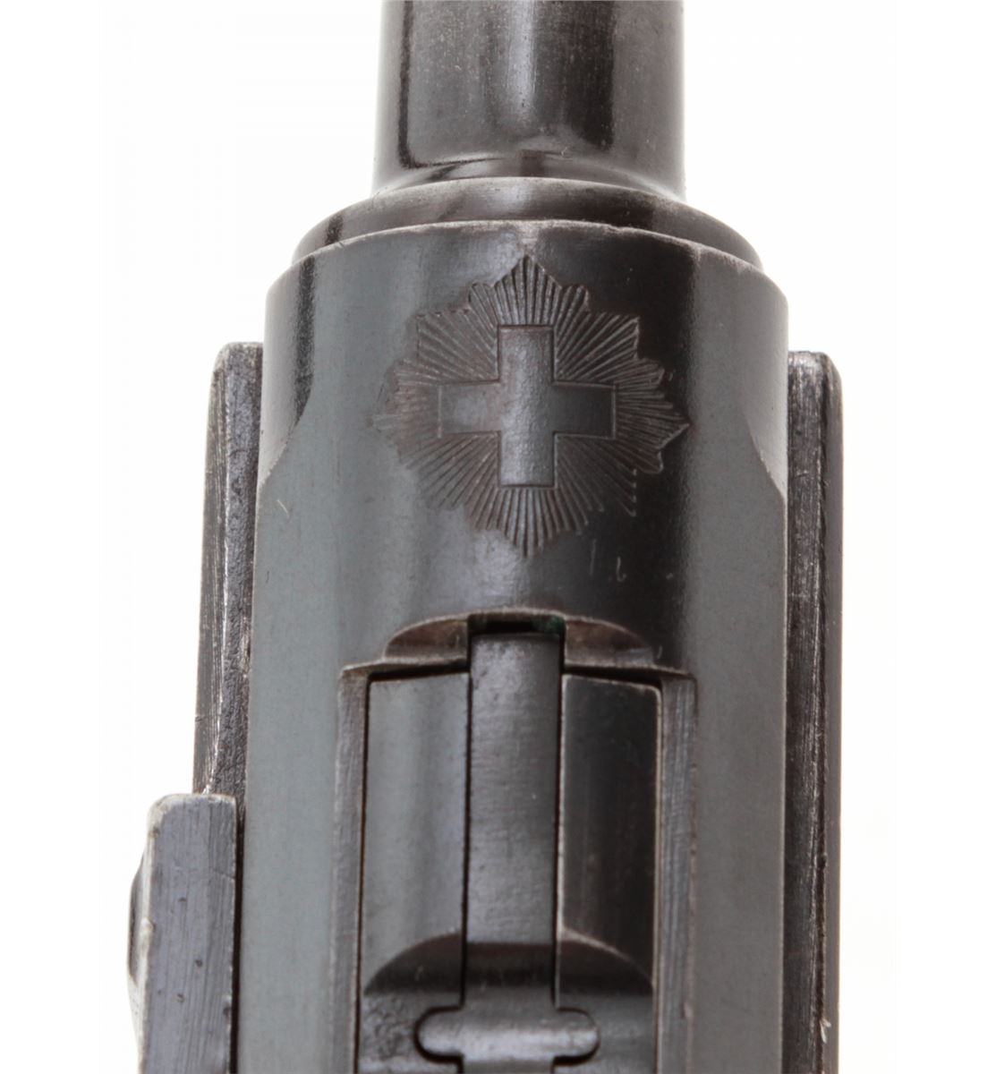 Swiss Model 1906 Luger, by DWM, #4195n, .30 Luger cal., 4-3/4'' barrel, blue finish with straw small parts, checkered walnut grips, with one wood based nickel-plated magazine. Swiss cross in sunburst in chamber area, DWM to toggle, lower thumb safety area polished bright, grip safety and round toggle knobs. Condition is very good retaining approx. 80%-85% original blue with most of the losses to barrel and to front and back strap. Barrel also shows concentric rings to forward portion. Grips with moderate flattening and additional varnish. Good action, fine bore. All visible matching numbers. Lightly import marked to right side beneath frame rail. A great .30 cal. shooter Luger. Est.: $600-$800. (C&R)