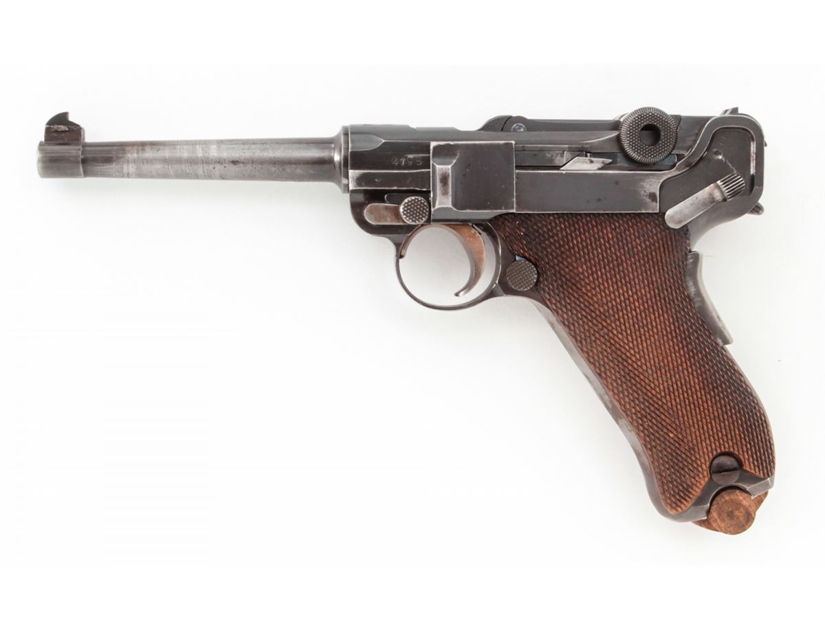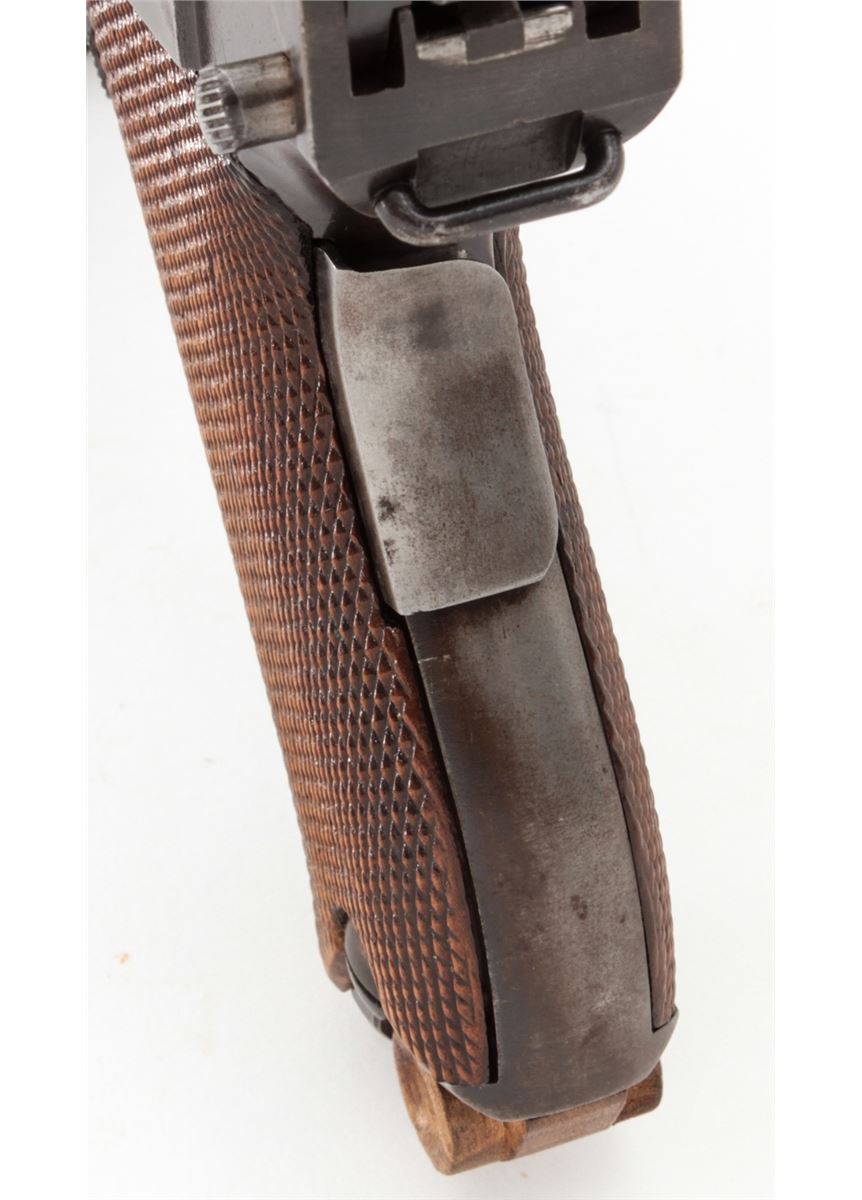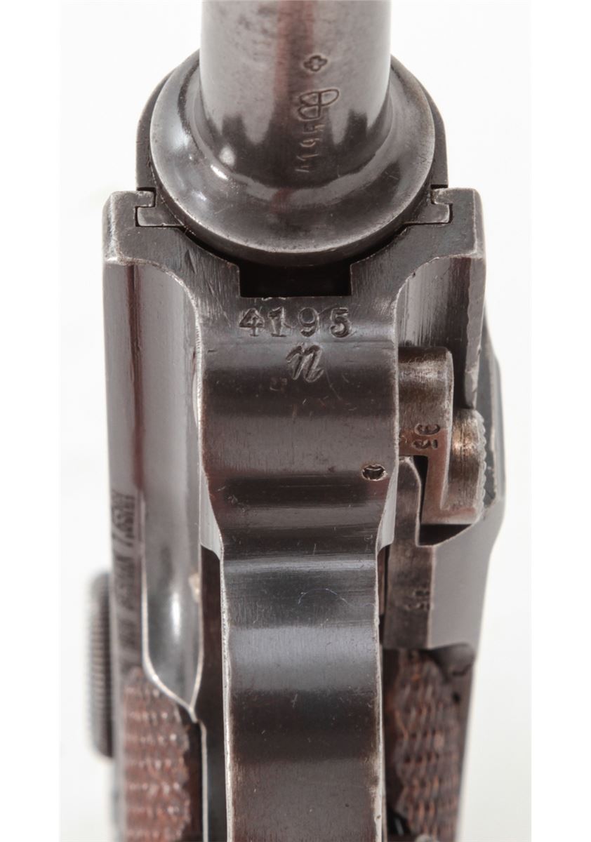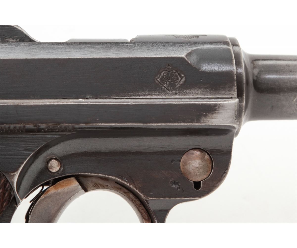 Swiss Model 1906 Luger, by DWM, #4195n, .30 Luger cal., 4-3/4'' barrel, blue finish with straw small parts, checkered walnut grips, with one wood based nickel-plated magazine. Swiss cross in sunburst in chamber area, DWM to toggle, lower thumb safety area polished bright, grip safety and round toggle knobs. Condition is very good retaining approx. 80%-85% original blue with most of the losses to barrel and to front and back strap. Barrel also shows concentric rings to forward portion. Grips with moderate flattening and additional varnish. Good action, fine bore. All visible matching numbers. Lightly import marked to right side beneath frame rail. A great .30 cal. shooter Luger. Est.: $600-$800. (C&R)