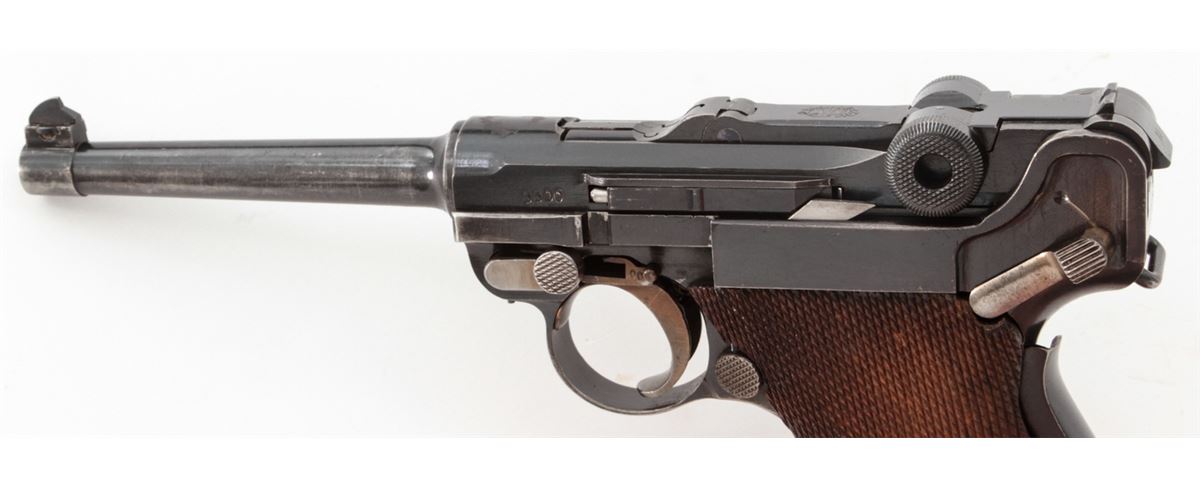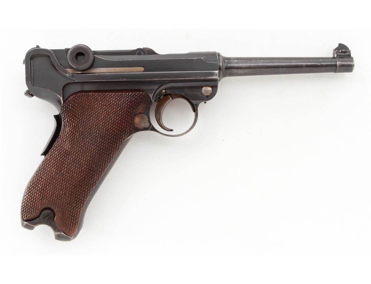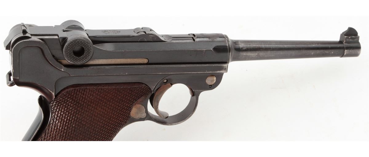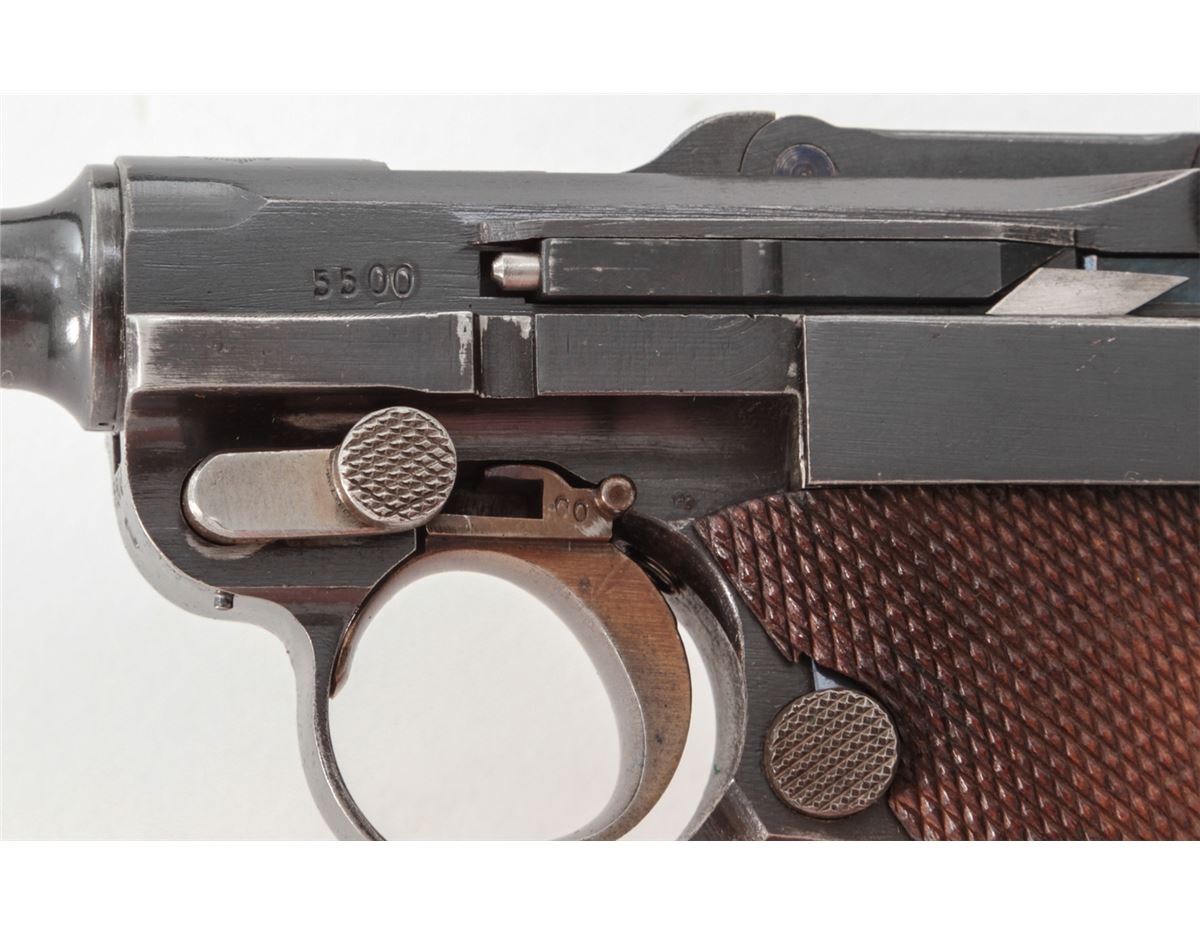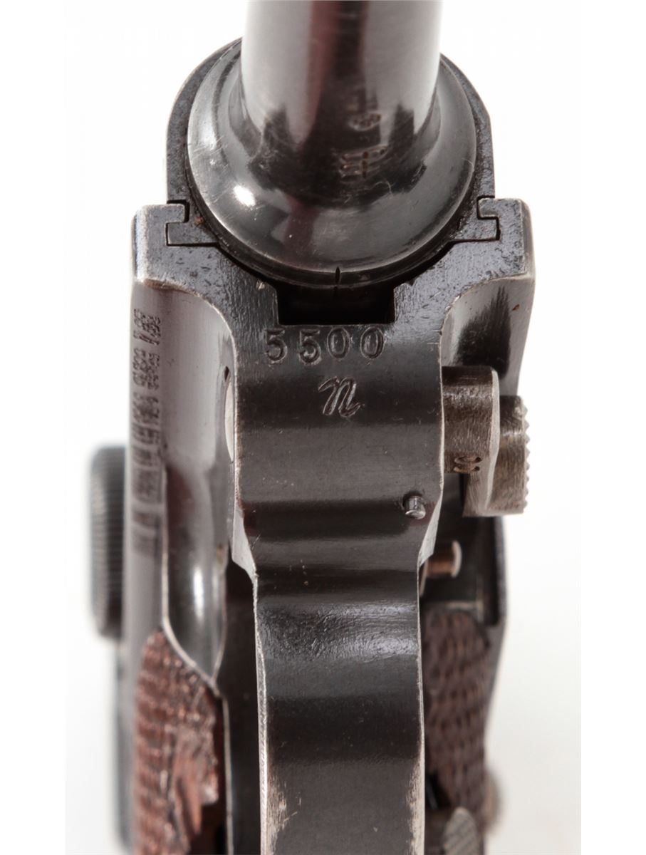 Swiss Model 06 Luger Parts/Project Gun, #5500n, .30 Luger cal., 4-3/4'' barrel, blue finish, straw small parts, checkered walnut grip panel, no mag. Considered scarce with cross and sunburst in chamber area, DWM marked toggle, lower portion of safety area polished bright. Condition is fine retaining approx. 85% blue. Missing magazine, sideplate, and grip screw, but otherwise mechanically excellent with a crisp action and fine bore. Lightly import marked to right side bottom frame rail. Est.: $350-$500. (C&R)