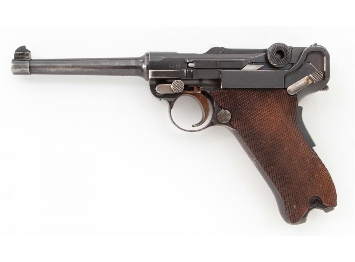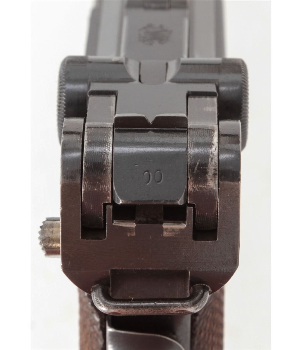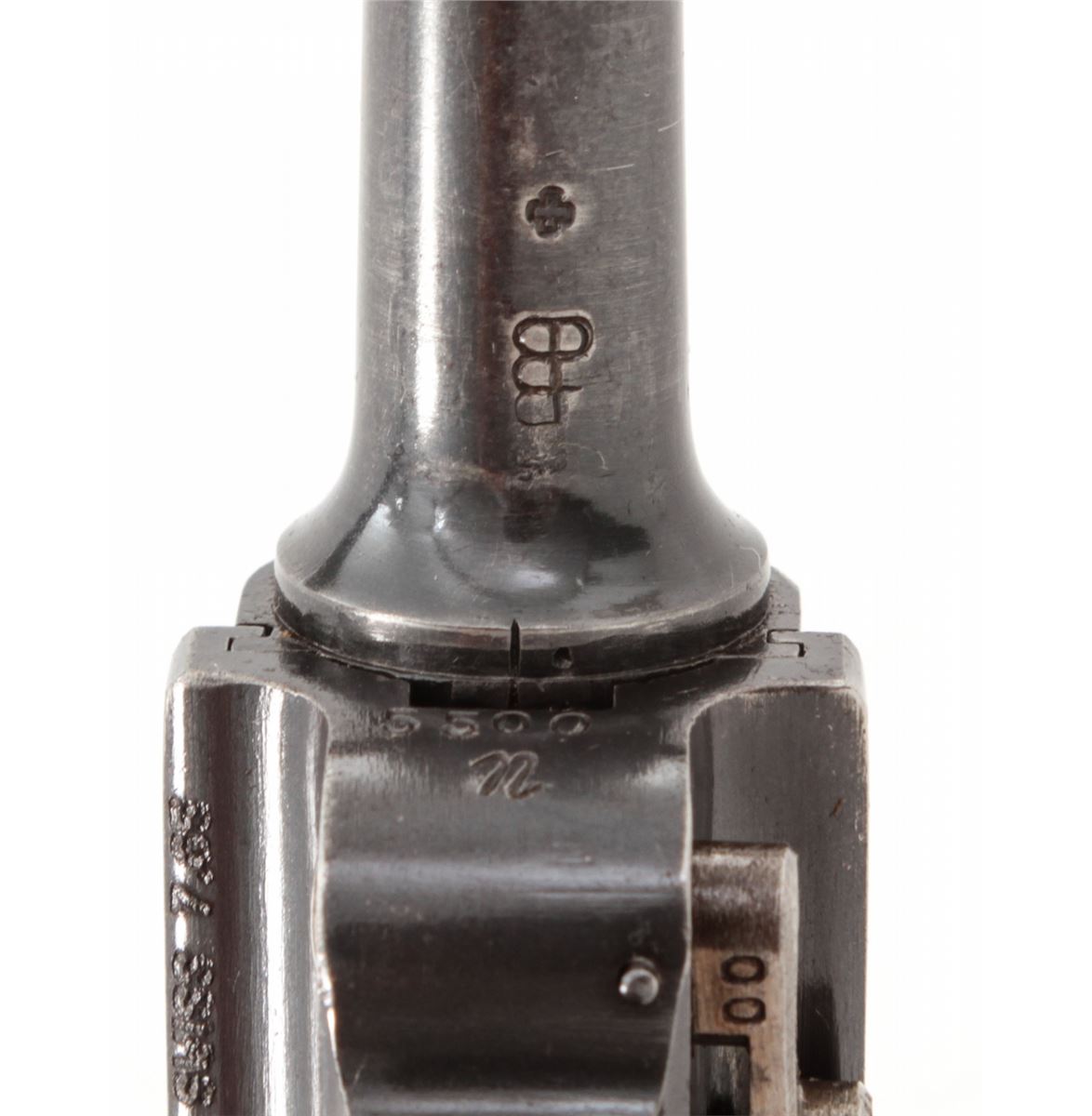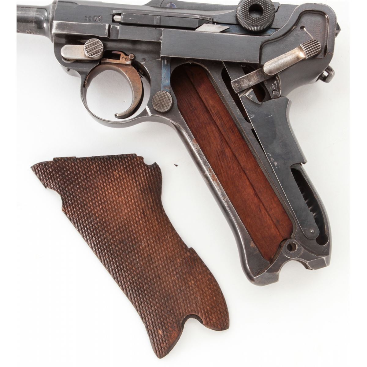 Swiss Model 06 Luger Parts/Project Gun, #5500n, .30 Luger cal., 4-3/4'' barrel, blue finish, straw small parts, checkered walnut grip panel, no mag. Considered scarce with cross and sunburst in chamber area, DWM marked toggle, lower portion of safety area polished bright. Condition is fine retaining approx. 85% blue. Missing magazine, sideplate, and grip screw, but otherwise mechanically excellent with a crisp action and fine bore. Lightly import marked to right side bottom frame rail. Est.: $350-$500. (C&R)