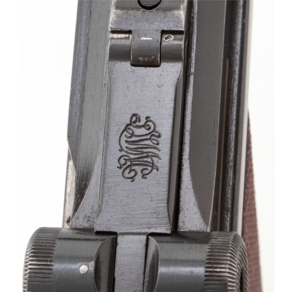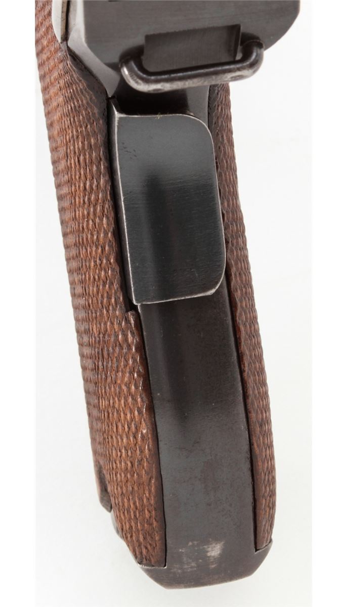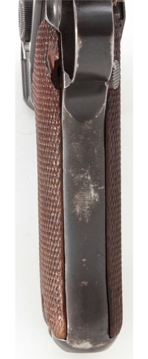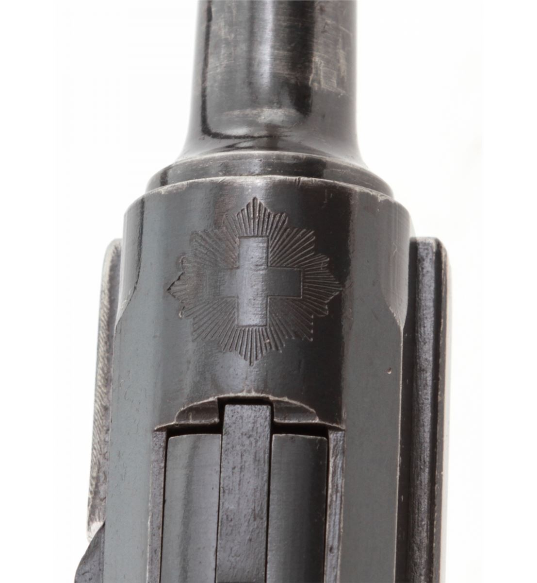 Swiss Model 06 Luger Parts/Project Gun, #5500n, .30 Luger cal., 4-3/4'' barrel, blue finish, straw small parts, checkered walnut grip panel, no mag. Considered scarce with cross and sunburst in chamber area, DWM marked toggle, lower portion of safety area polished bright. Condition is fine retaining approx. 85% blue. Missing magazine, sideplate, and grip screw, but otherwise mechanically excellent with a crisp action and fine bore. Lightly import marked to right side bottom frame rail. Est.: $350-$500. (C&R)