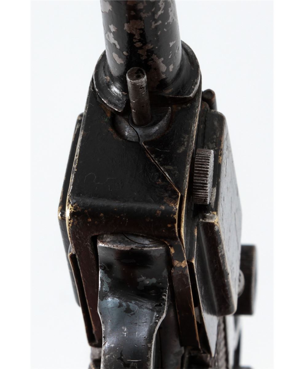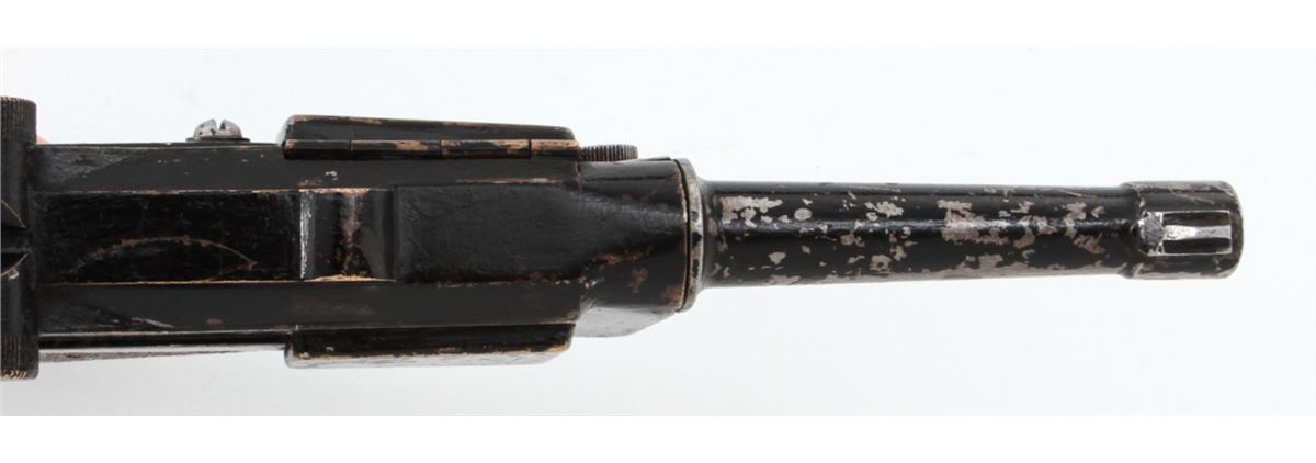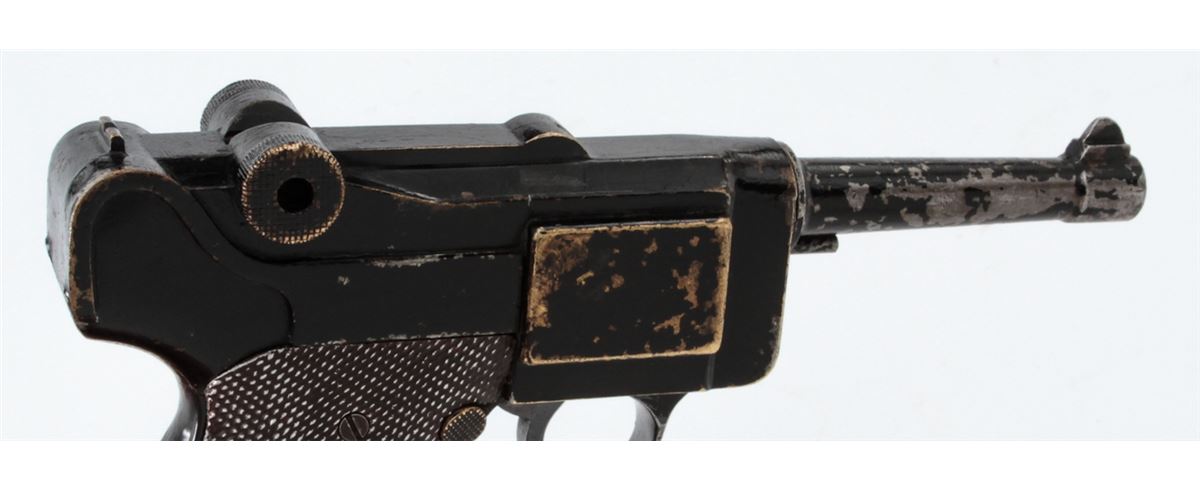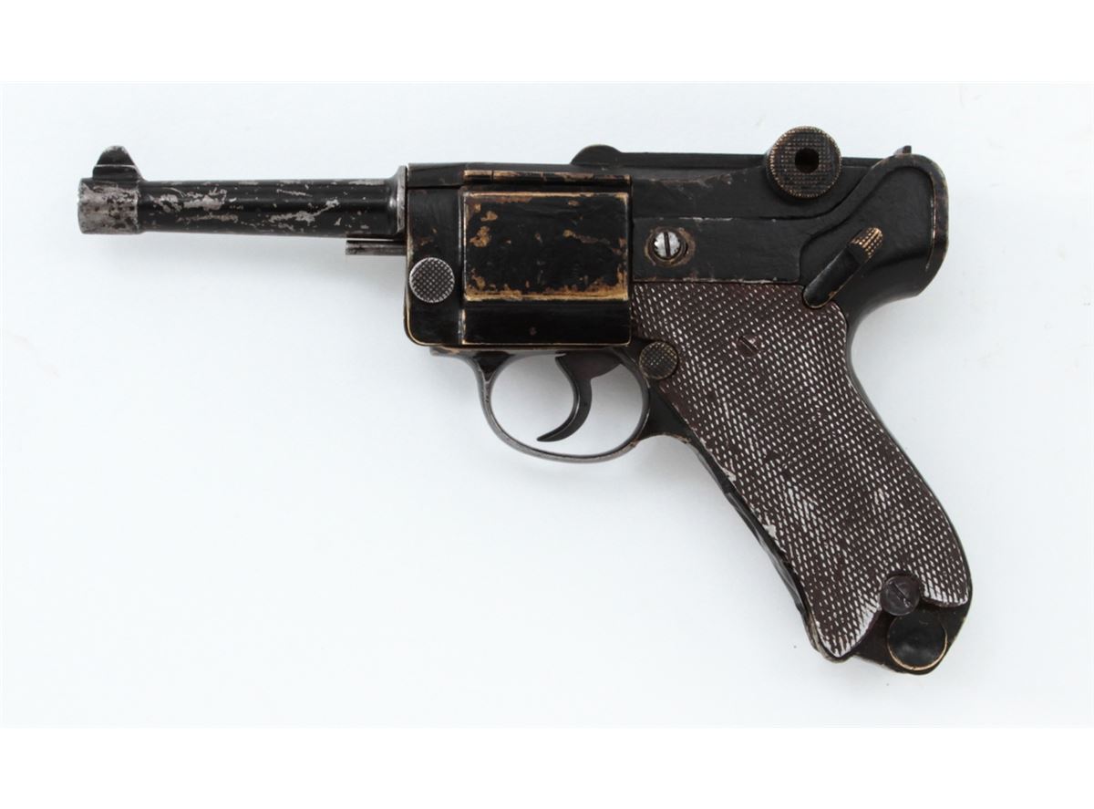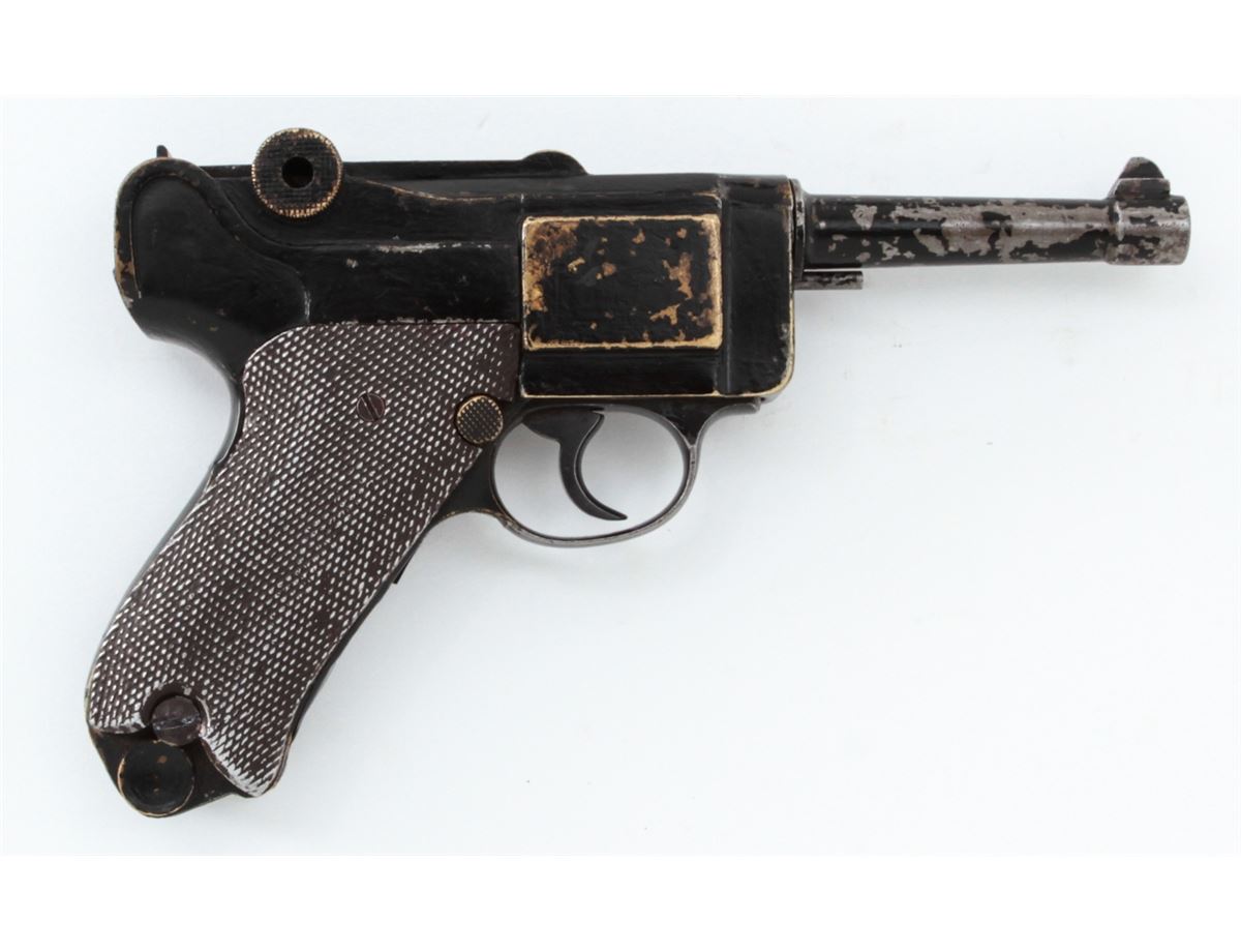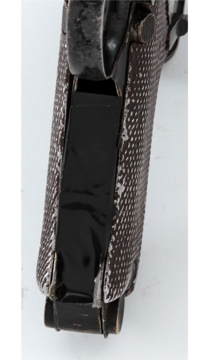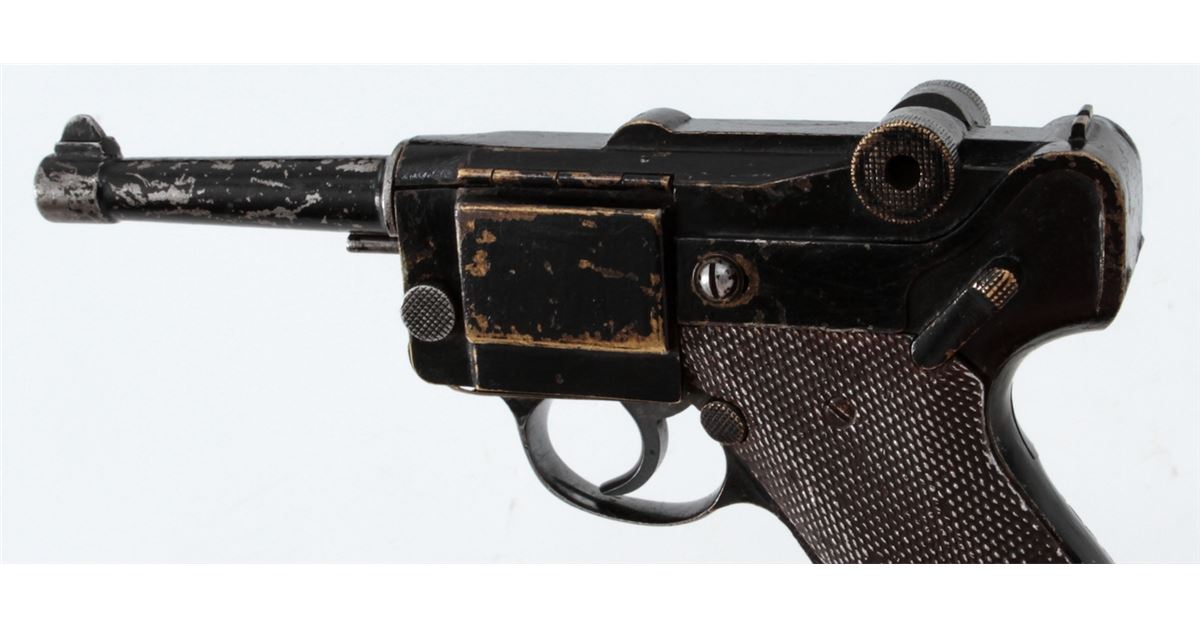 Stembridge Movie Prop Luger Replica, based on Colt's Pocket Positive, NVSN, .32 cal., brass metal and aluminum copy of a Luger Semi-Automatic Pistol, but houses inside a .32 cal. Colt Double Action Revolver, with ''S'' (Stembridge) inside crane of revolver. Originally sold when the Stembridge collection was broken up in 2007, and seen in WWII era Warner Bros. movies in the hands of both German and Japanese characters. Condition is good with losses to paint and old electrician's tape covering up the channel between the grips. Est.: $350-$500. (Antique)