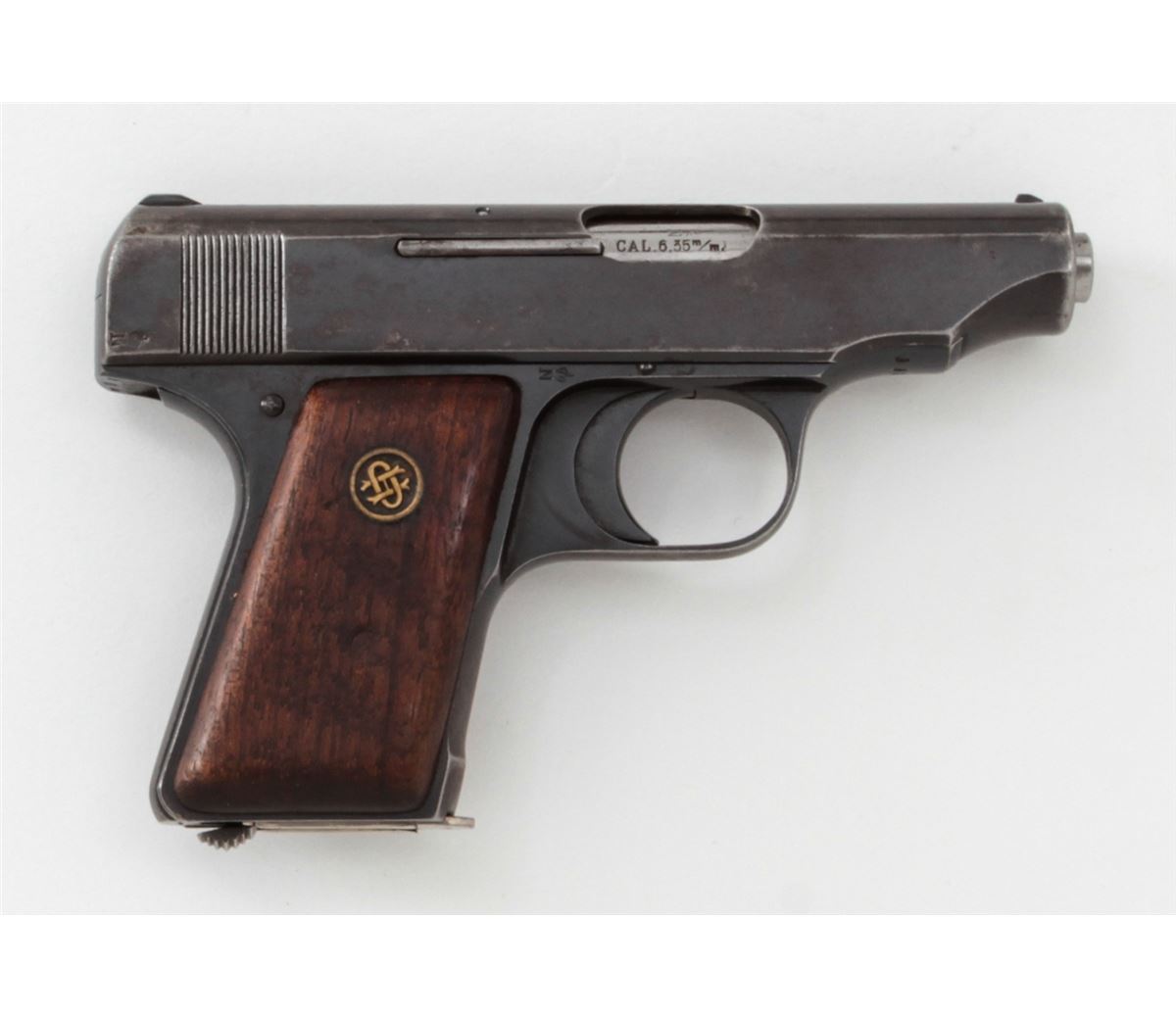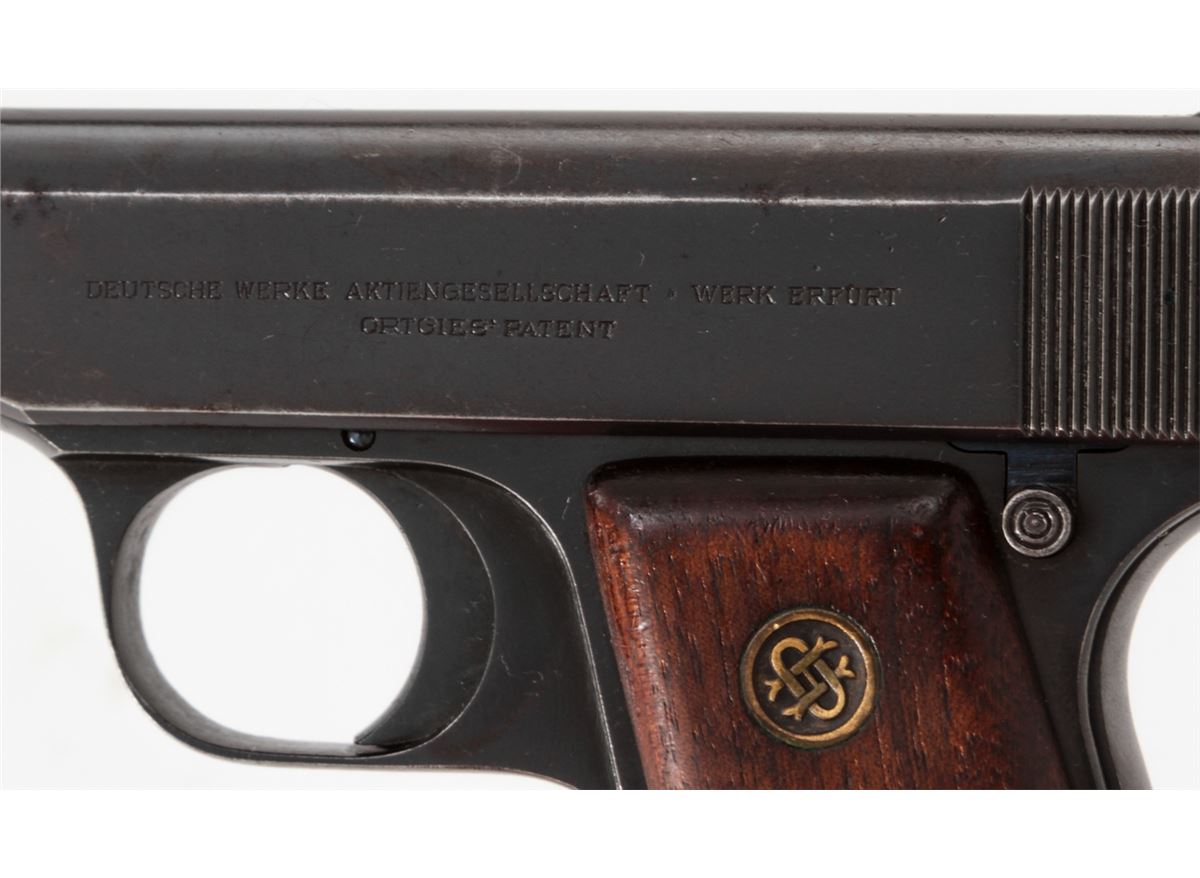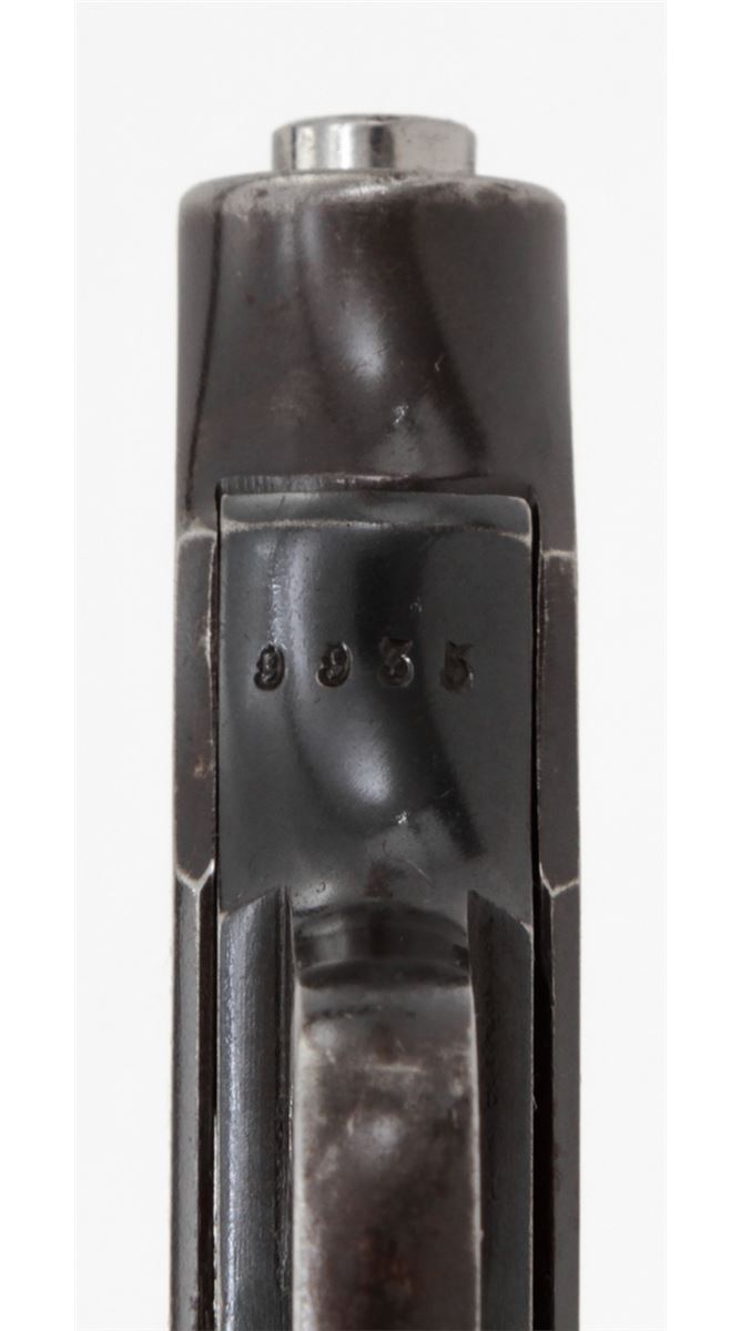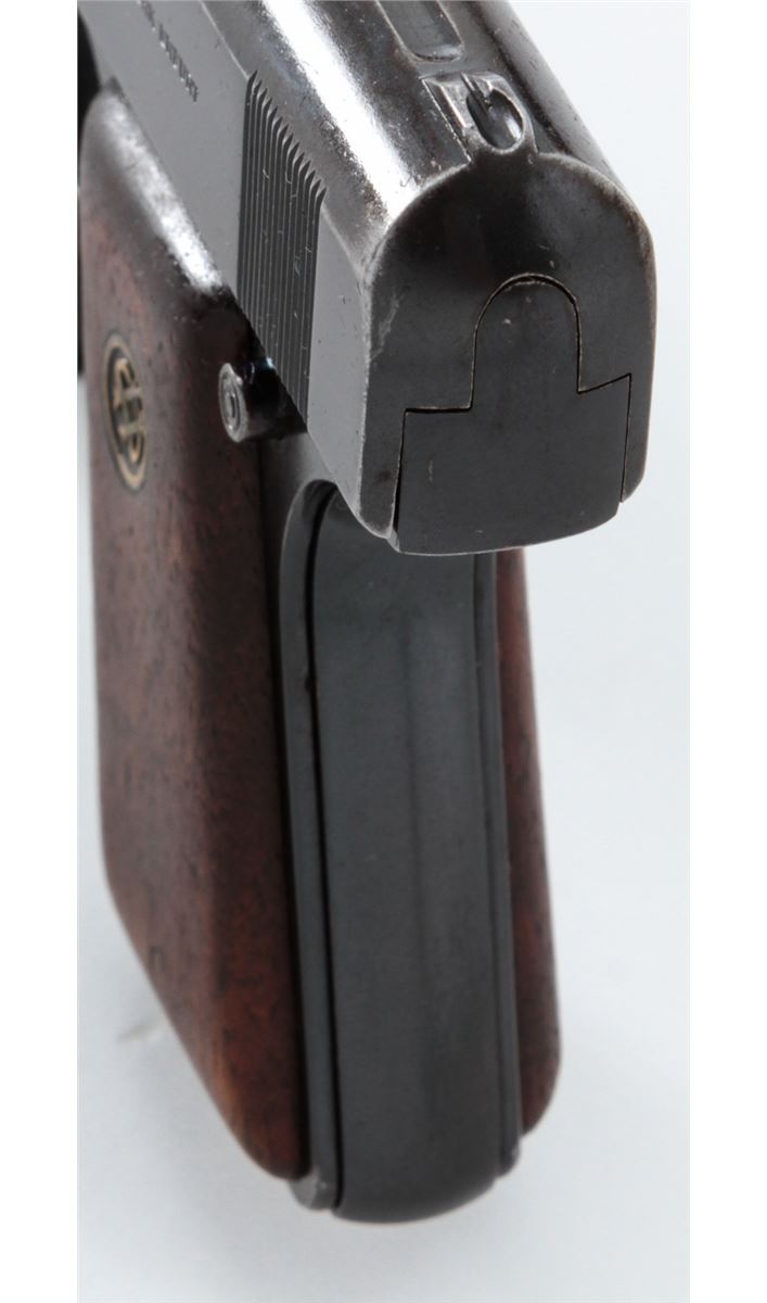 Ortgies Semi-Automatic Pistol, #9935, .25 Auto cal., 2-1/2'' barrel, blue finish, smooth walnut grips with Ortgies medallions, and one correct nickel-plated magazine. Condition is very good retaining approx. 92% blue. Grips with thinning to varnish and some oil staining. Crisp action, fine bore. Est.: $250-$400. (C&R)