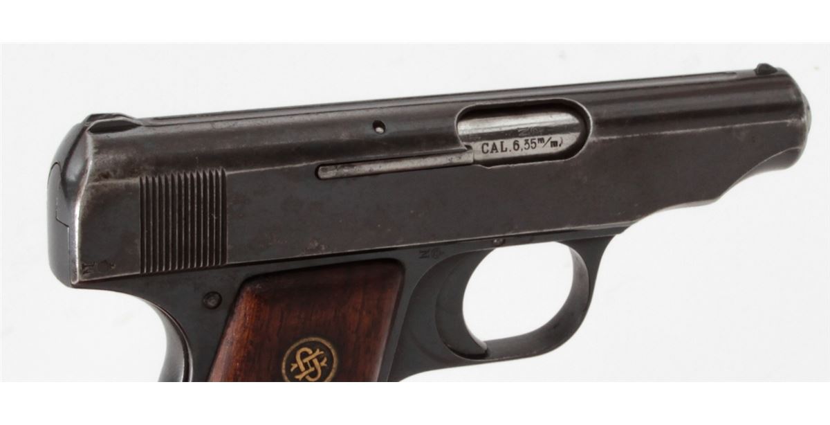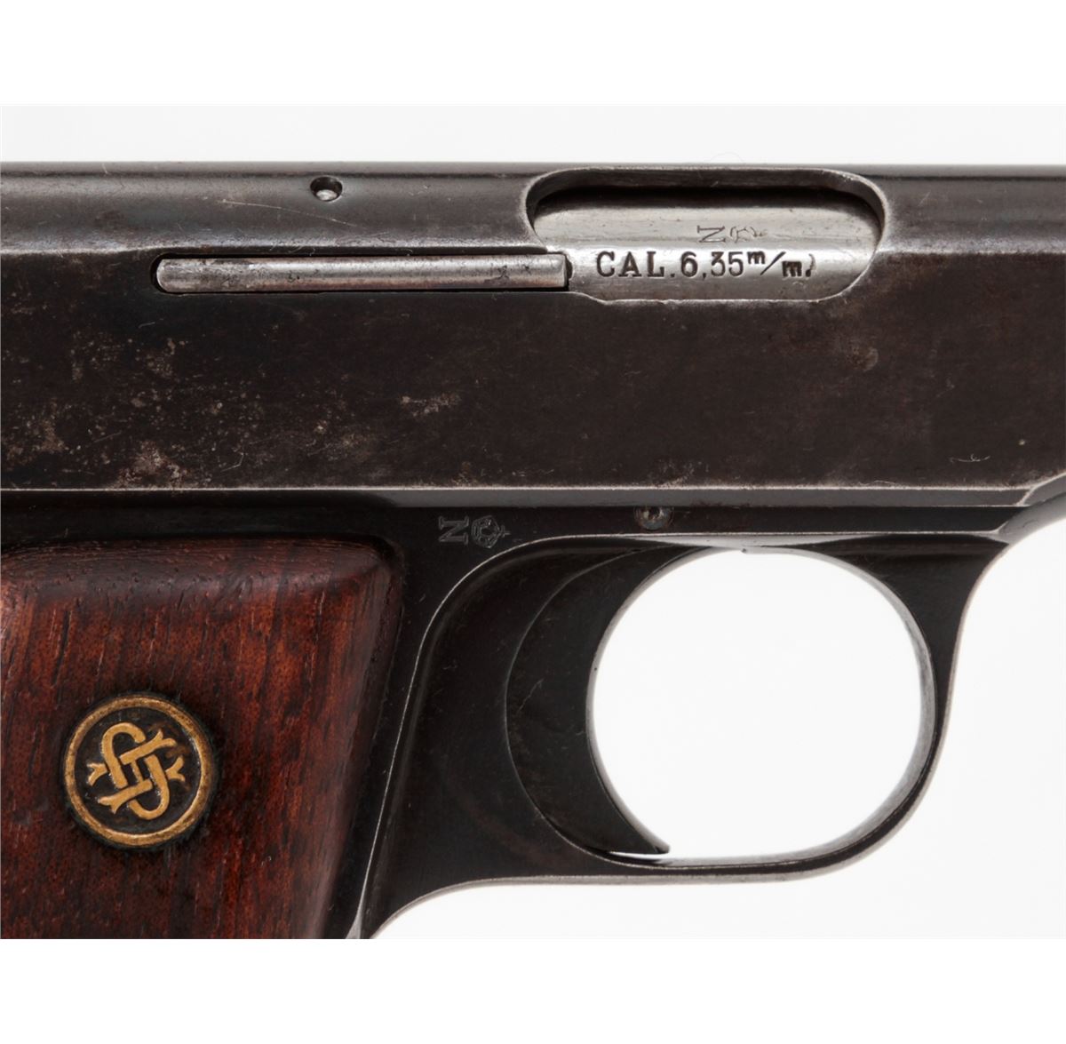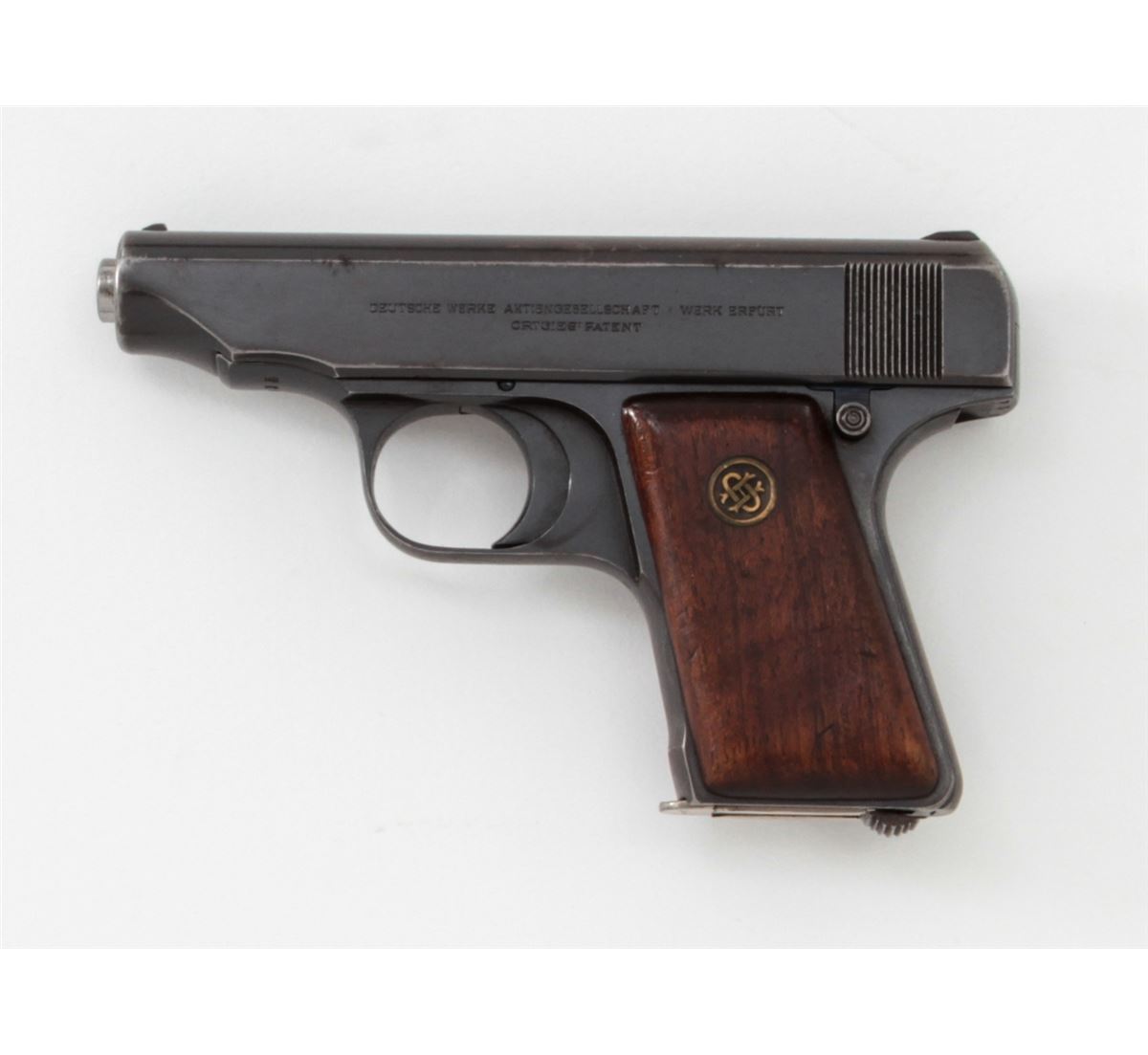 Ortgies Semi-Automatic Pistol, #9935, .25 Auto cal., 2-1/2'' barrel, blue finish, smooth walnut grips with Ortgies medallions, and one correct nickel-plated magazine. Condition is very good retaining approx. 92% blue. Grips with thinning to varnish and some oil staining. Crisp action, fine bore. Est.: $250-$400. (C&R)