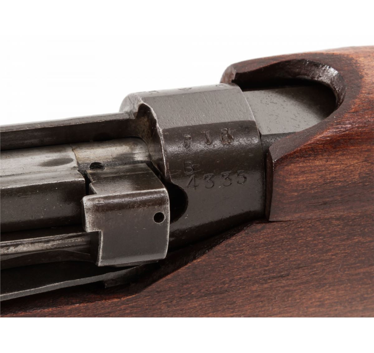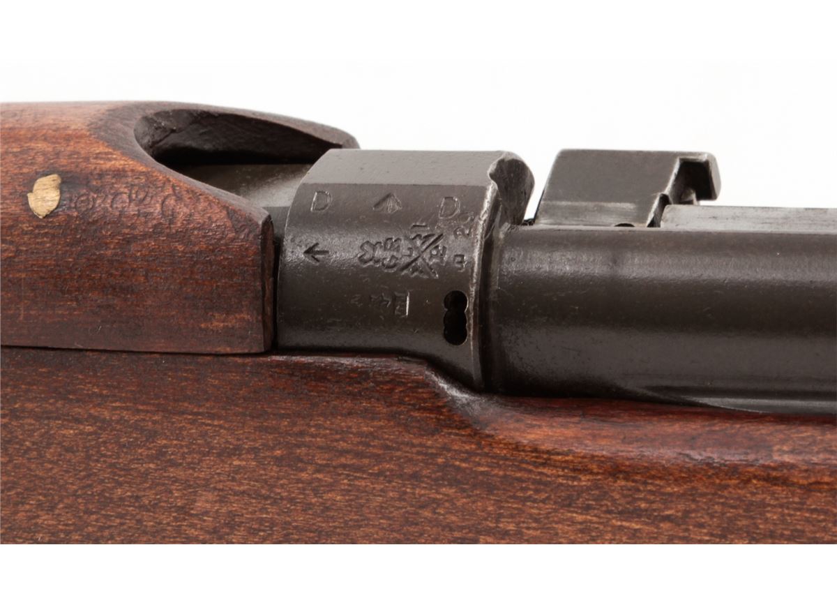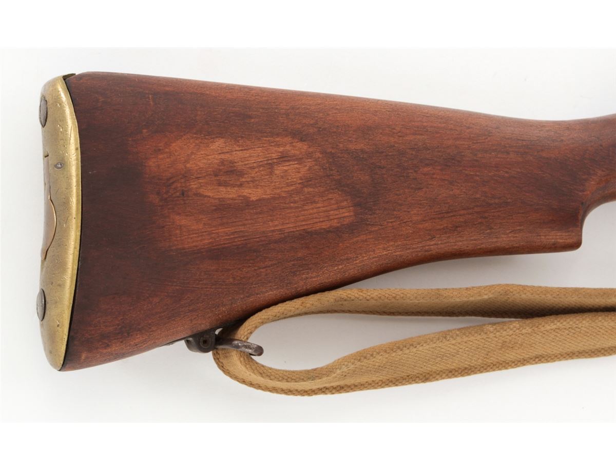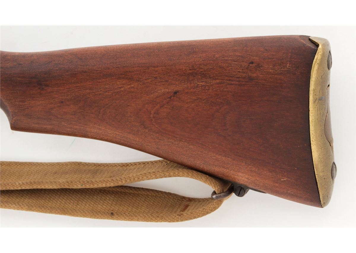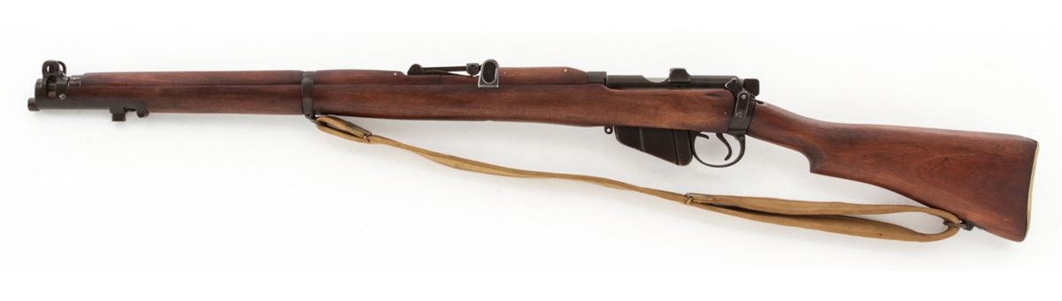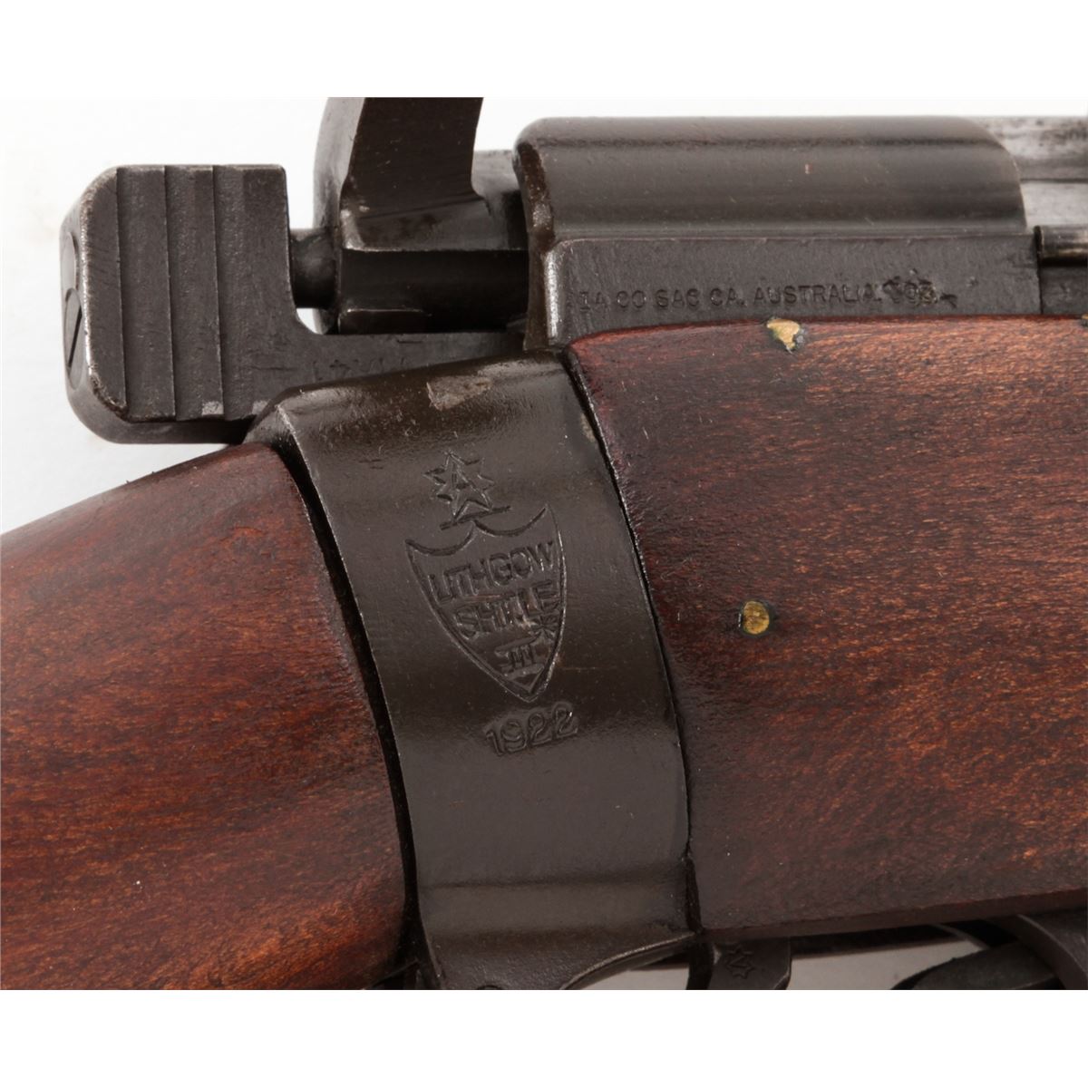 Australian No. 1 MK III Bolt Action Rifle, by Lithgow (1922), #B4335, .303 cal., 25'' barrel, phosphate finish, dark stained birch stock, with sling. Condition is very good, as probably overhauled at one point. Rifle retains approx. 95% phosphate finish. Stock with just the lightest marks from handling. Crisp action, fine bore. Lightly import marked. Est.: $400-$600. (C&R)
