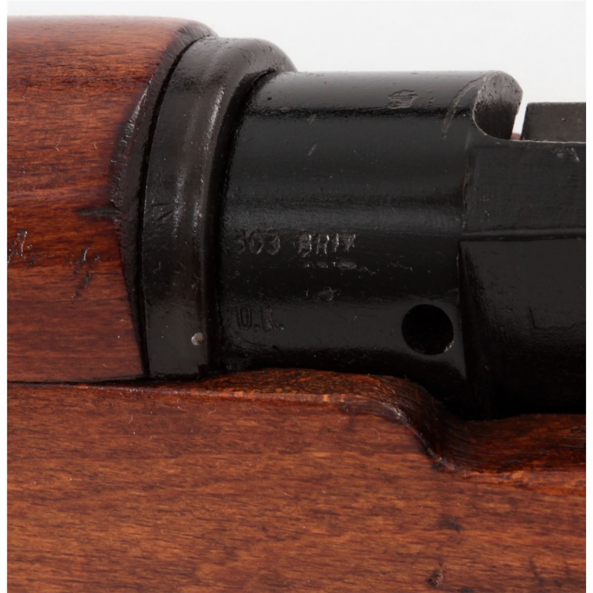 British No. 4 MK II (F) Bolt Action Rifle, #PF215904, .303 cal., 25'' barrel, stove black finish, dark stained birch stock. Condition is about very good as import marked with approx. 95% post-war black finish. Birch stock with light scuffs and scratches. Good action, fine bore. Est.: $200-$400. (C&R)