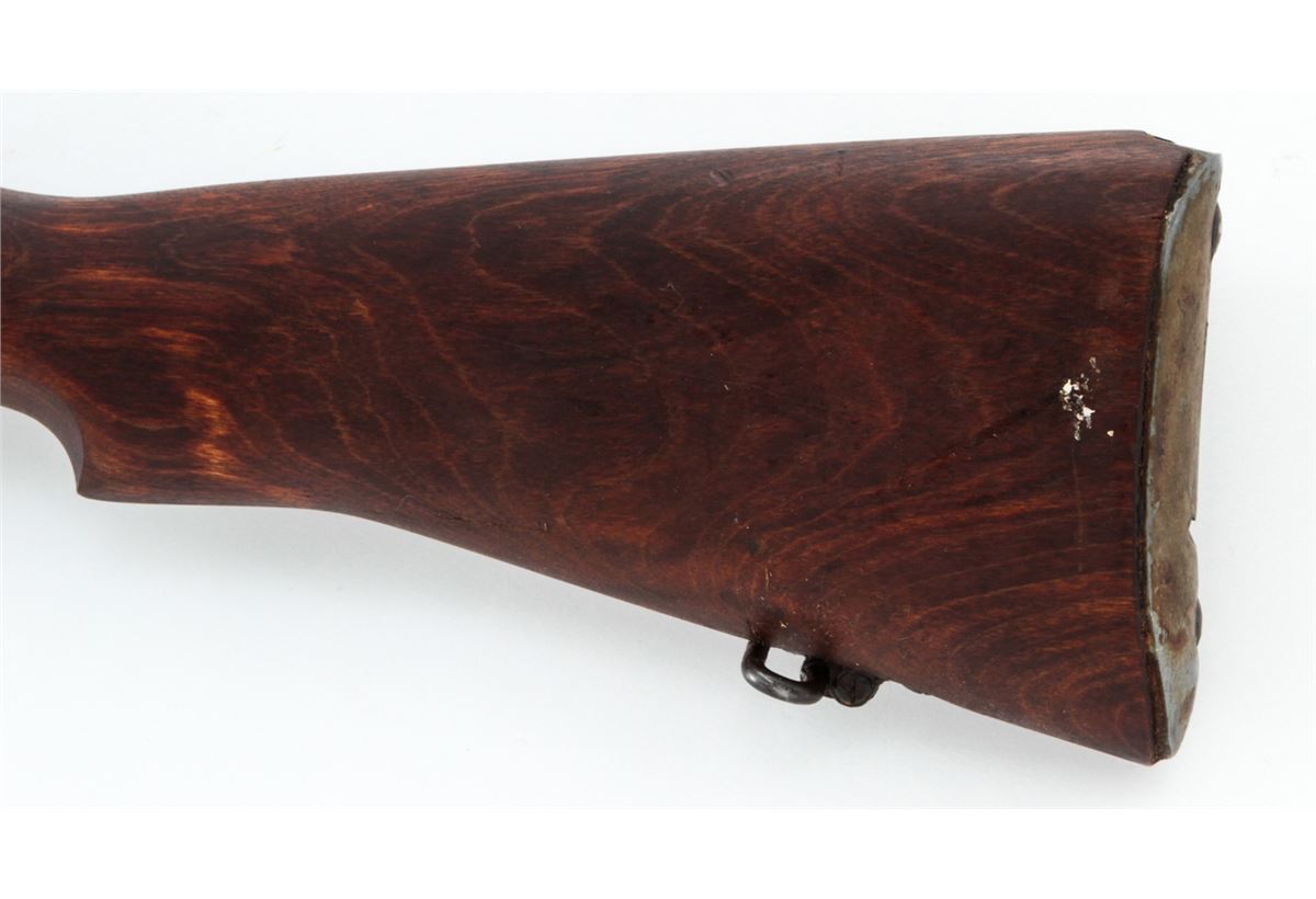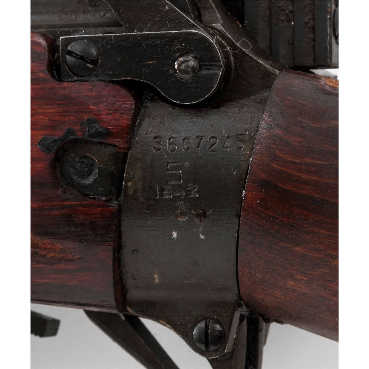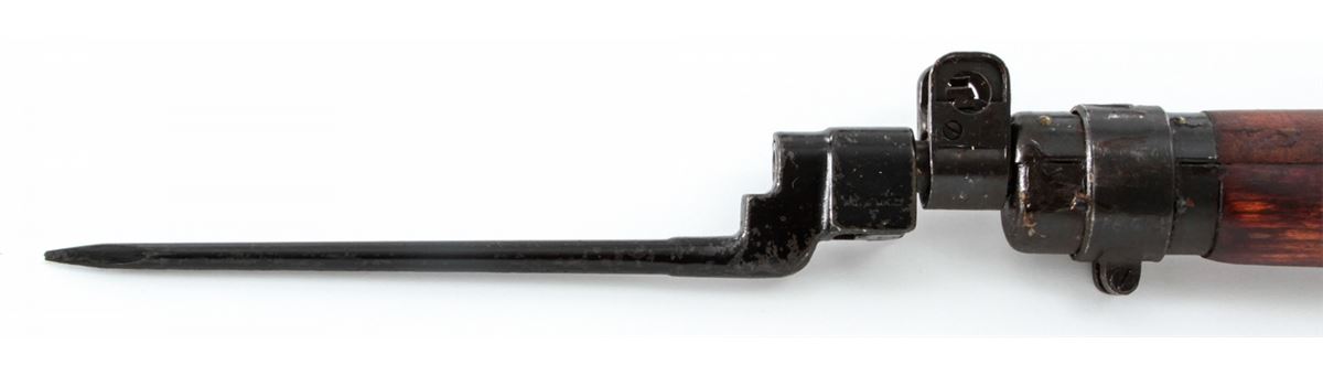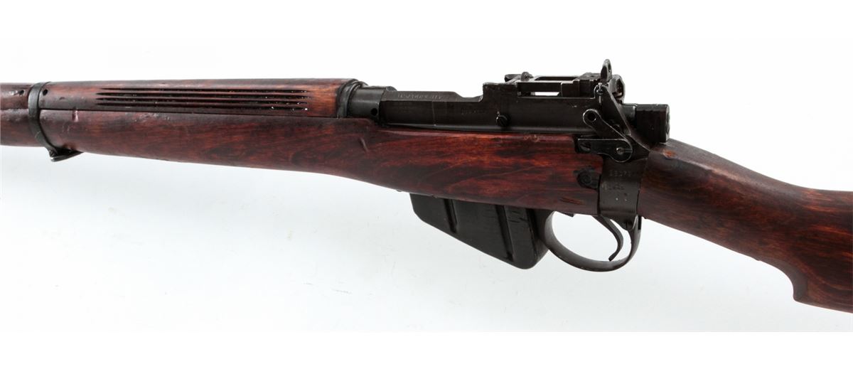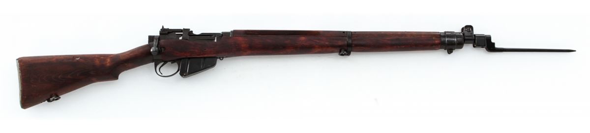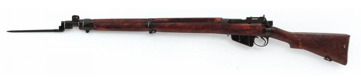 Savage made No. 4 MK I* Bolt Action Rifle, #3607245 (1942), .303 cal., 25'' barrel, phosphate finish, dark stained birch stock, and light importation markings to forward portion of receiver. Condition is excellent as overhauled retaining much of its arsenal preservative grease. Stock shows light impressions from handling. Good action, mirror bright bore. Rifle needs a thorough cleaning. Spike bayonet is included. Est.: $300-$500. (C&R)