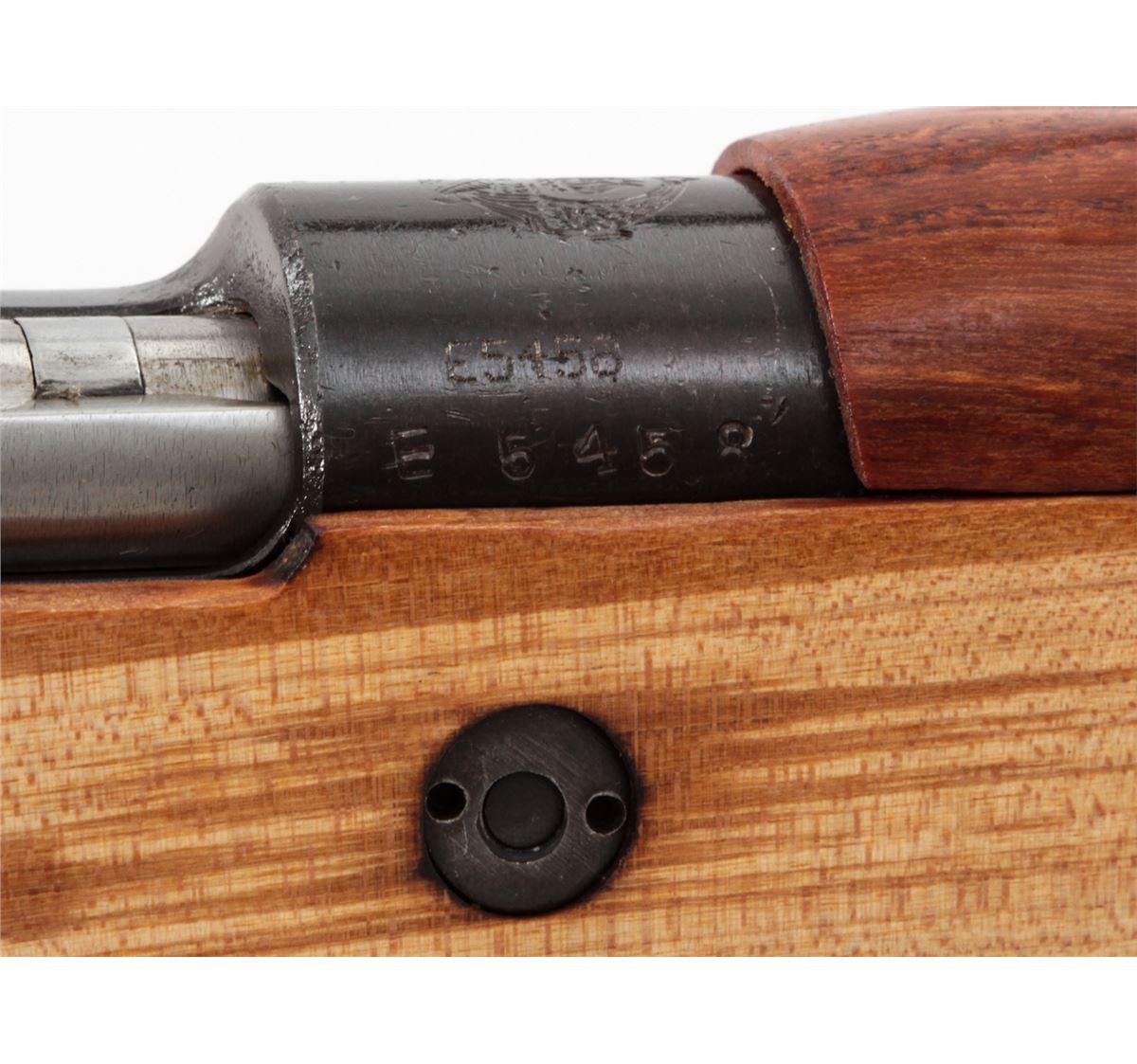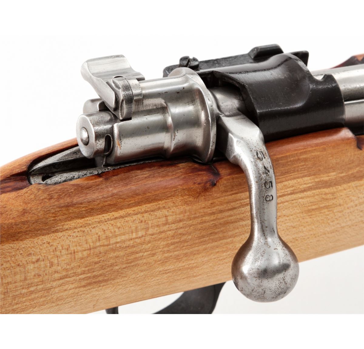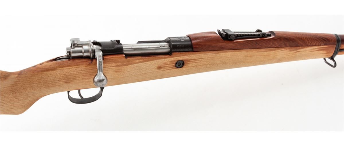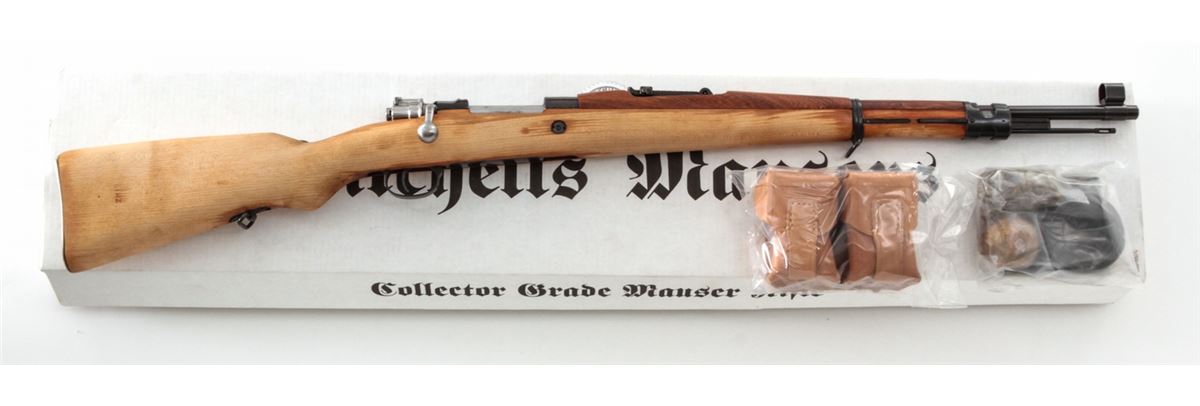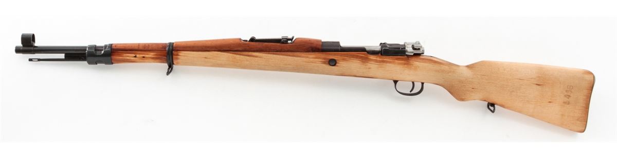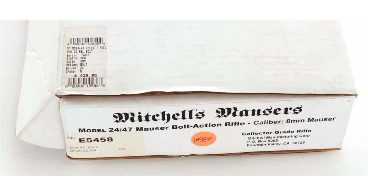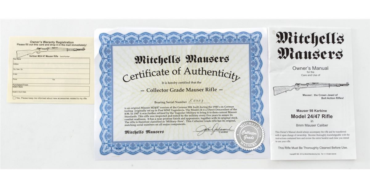 Yugoslavian M24/47 Mauser Bolt Action Rifle, #E5458, 8mm, 24'' barrel, blue finish, light colored beech stock. Condition is excellent, as imported by Mitchell's Mausers. Complete in its original box with accessories and letter of authenticity. Est.: $250-$400. (C&R)