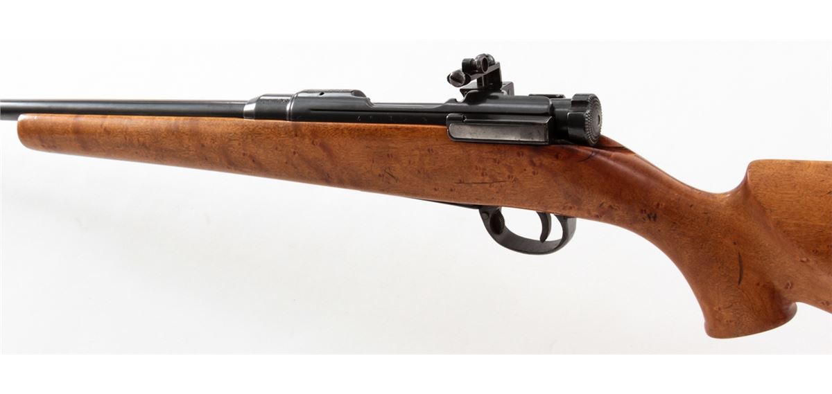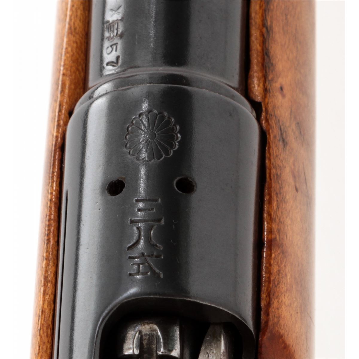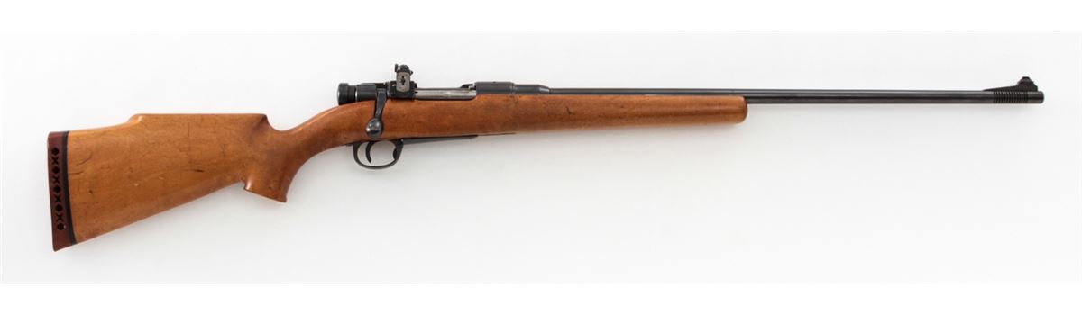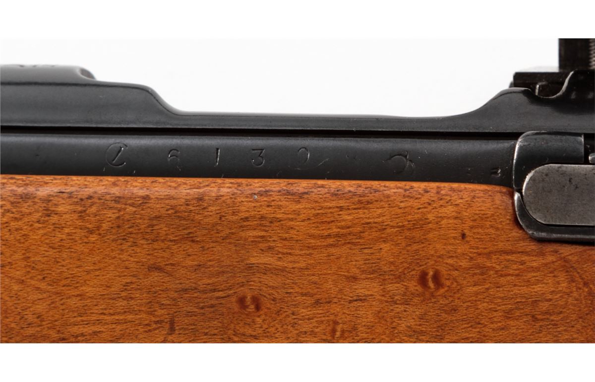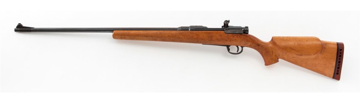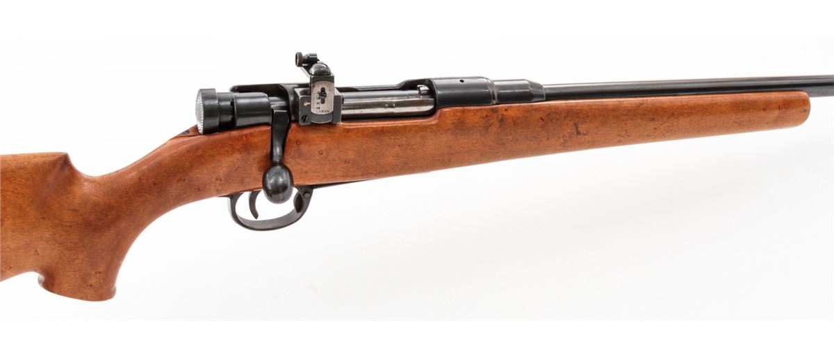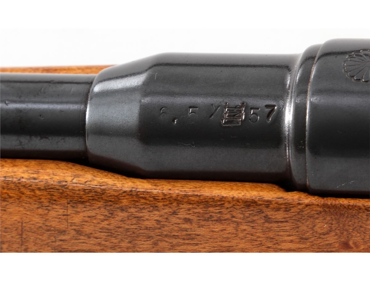 Japanese Type 37 Sporterized Bolt Action Rifle, #61308, 6.5x57 cal., 25'' compensated barrel, blue finish, cheekpiece maple stock, with Lyman peep sight and brass bead ramp front sight. As hobbyist made in the 1950s. Condition is very good as modified and refinished. Action is crisp, bore is good. Est.: $75-$150. (C&R)