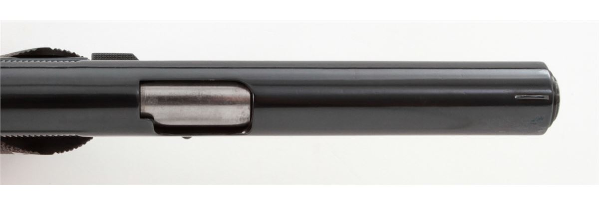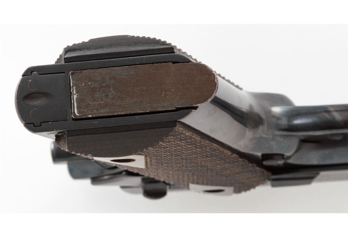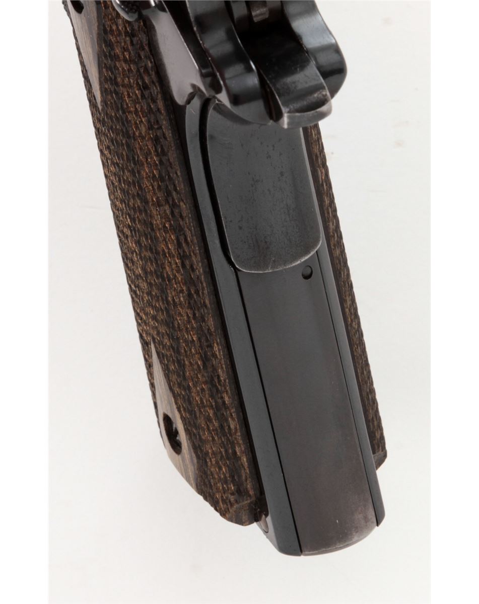U.S. Model 1911 Semi-Automatic Pistol, by Springfield, #114946, .45 ACP cal., 5'' barrel, blue finish, aftermarket diamond checkered grips, with post-WWII era magazine. Condition is very good as immersion blue refinish, retaining approx. 98% later blue, with 1916 era Colt slide and mixed parts. Modern grips are fine. Action is crisp, bore is bright. Est.: $500-$750. (C&R)