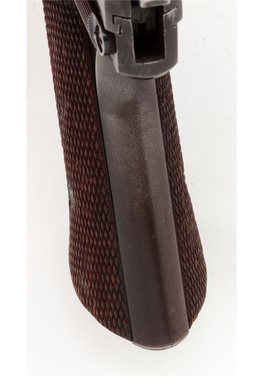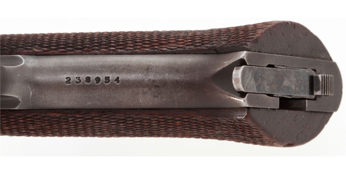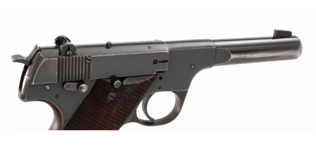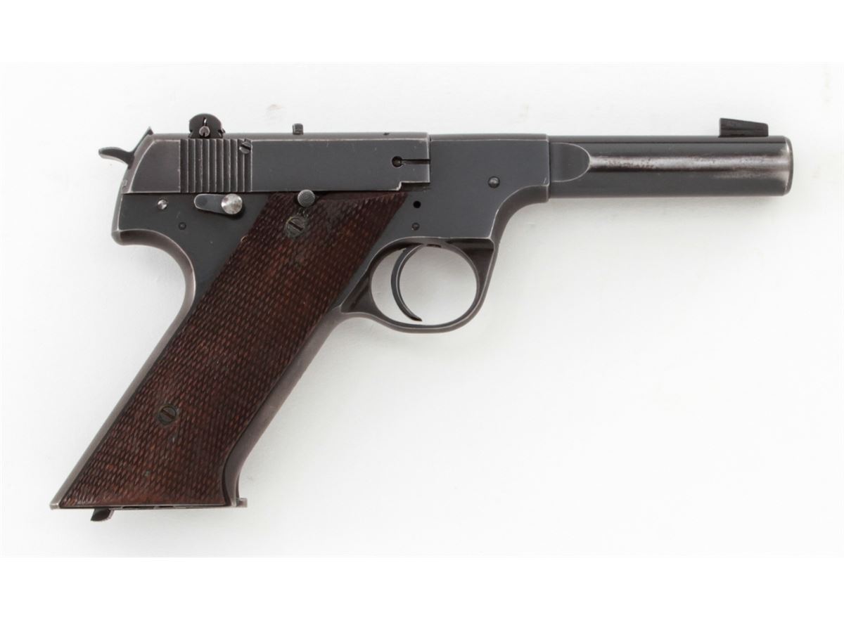 High Standard Model H-D Military Semi-Automatic Pistol, #238954, .22 LR cal., 4-1/2'' bull barrel, blue finish, checkered walnut grips, with one magazine. Condition is about fine retaining approx. 90% blue with almost all the losses to high sides of barrel, front and backstrap. Grips with just moderate flattening. Good action, bright bore. One of the most popular post-war sporting pistols. Est.: $400-$600. (C&R/PPT)