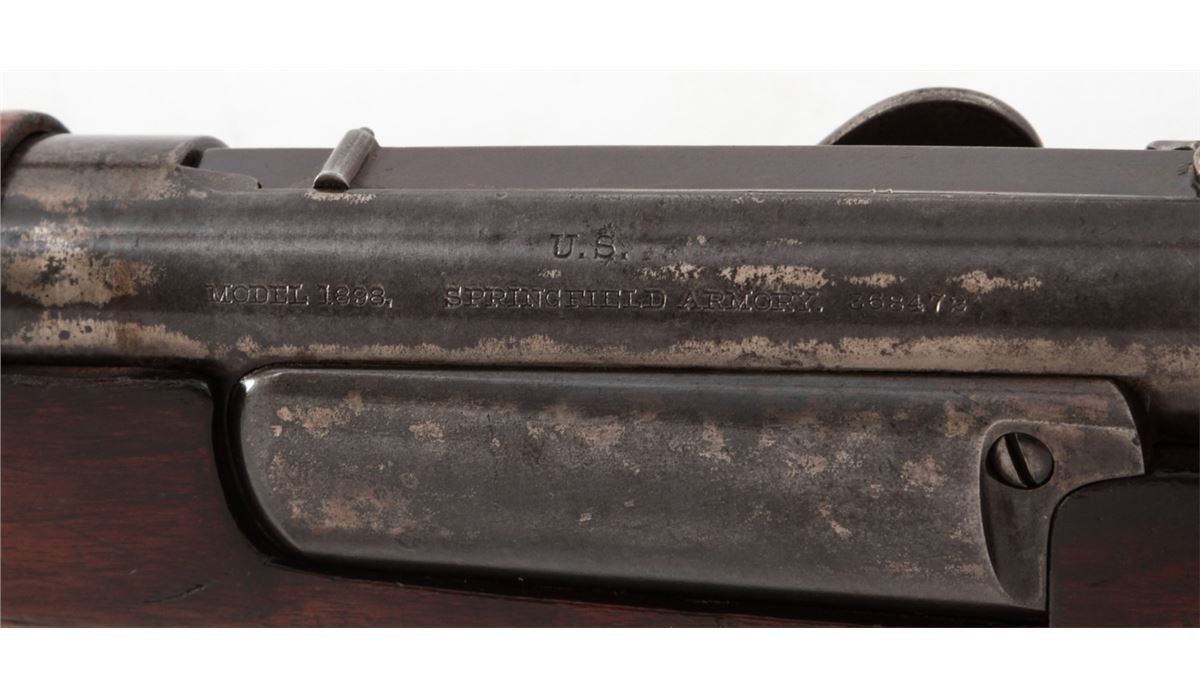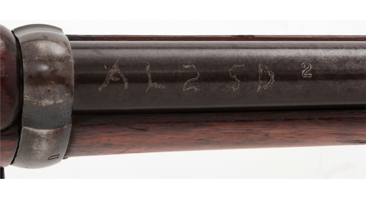 Krag Model 1898 Bolt Action Rifle, #368472, .30-40 cal., 30'' barrel, blue and case hardened finish, walnut stock. Condition is very good retaining approx. 80% blue. Top of barrel with additional numbers lightly scratched ''AL2SD''. Stock with crack emanating just forward of magazine cover; upper handguard with similar distress along upper left side. Stock with light scuffs and scratches. Action is good, bore is very good. Est.: $500-$750. (C&R)