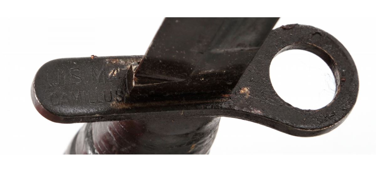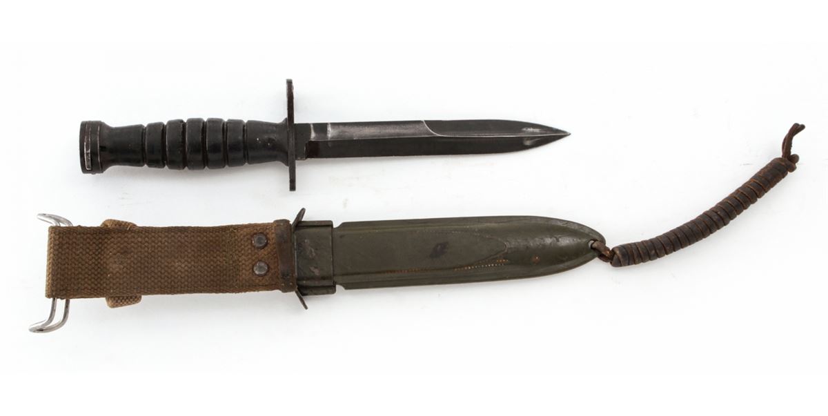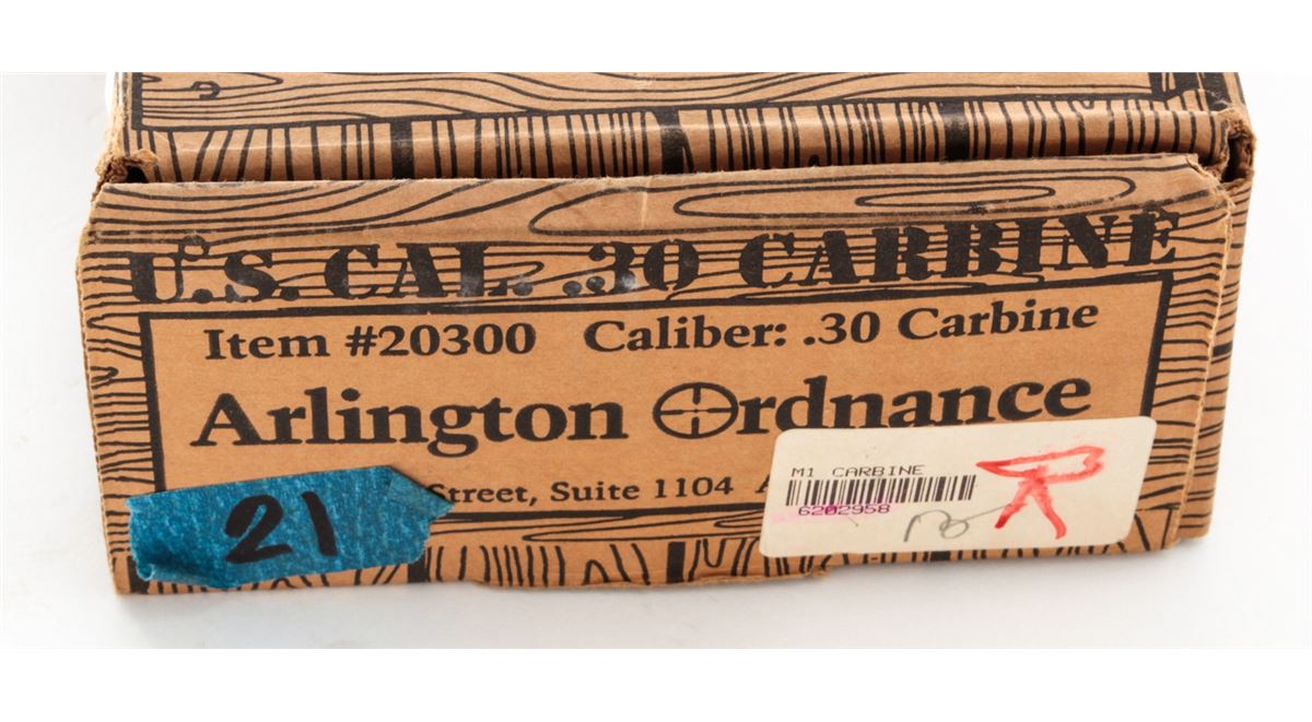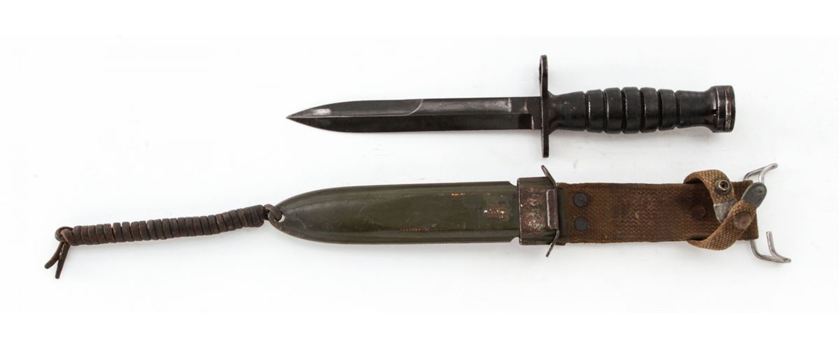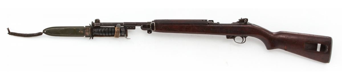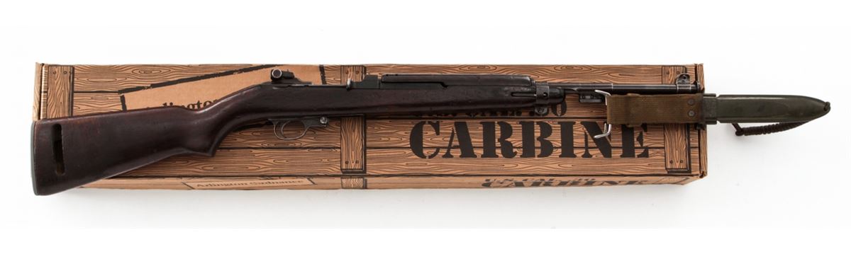 U.S. M1 Carbine, by Rock-ola, #6202958, .30 M1 Carb. cal., 18'' Rock-ola marked barrel, parkerized finish, cartouched walnut stock, with M4 bayonet by Camillus in period fiberglass scabbard. Typical of those imported in the 1980s. Condition is very good. Metal surfaces retain approx. 92% thinning and toning original finish. Stock with moderate to heavy scuffs, scratches and oil darkening. Action is good, bore is bright. Very lightly import marked to bottom of barrel near muzzle. In 1980s Arlington Ordnance box. Est.: $300-$500. (C&R)