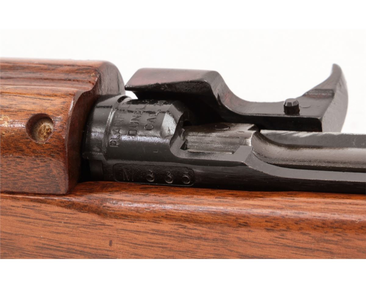 Plainfield M1 Semi-Automatic Carbine, #M835, .30 Carb. cal., 18'' barrel, matte finish, dark stained mahogany stock, with some surplus parts including triggerguard and bolt, and one WWII era 15-round magazine. Condition is very good showing moderate use, but retaining approx. 90% blue. Stock with scuffs and scratches. Good action, bright bore. Est.: $200-$400. (C&R) (High-cap mags not available to Calif. residents.)