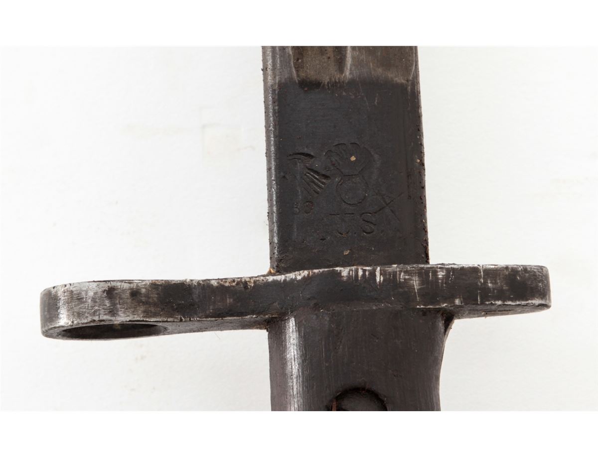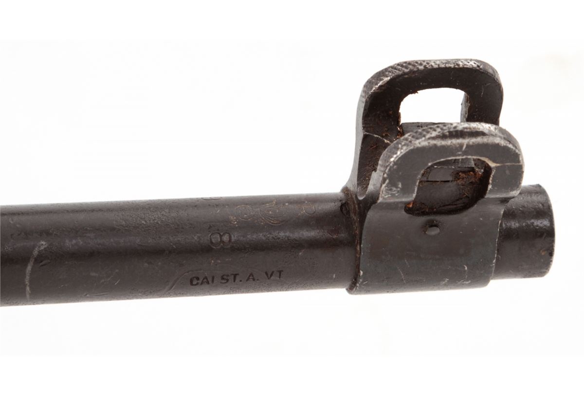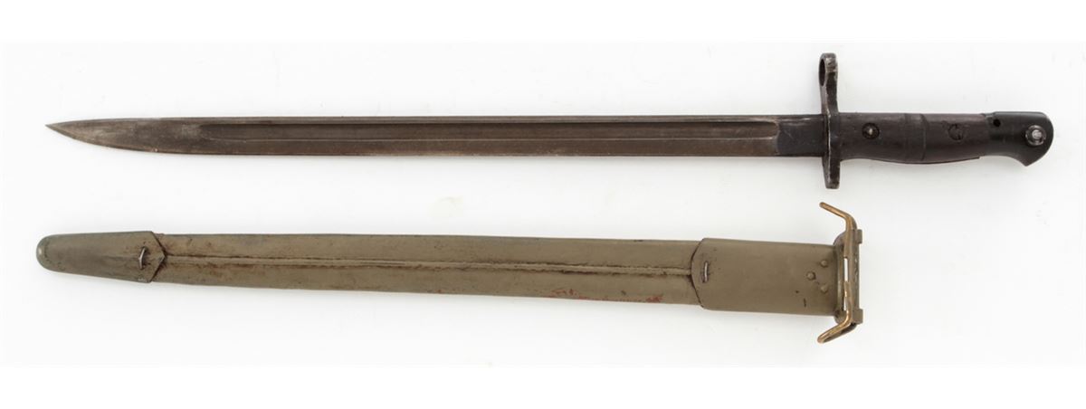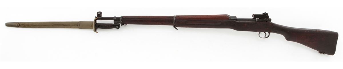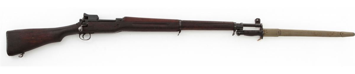U.S. P17 Bolt Action Rifle, by Remington, with bayonet, #594423, .30-06 cal., 26'' barrel, arsenal blue finish, fingergroove walnut stock and upper handguard. U.S. 1917 bayonet by Remington is included. Condition is very good as arsenal rebuilt and imported in the 1980s, retaining approx. 95% thinning matte blue. Stock with considerable oil darkening, nicks and scratches. Good action, fine bore. Lightly import marked at end of barrel. Est.: $250-$450. (C&R)