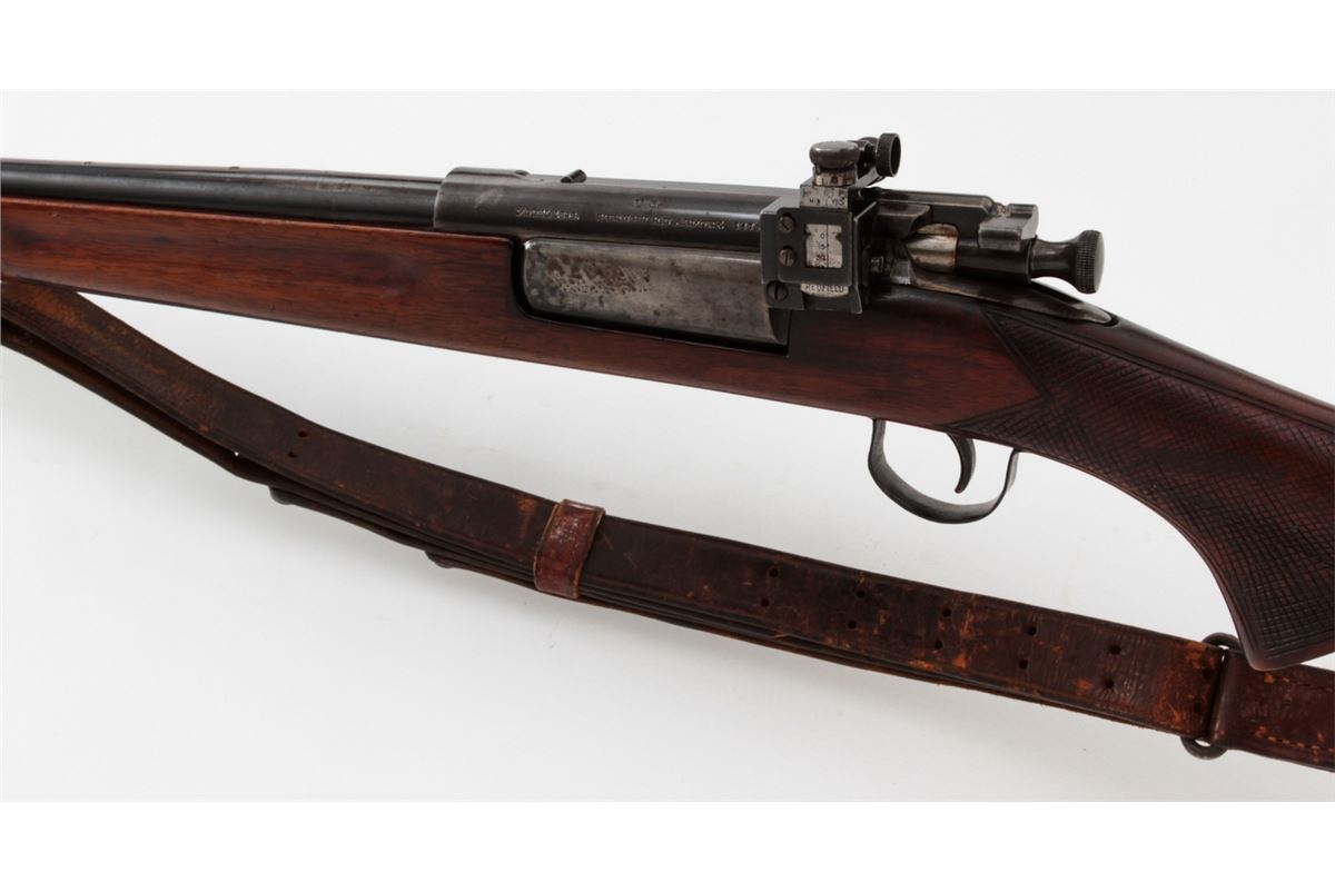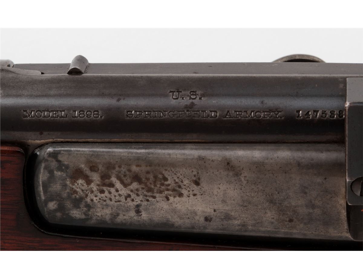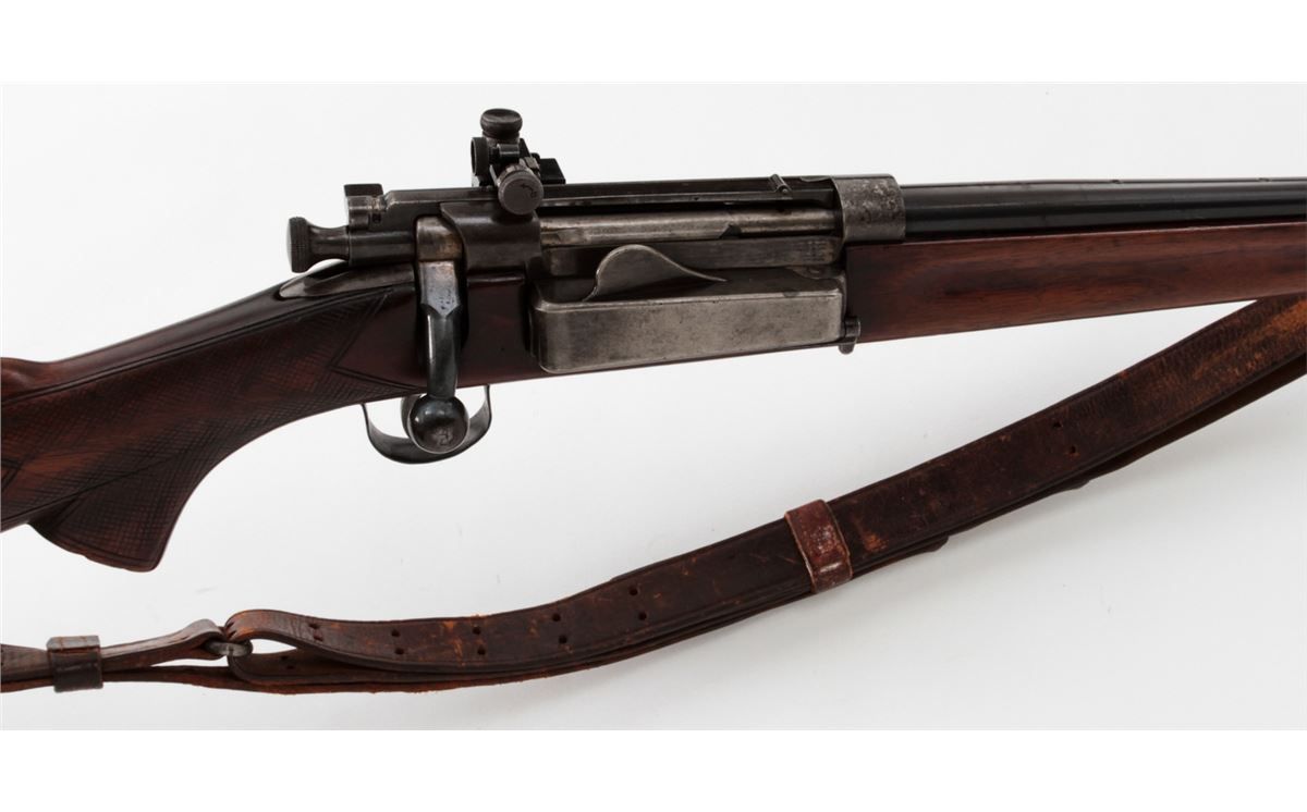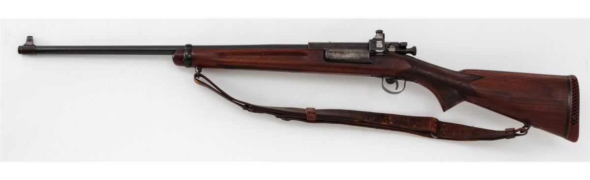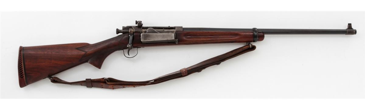 Sporterized Krag Model 1898 Bolt Action Carbine, #147538, .30-40 cal., 22'' barrel, blue finish, hobbyist checkered pistol-grip walnut stock, with stamped triggerguard and early Pachmayr red rubber butt pad, as well as added Redfield rear sight. With WWII era M1907 sling. Condition is good as modified retaining approx. 85% blue. Stock with moderate scuffs and even wear. Good action, very good bore. Est.: $250-$400. (C&R)