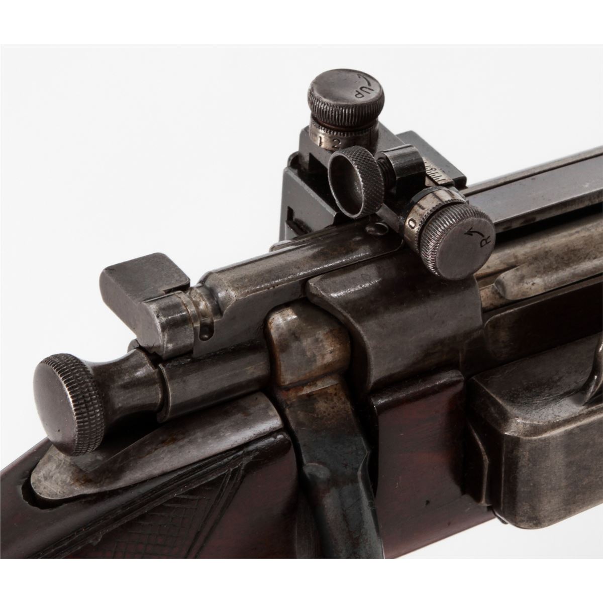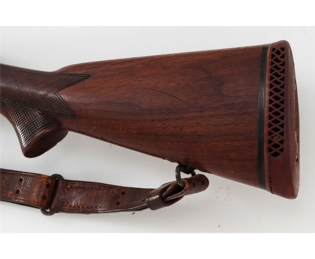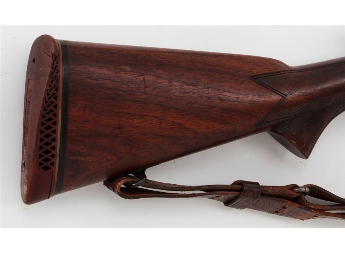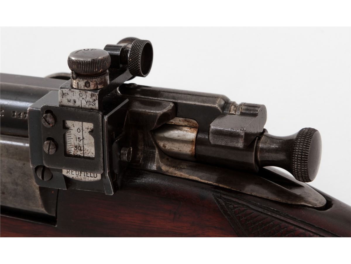 Sporterized Krag Model 1898 Bolt Action Carbine, #147538, .30-40 cal., 22'' barrel, blue finish, hobbyist checkered pistol-grip walnut stock, with stamped triggerguard and early Pachmayr red rubber butt pad, as well as added Redfield rear sight. With WWII era M1907 sling. Condition is good as modified retaining approx. 85% blue. Stock with moderate scuffs and even wear. Good action, very good bore. Est.: $250-$400. (C&R)
