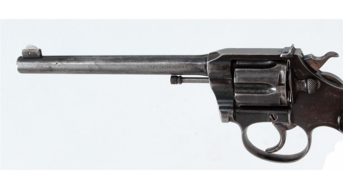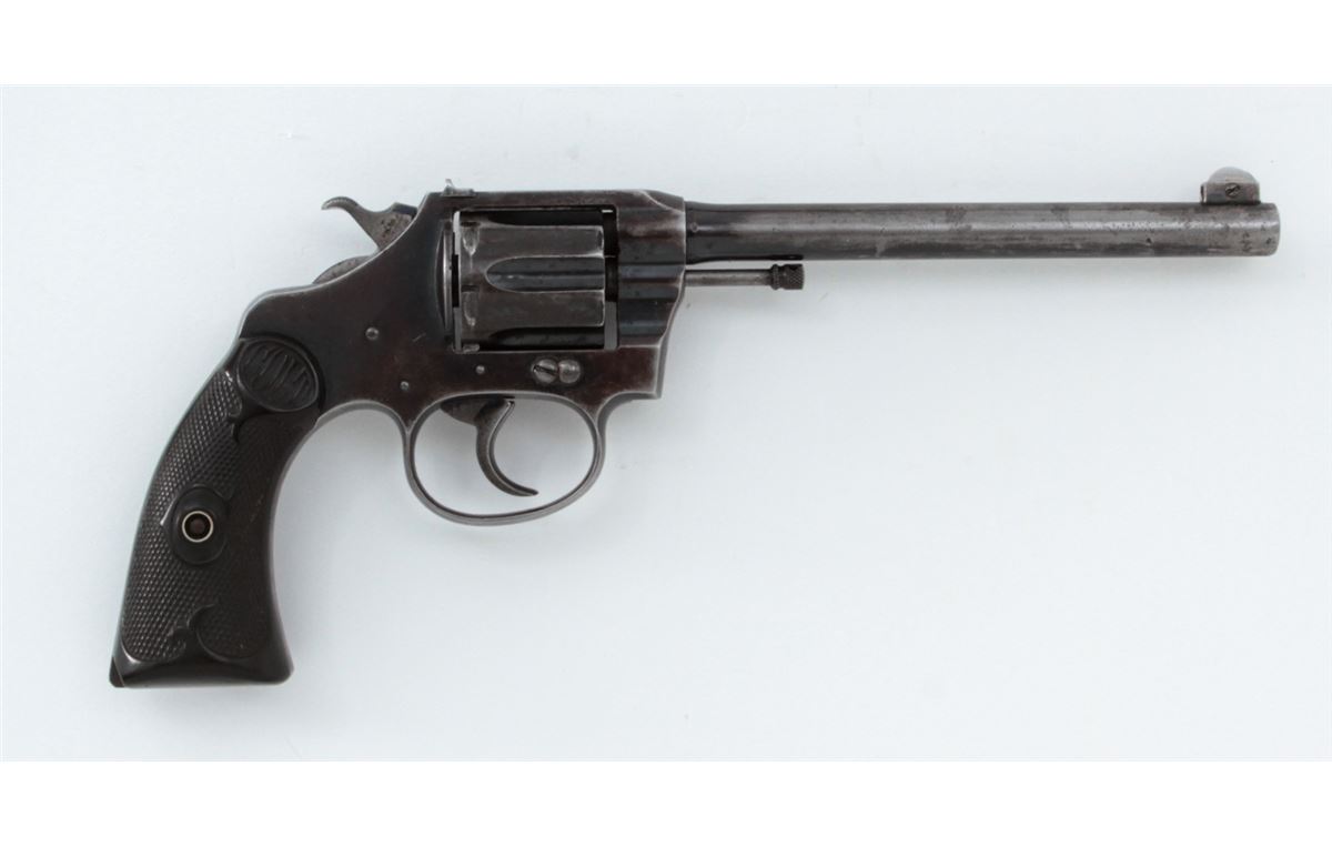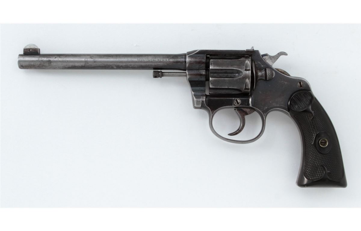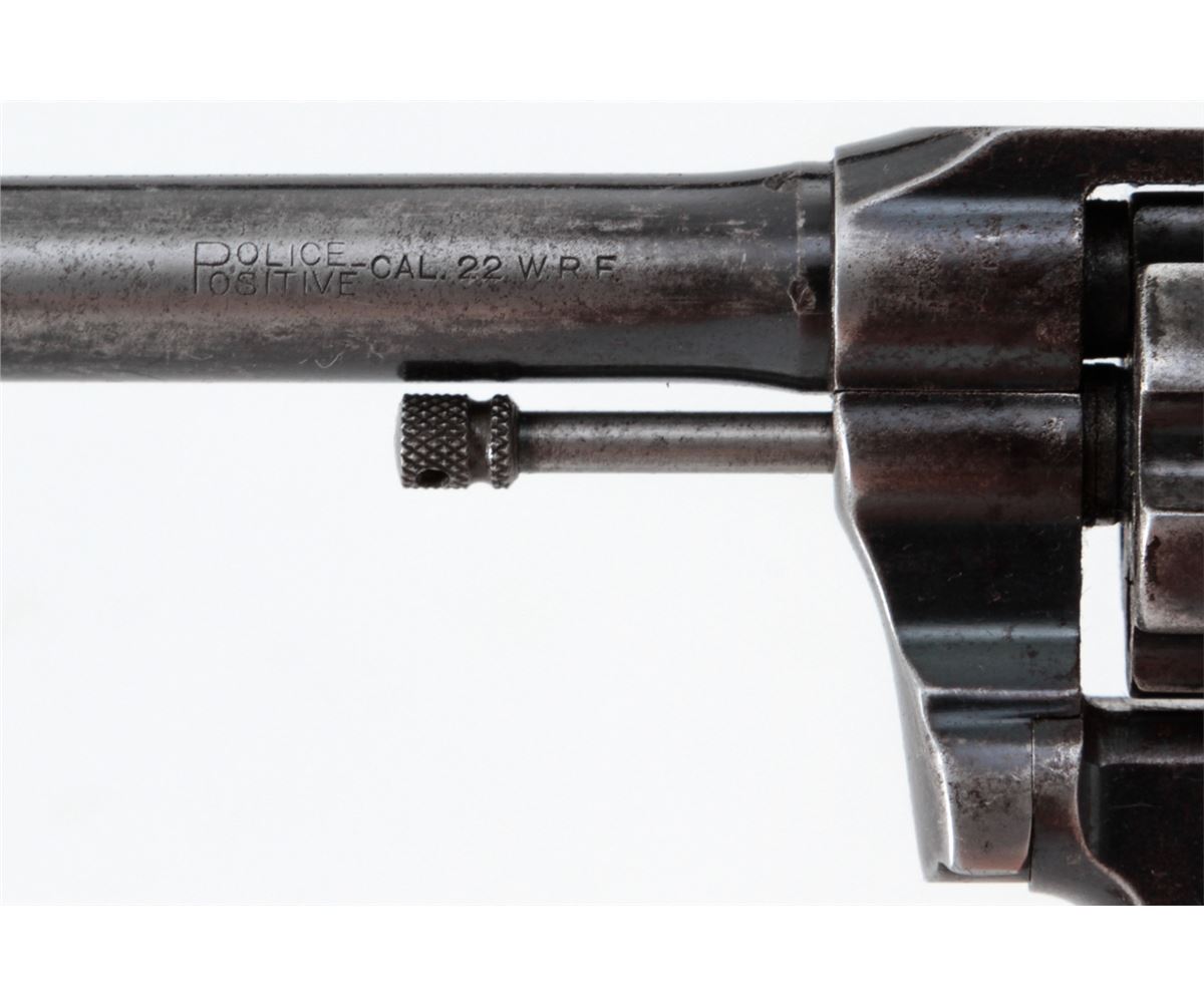 Colt Police Positive Flat-Top Double Action Revolver, #3195, .22 WRF cal., 6'' barrel, high polish blue finish, factory checkered hard rubber grips. Mfg'd approx. 1910, first year of production. Condition is about very good retaining approx. 50%-60% blue with most of the losses to barrel. Right grip panel with loss at heel. Original front sight blade has been replaced by one made from a silver coin. Action remains crisp, bore is fine. Est.: $250-$450. (C&R)