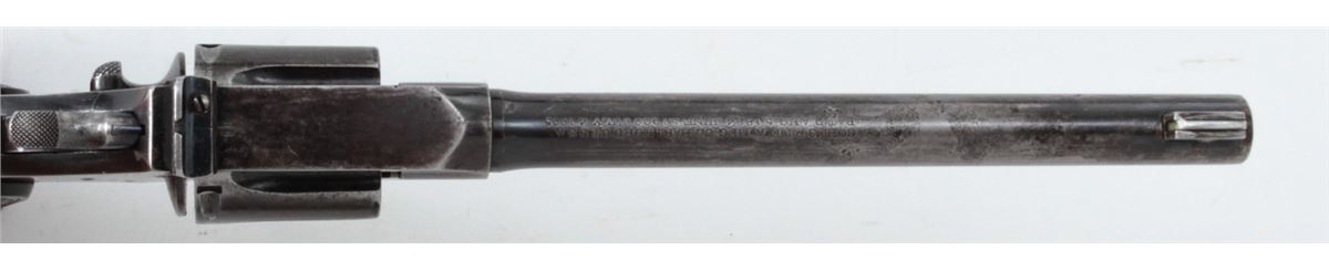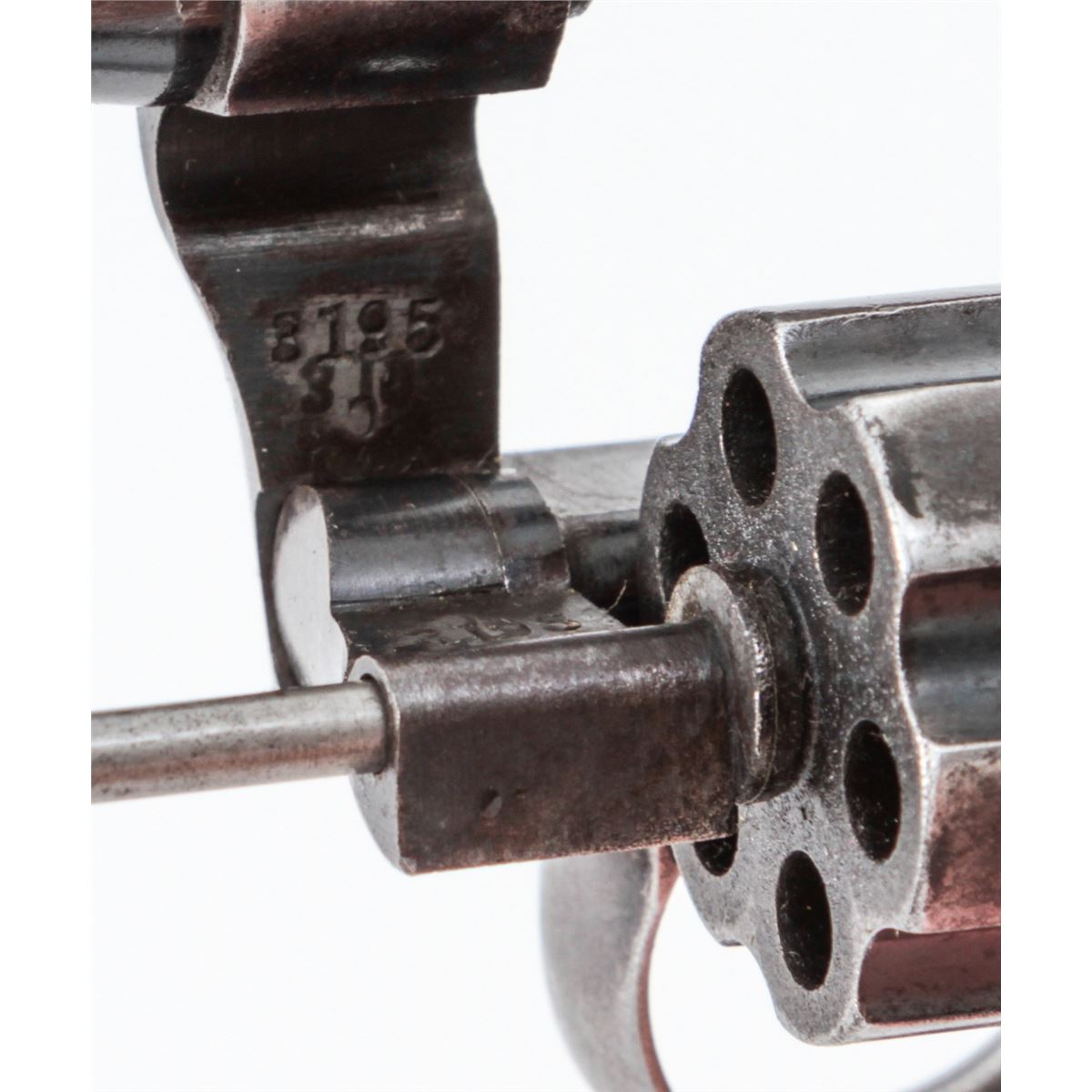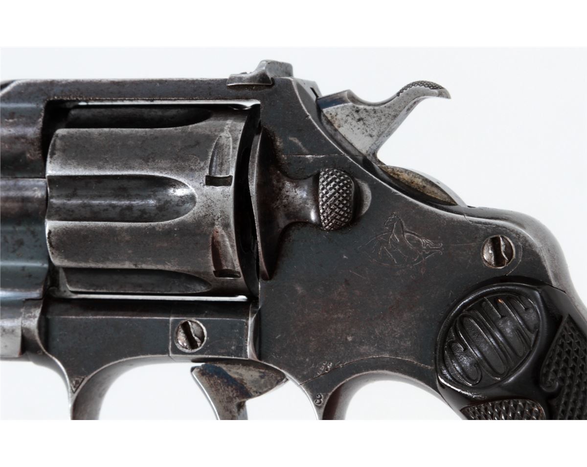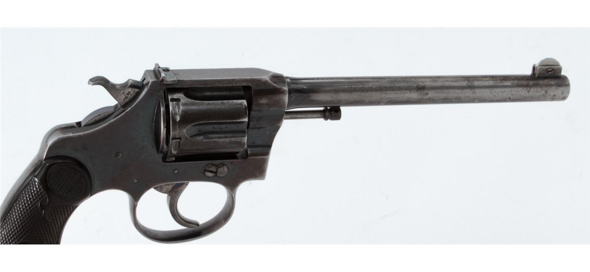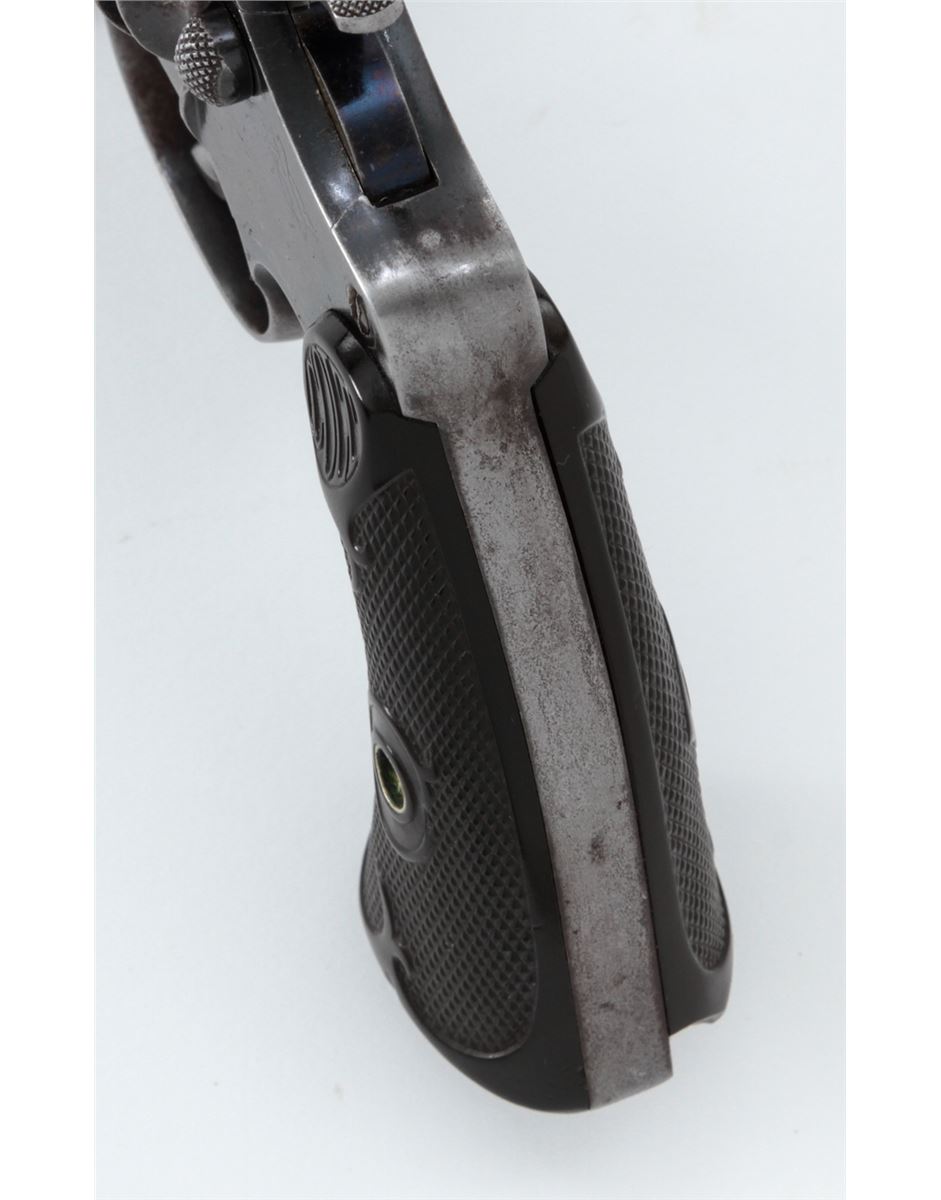 Colt Police Positive Flat-Top Double Action Revolver, #3195, .22 WRF cal., 6'' barrel, high polish blue finish, factory checkered hard rubber grips. Mfg'd approx. 1910, first year of production. Condition is about very good retaining approx. 50%-60% blue with most of the losses to barrel. Right grip panel with loss at heel. Original front sight blade has been replaced by one made from a silver coin. Action remains crisp, bore is fine. Est.: $250-$450. (C&R)