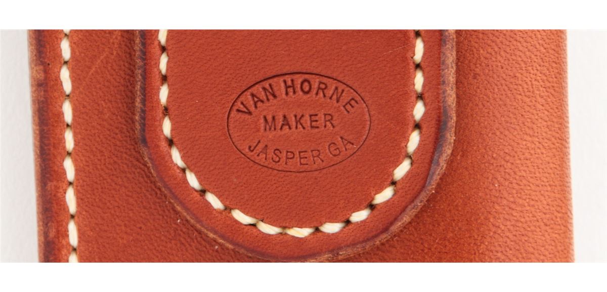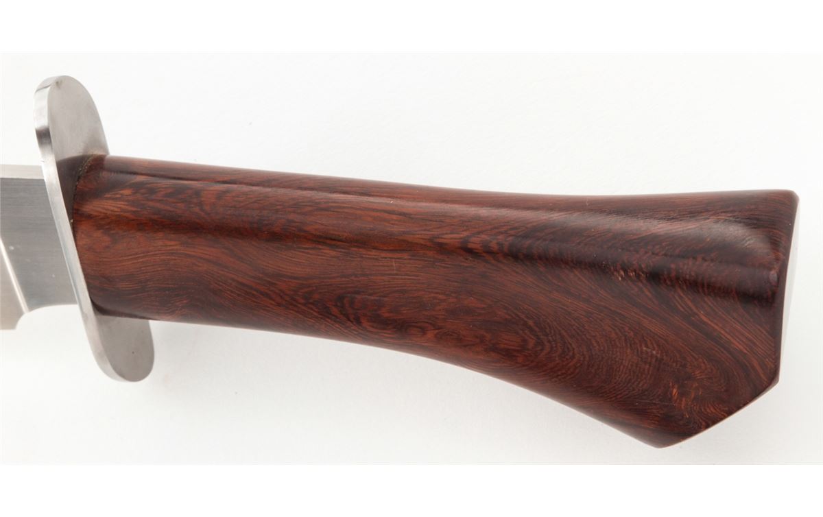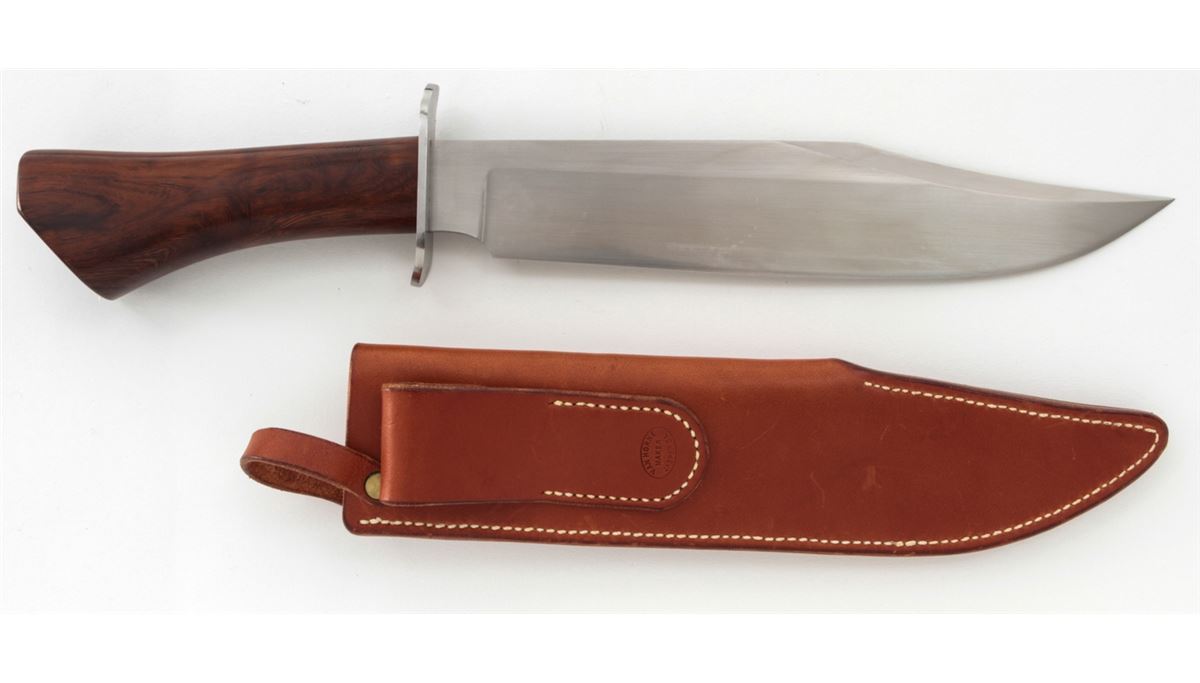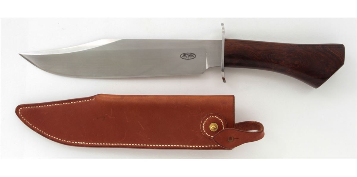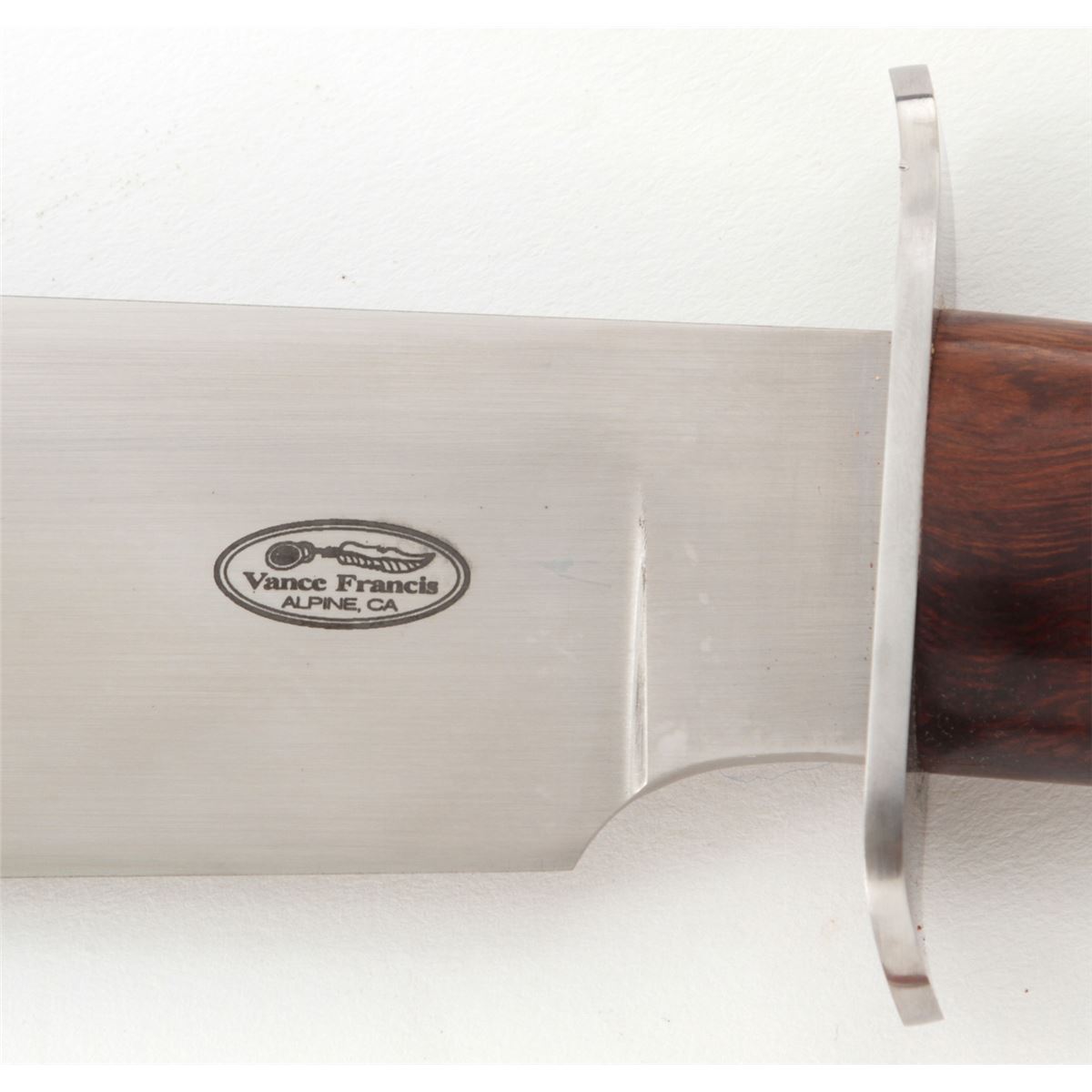 Large Custom Bowie Knife, by Vance Francis, 10-1/2'' blade marked with the ''Vance Francis/ALPINE, CA'' logo; 16'' overall length, stainless steel full guard, desert ironwood handle, in leather sheath by Van Horne, Jasper GA. Condition is excellent showing no use. The knife with very few overall light marks from handling. The sheath with light scuffs and scratches with tight stitching and seams. Est.: $300-$500. (Ian Shein estate)