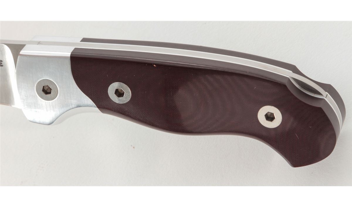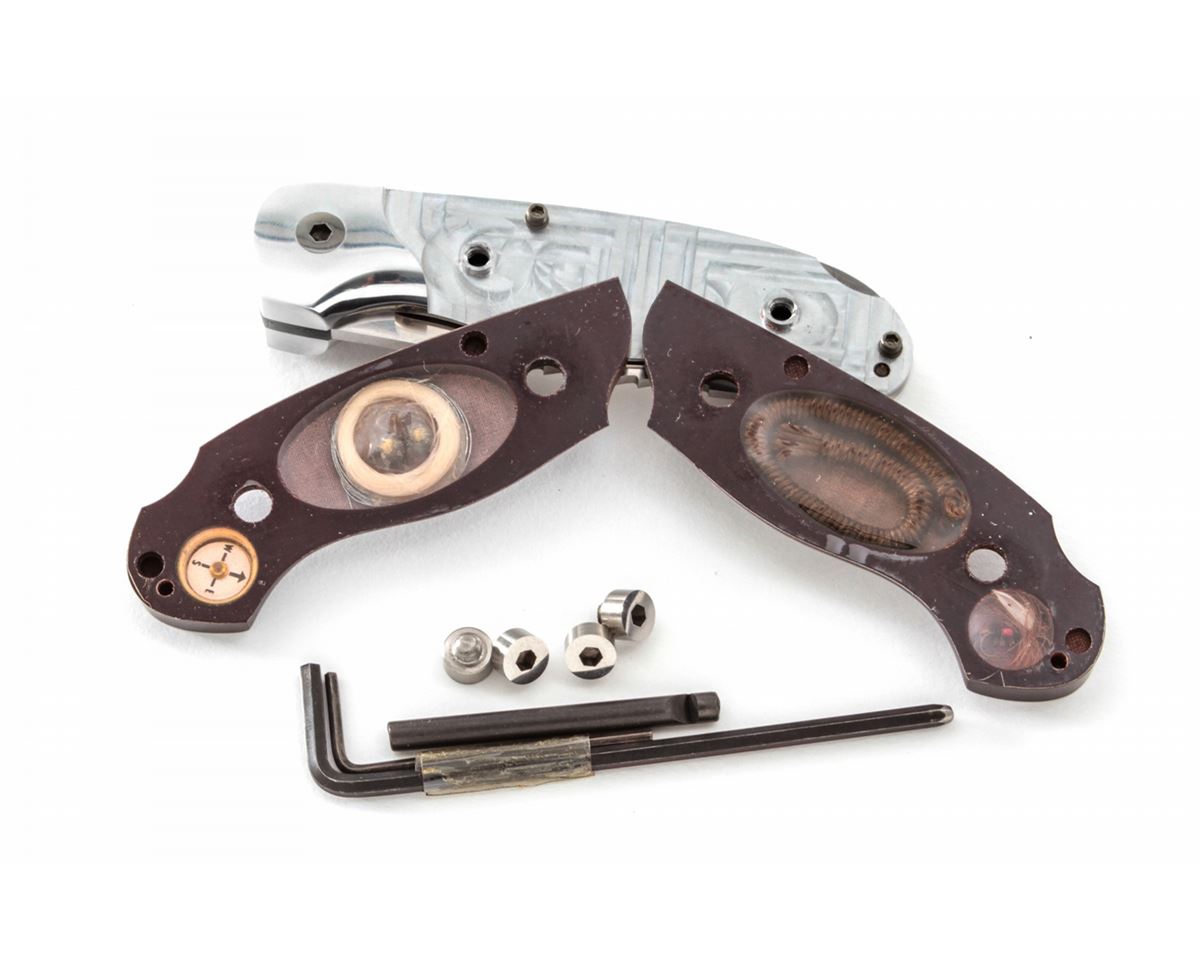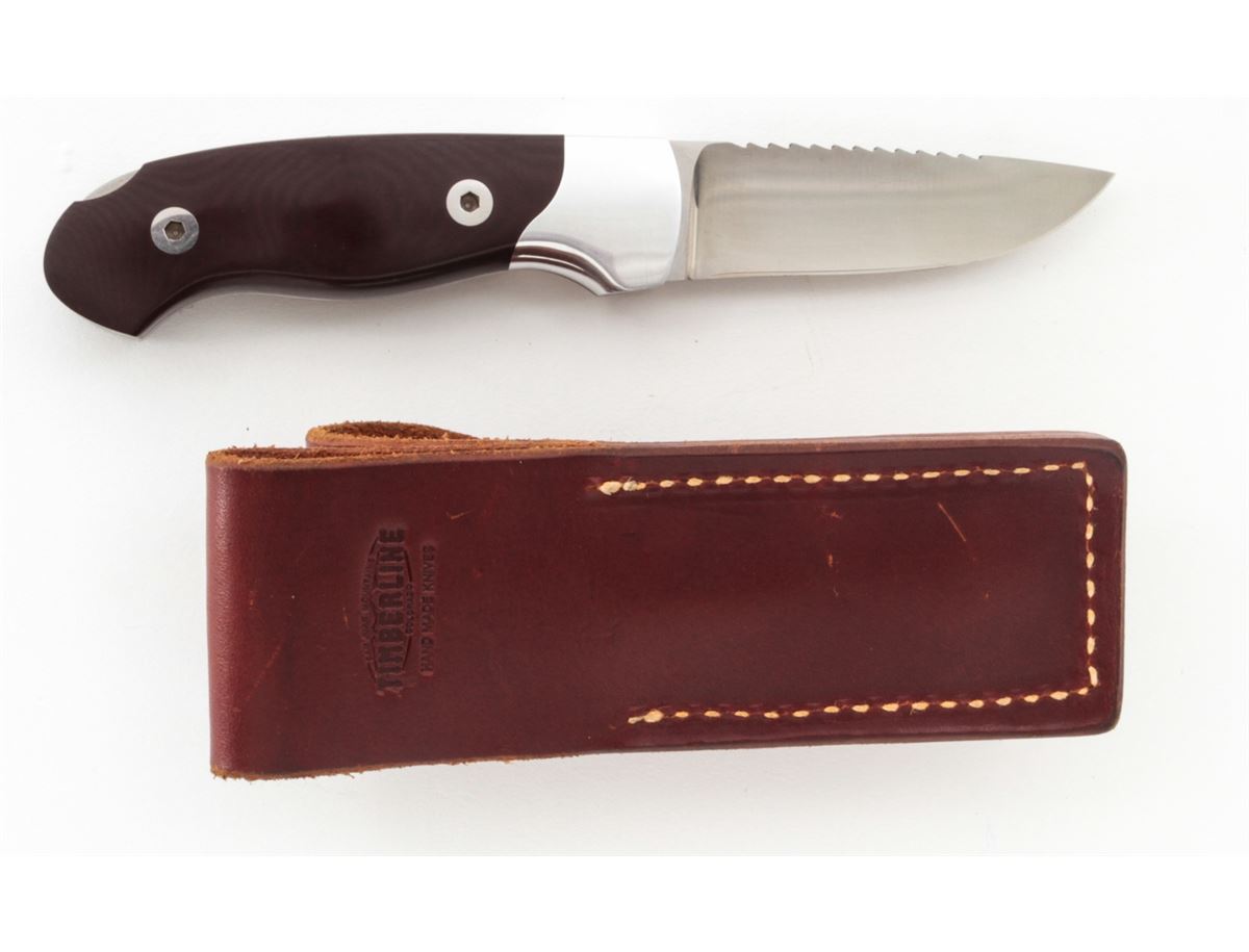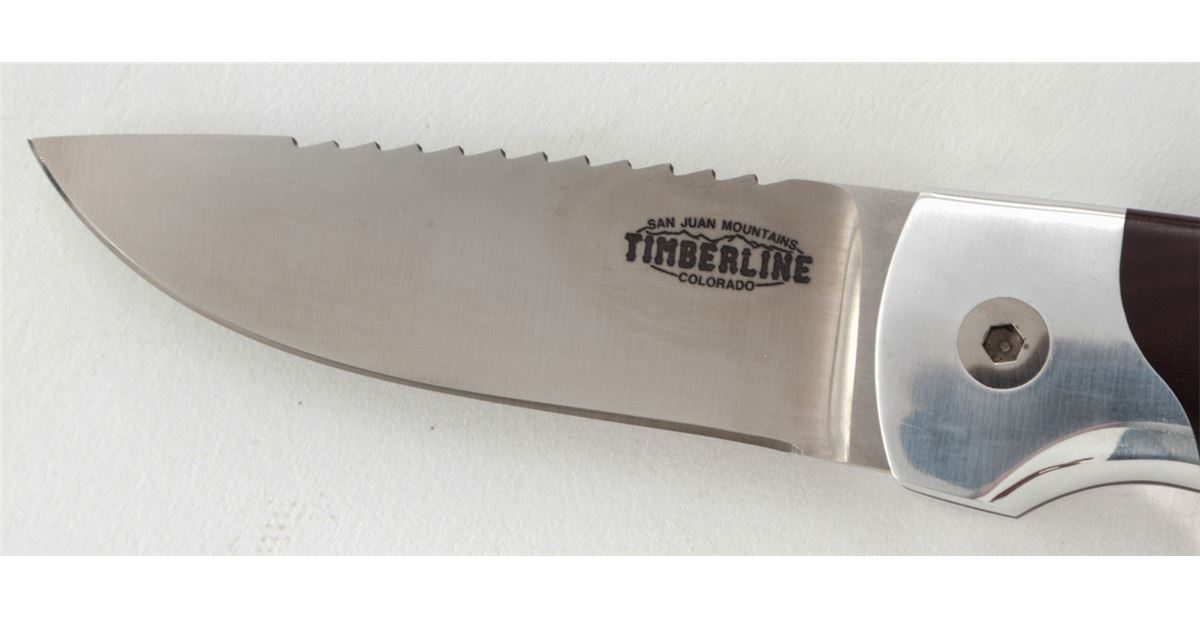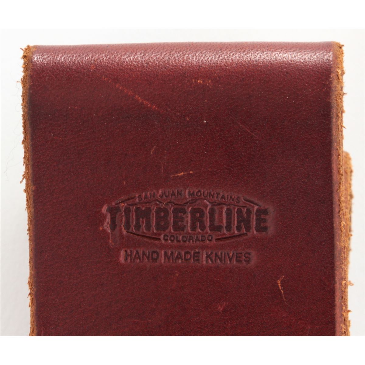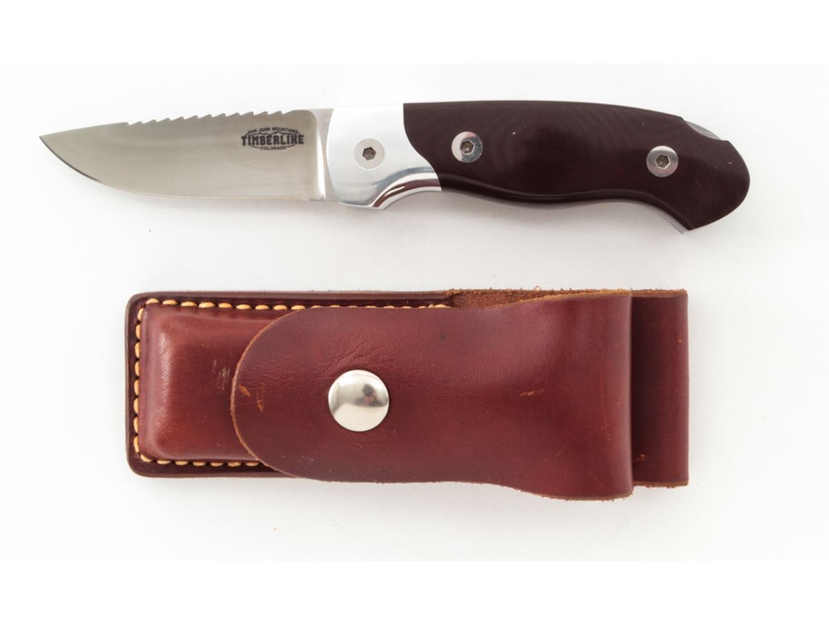 Scarce Vintage Timberline Lock Back Folding Survival Knife, 3-1/8'' sawback blade marked with the classic ''San Juan Mountains, Colorado'' logo; 4-1/4'' overall closed length, maroon micarta scales that can be removed to reveal several water tight compartments on the backside. The original water tight film is still sealed and contains several survival items including a compass, fishing line, hooks and weights, etc. Also included is the original leather ''Timberline'' stamped sheath, flint, and Allen wrenchs for removing the handle. Condition is excellent appearing near new showing no use, with overall light marks from handling. Sheath shows light scuffs and scratches. These original Timberline knives are becoming harder to find. Est.: $350-$550. (Ian Shein estate)