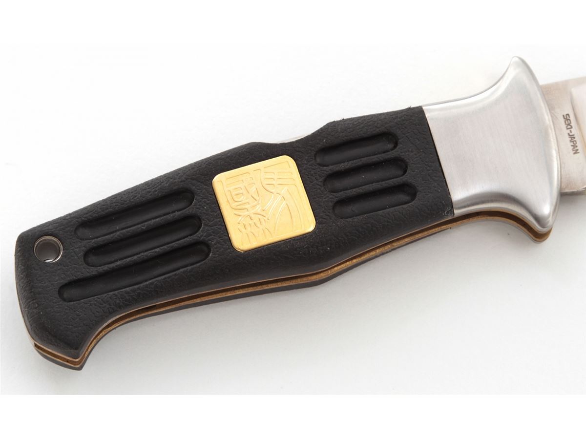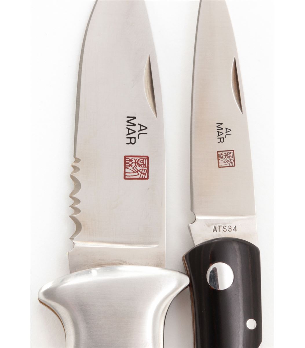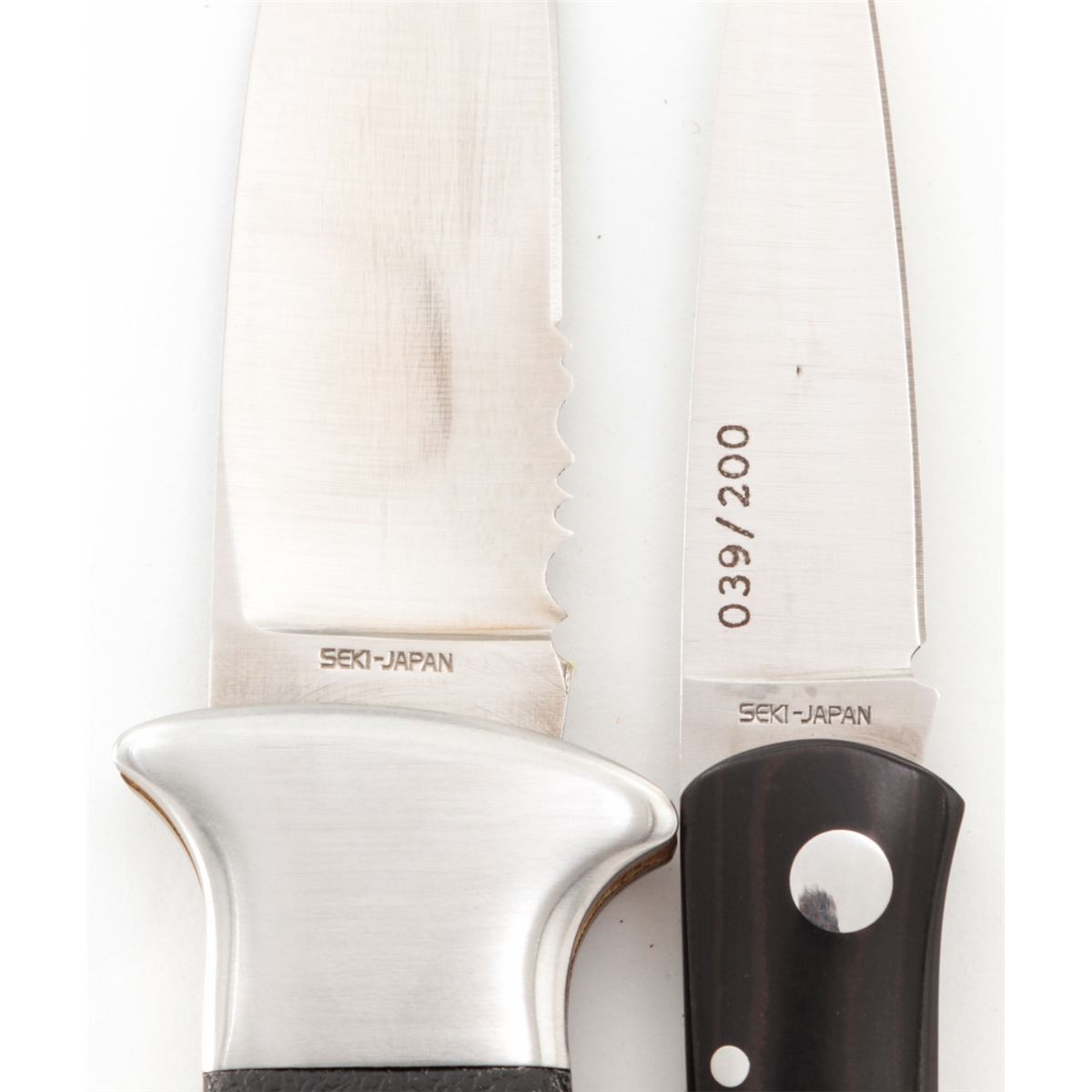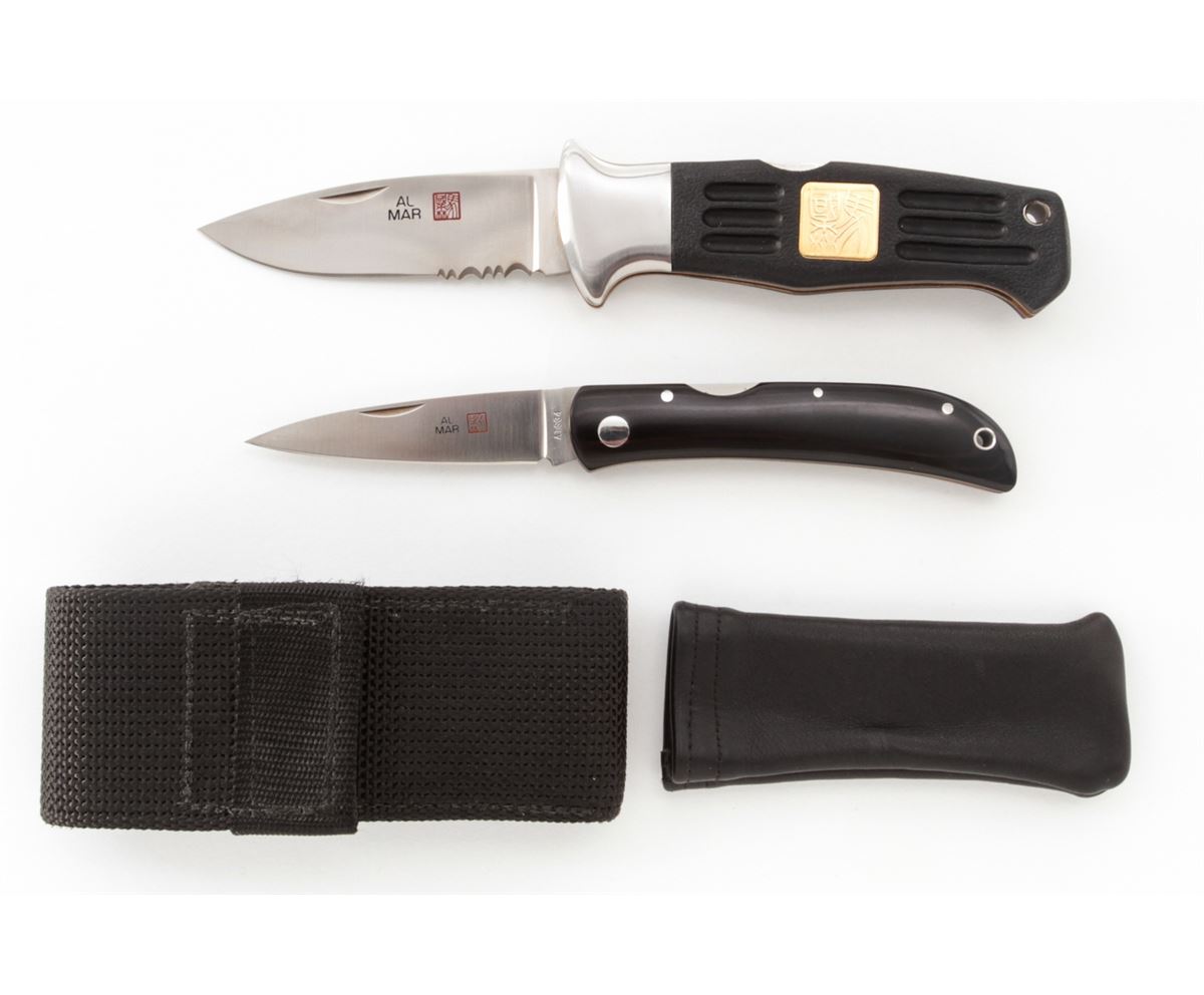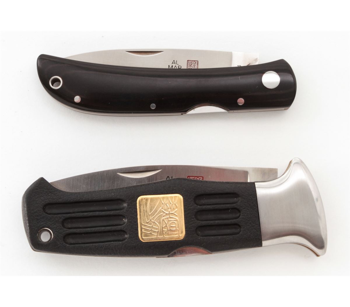 Lot of Two (2) Al Mar Folding Knives: 1.) Vintage Al Mar Seki Japan ''Sere'' lock back folding knife, 3-3/8'' partially serrated blade, 4-1/2'' overall closed length, textured hard rubber scales with inlaid ''Al Mar'' square medallions, brass liners, in nylon cordura sheath. 2.) Al Mar Seki Japan limited edition #39 of 200 lock back folding knife, 2-7/8'' blade, 4'' overall closed length, black/dark brown scales, with nickel silvers pins and wrist thong ferrule. Condition to both is excellent showing no use. The limited edition knife with moderate amounts of overall light marks from handling and toning to brass liners. Est.: $225-$350/lot. (Ian Shein estate)